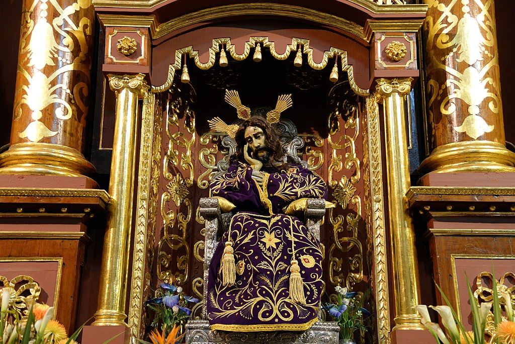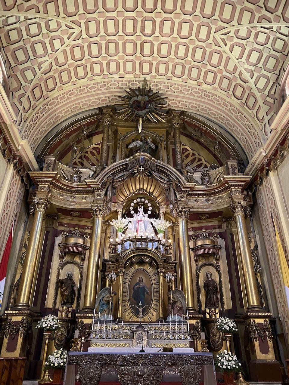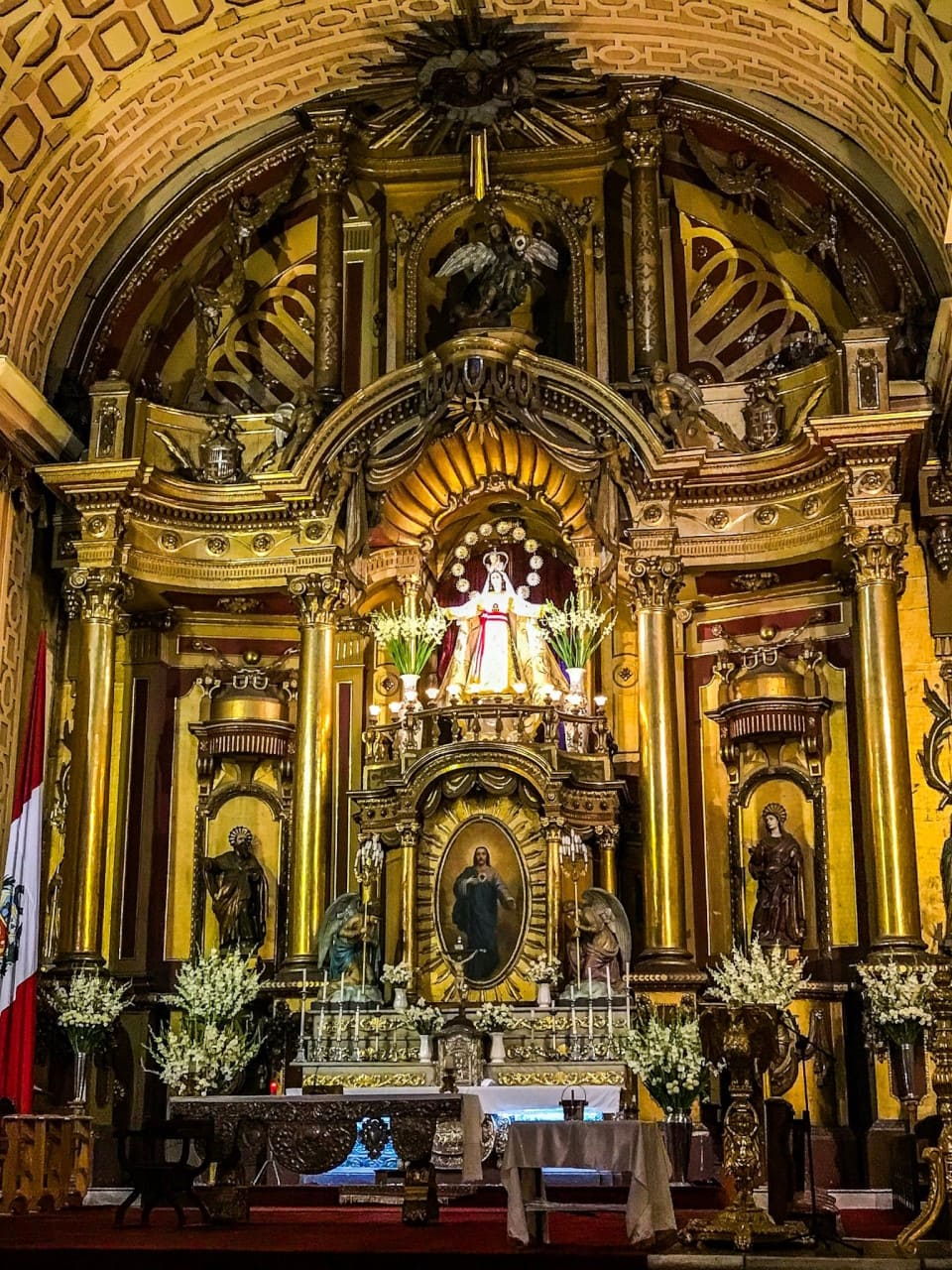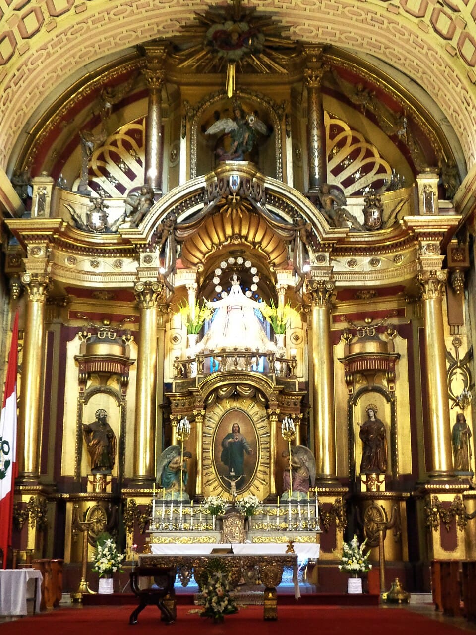 En el centro del altar destaca la imagen de Nuestra Señora de la Merced, profundamente venerada por la población limeña desde el periodo colonial.