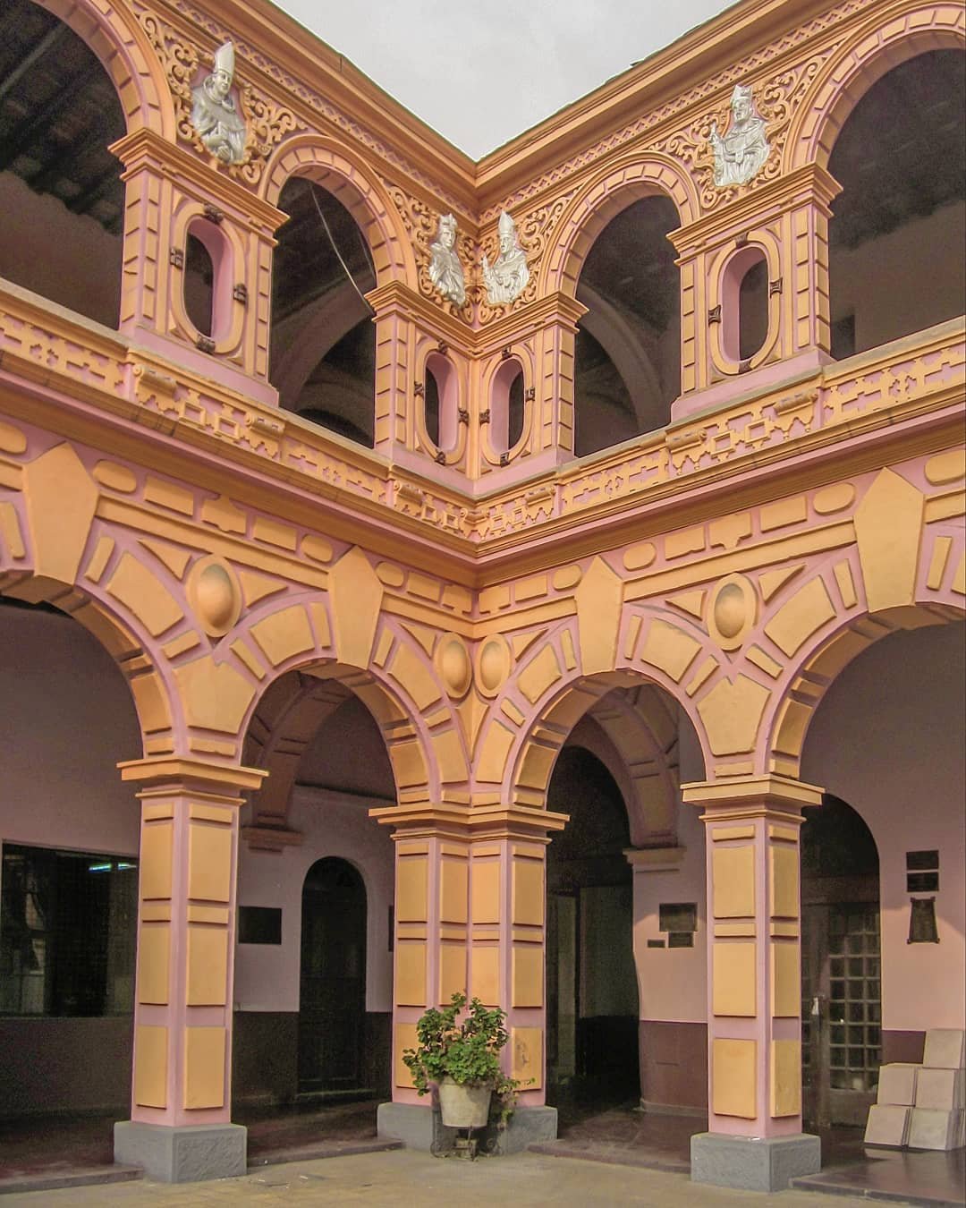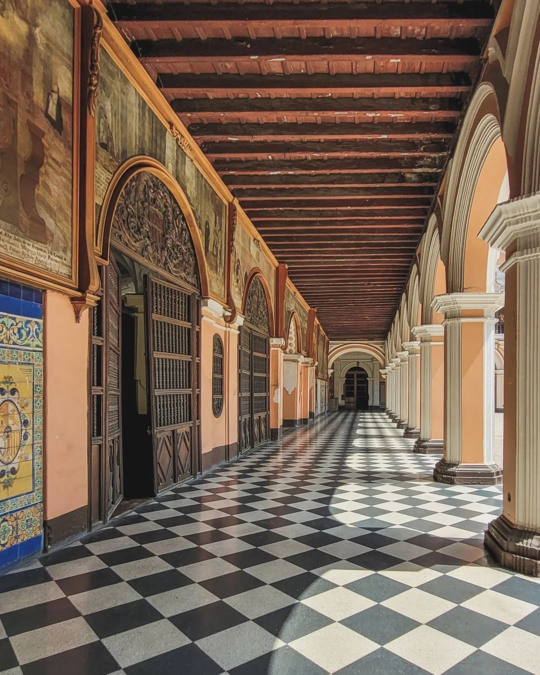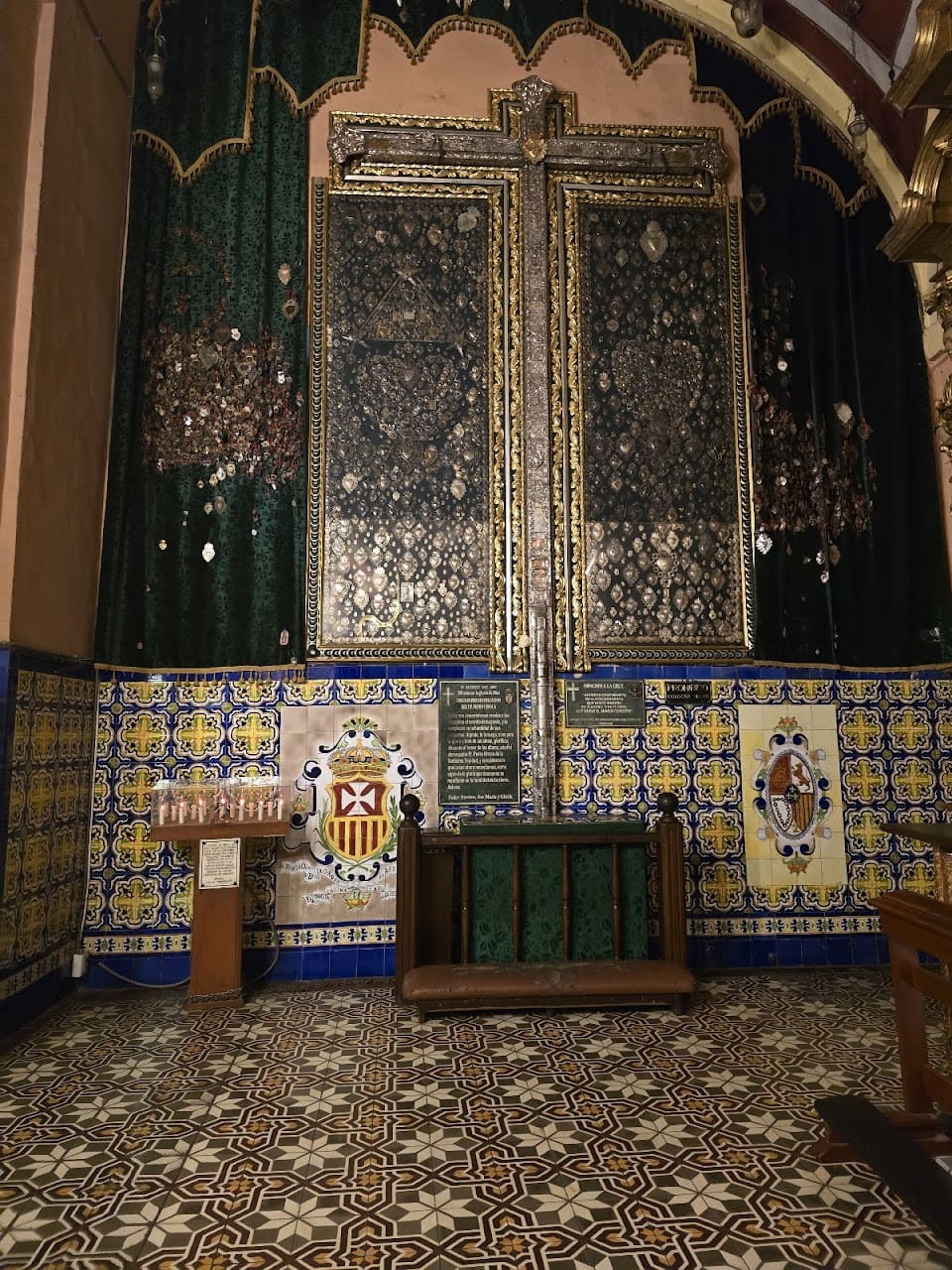 claustro principal con altares en las esquinas y azulejos decorativos;