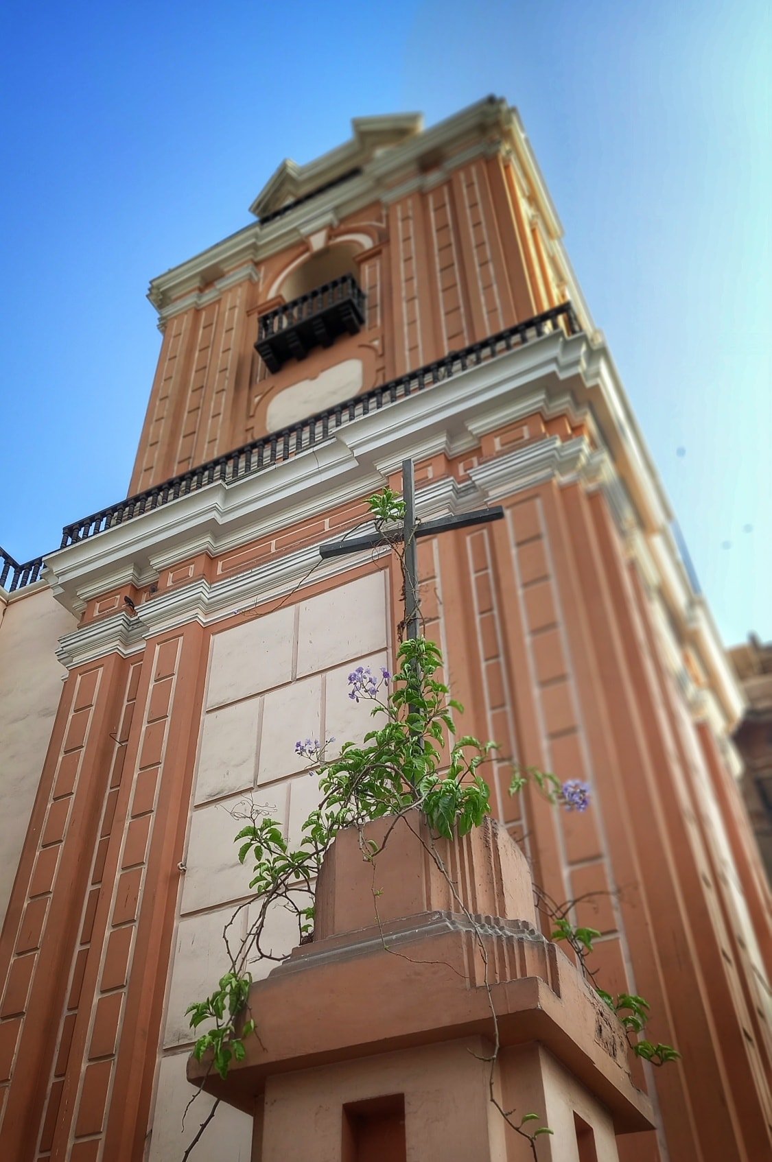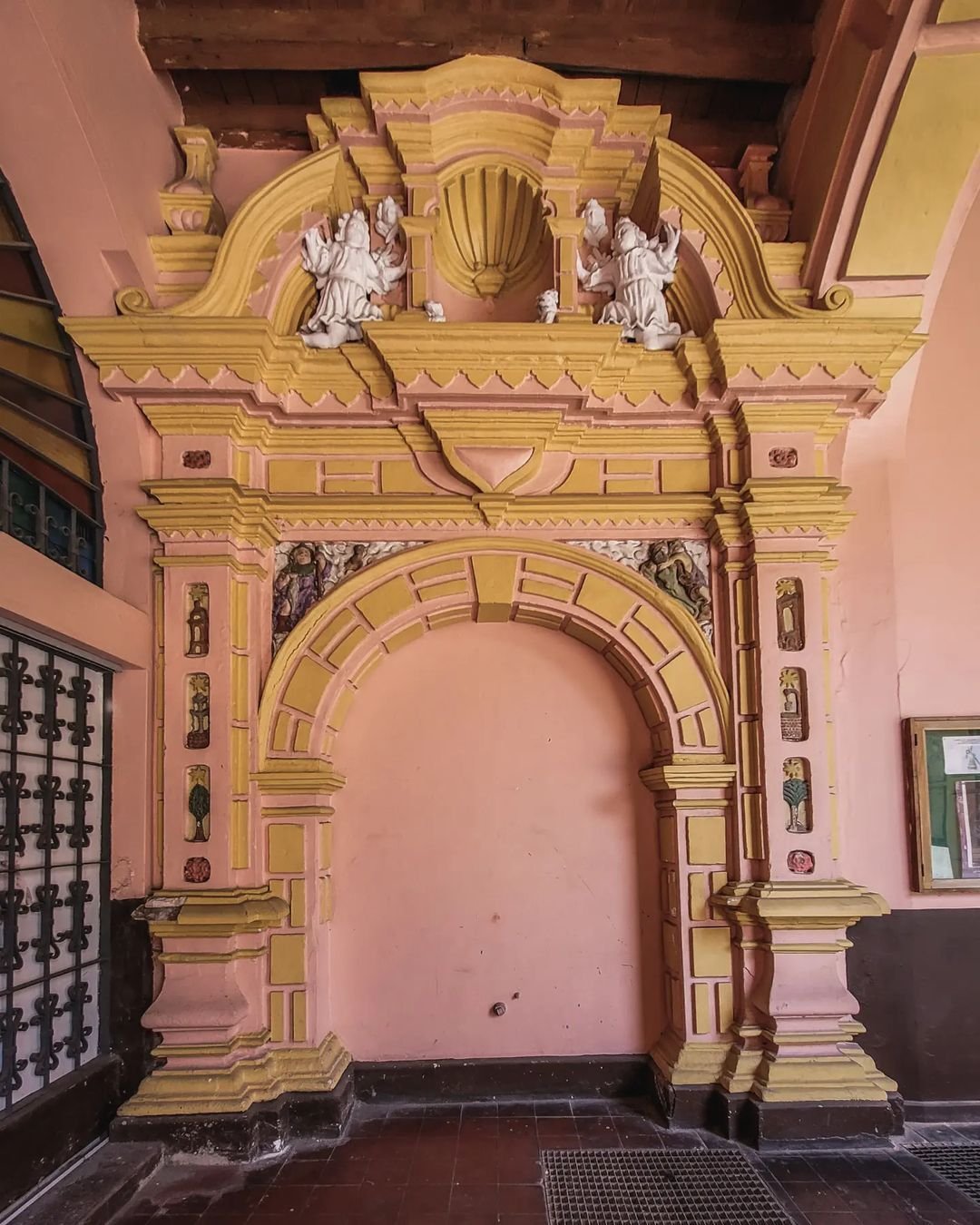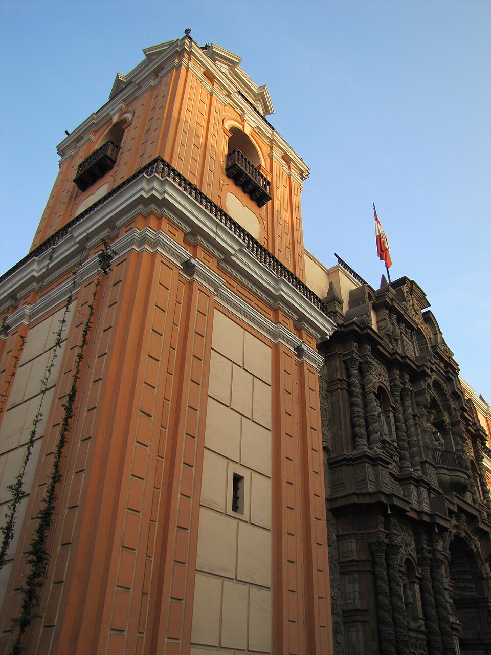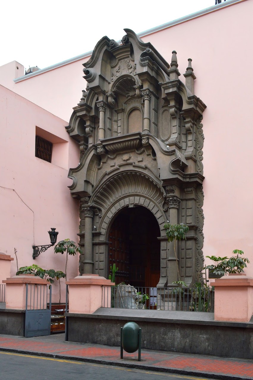 La fachada fue reconstruida tras el terremoto de 1746 y presenta una combinación única de piedras grises y rosadas que no se repite en otros templos de Lima.