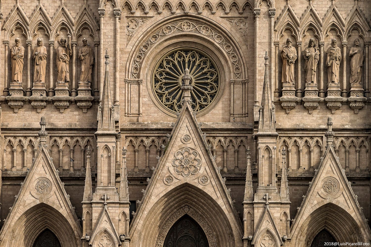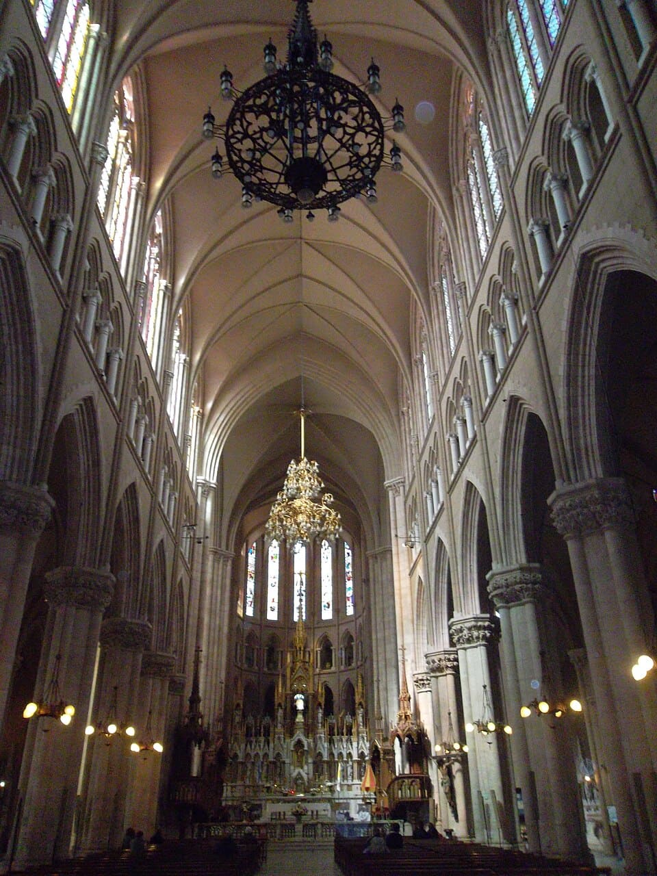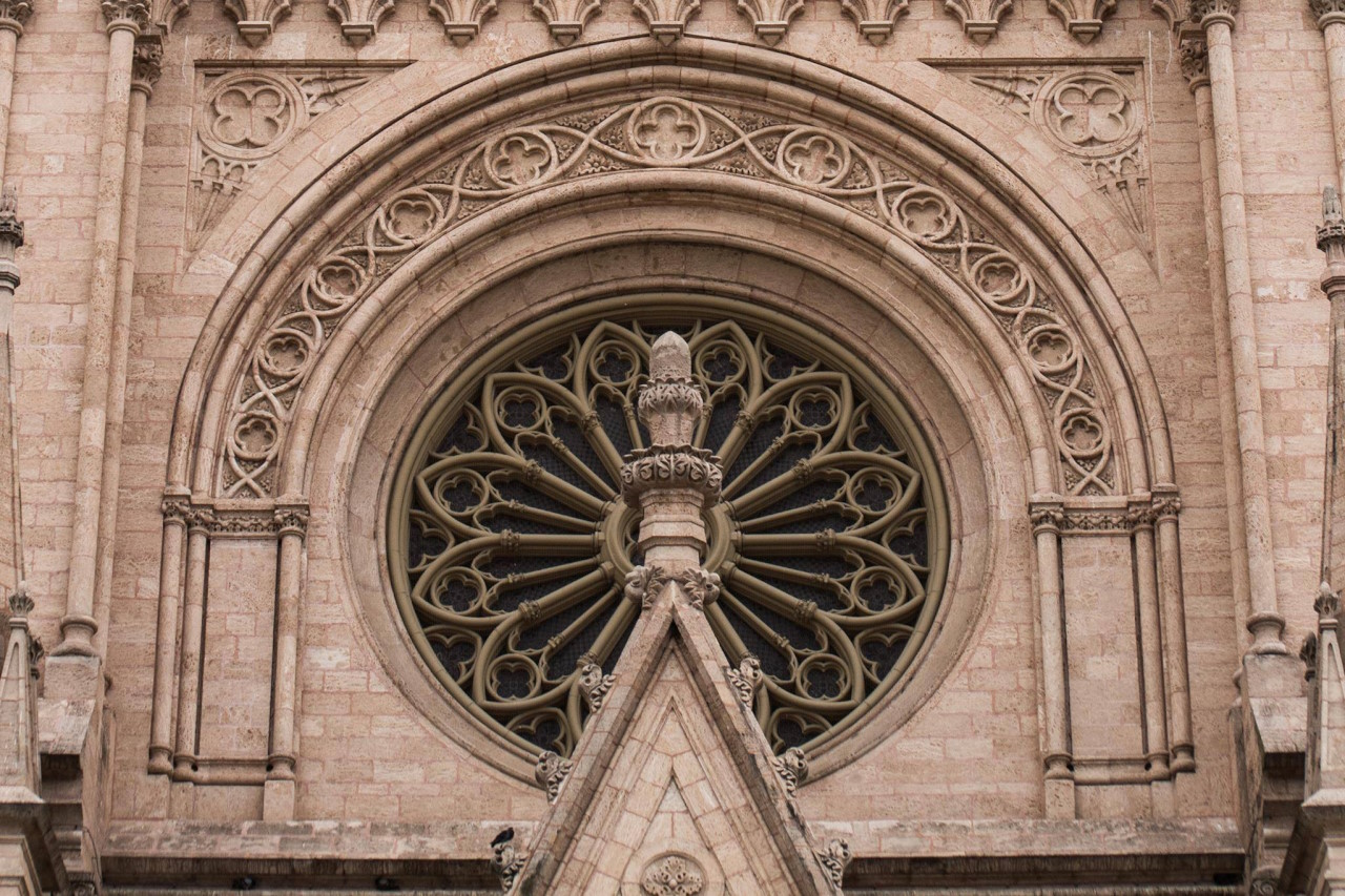Sus torres de más de 100 metros, los pináculos, arbotantes, vitrales, rosetones, contrafuertes y la verticalidad general del conjunto la vinculan directamente con la tradición gótica francesa.