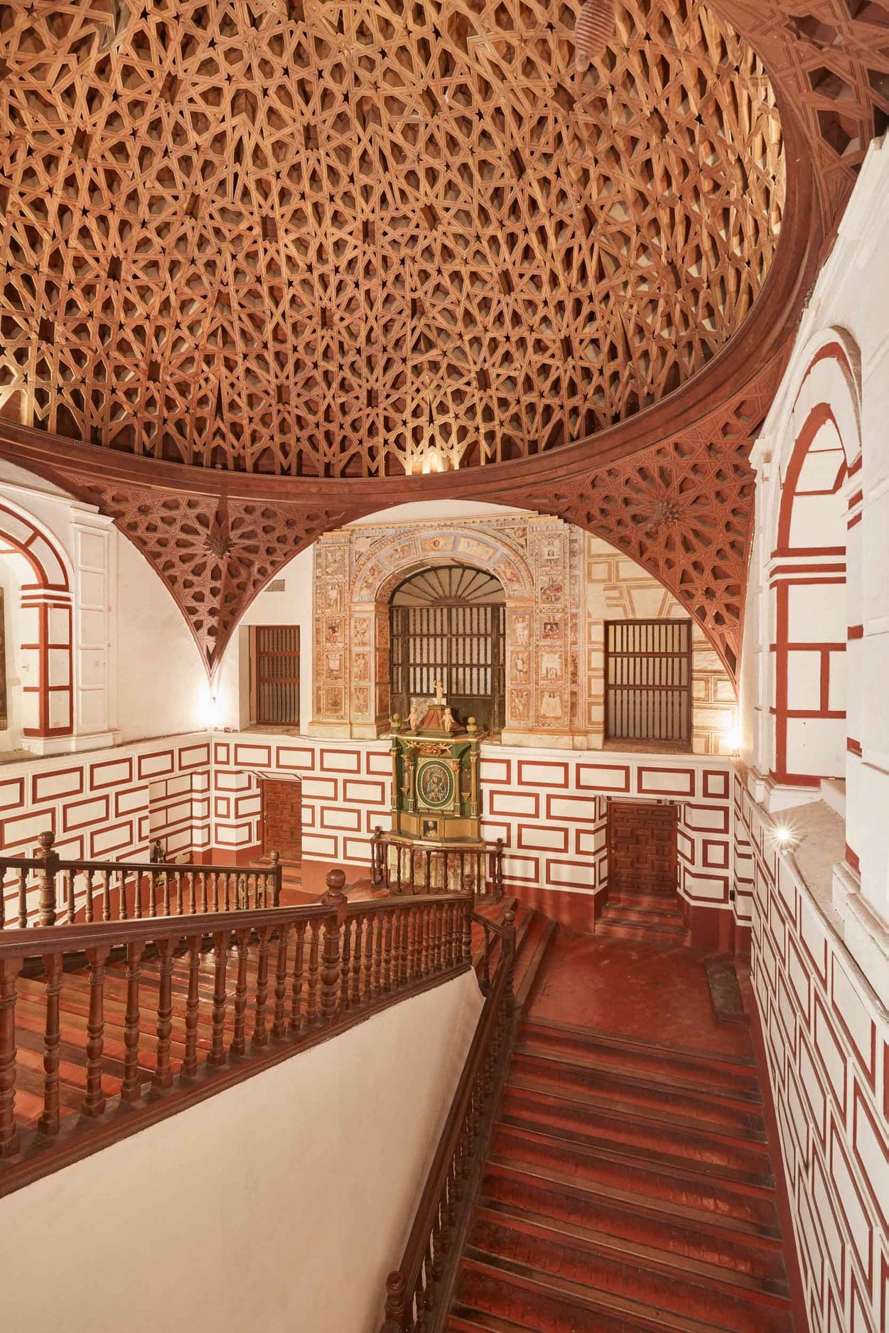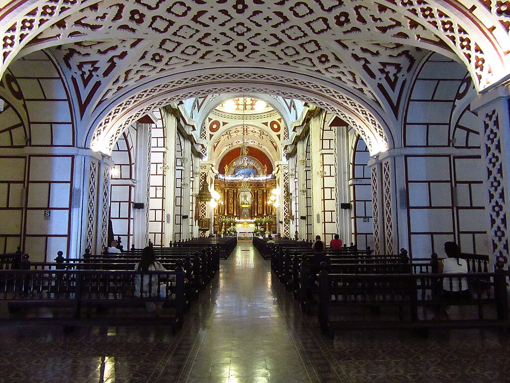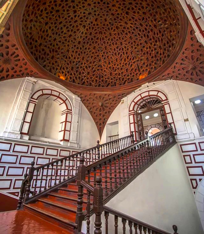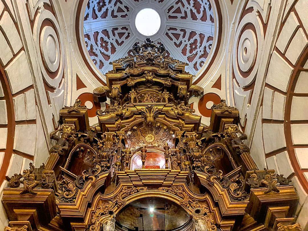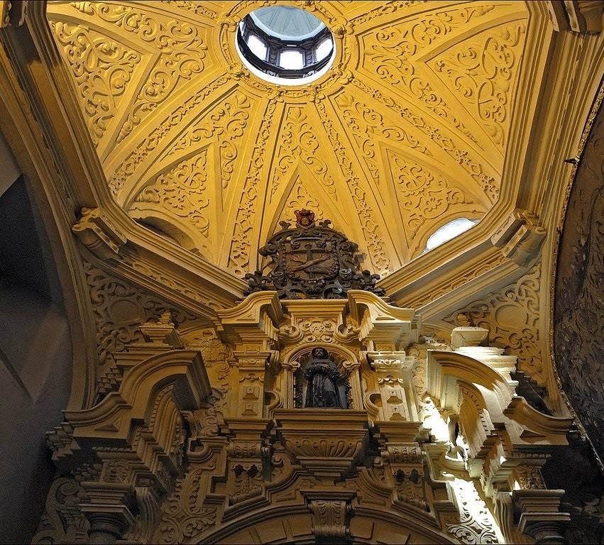 La cúpula central, reconstruida tras daños sísmicos, conserva elementos originales y una compleja decoración geométrica que refleja la maestría artesanal de la época colonial.