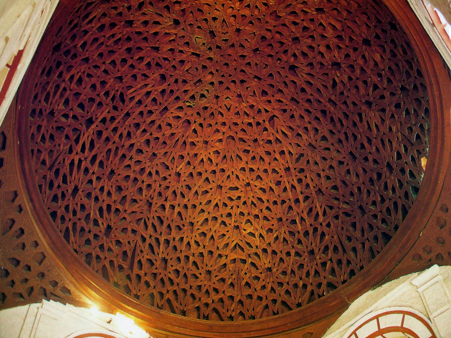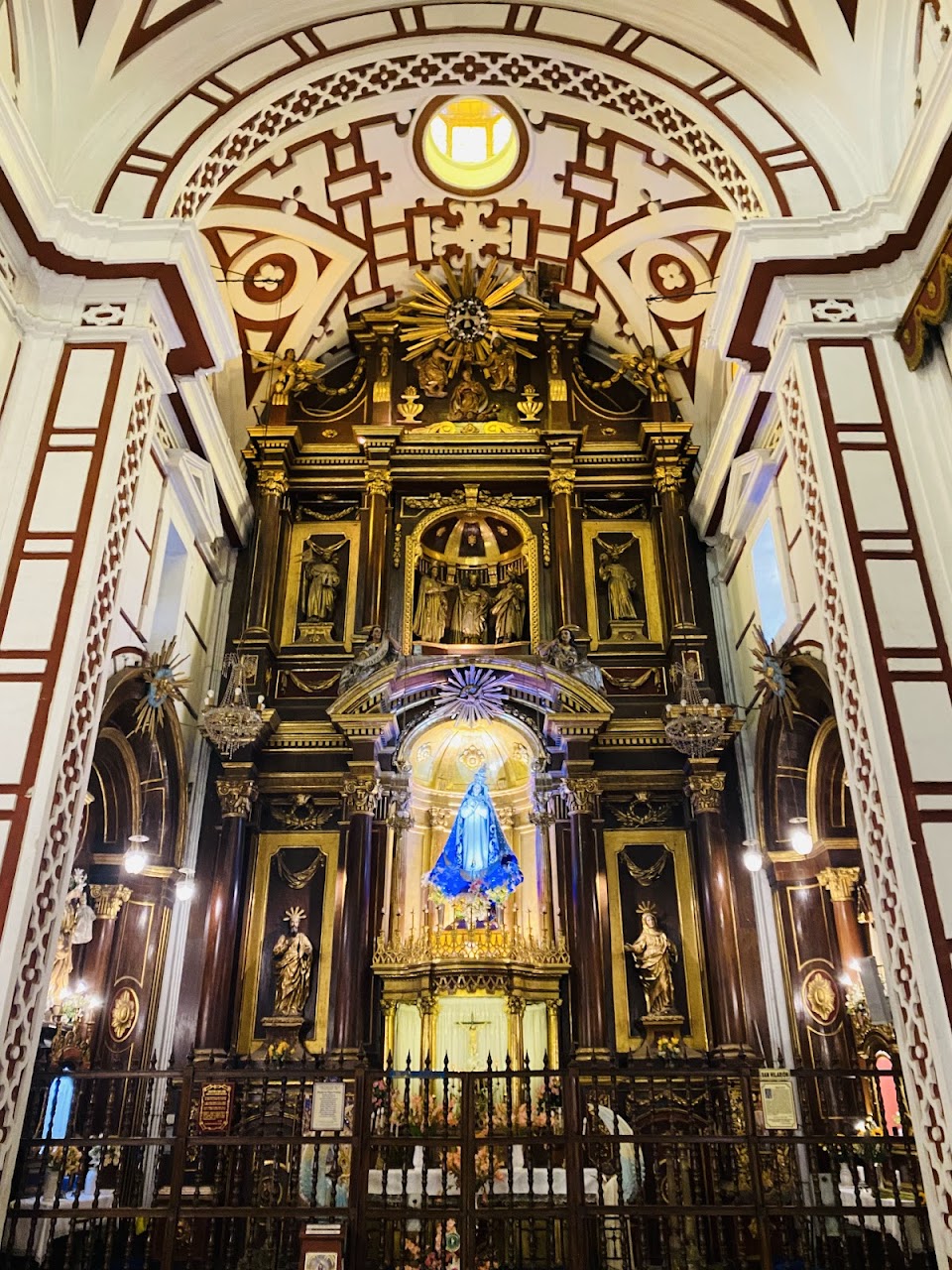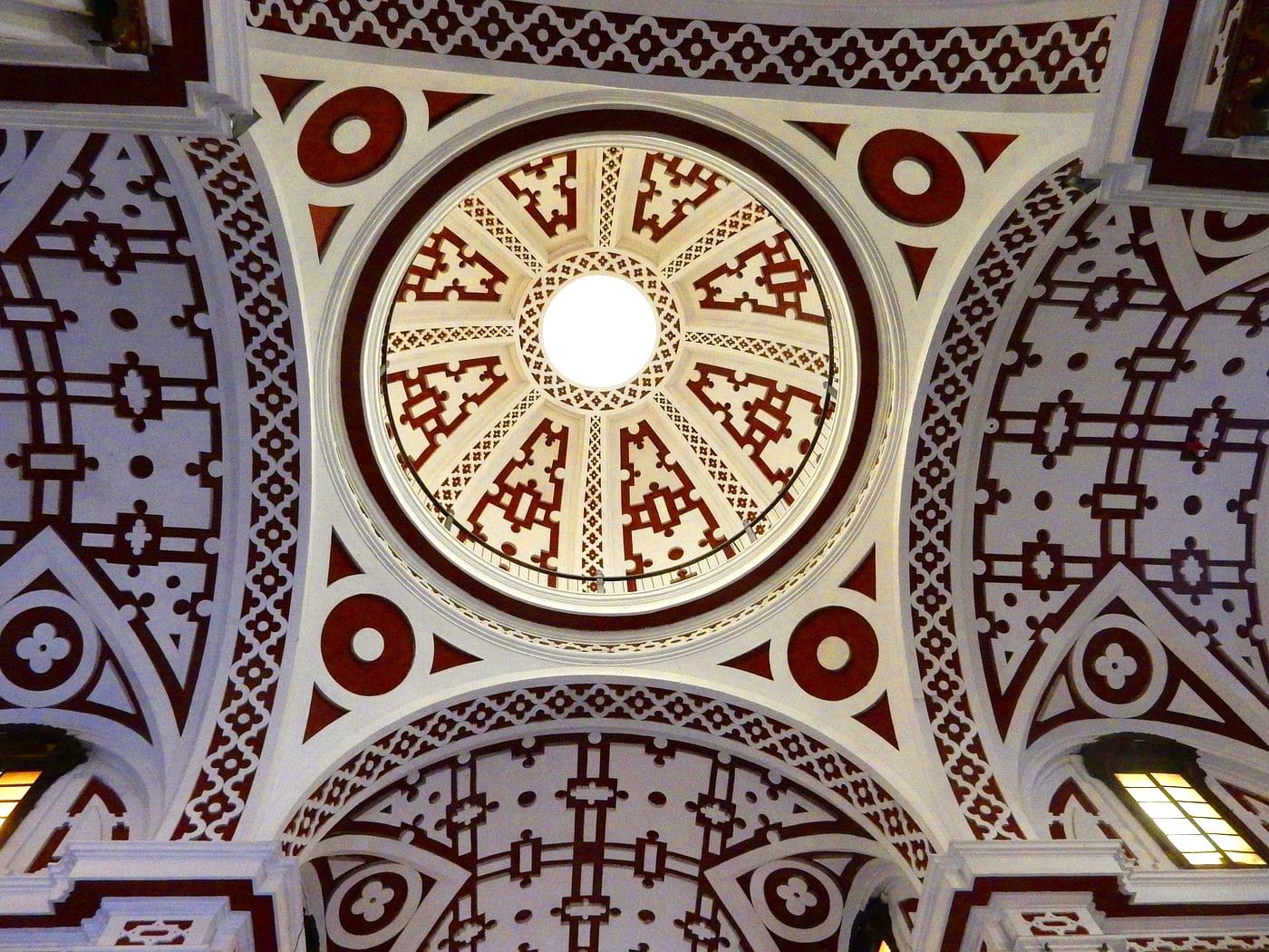 La cúpula central, reconstruida tras daños sísmicos, conserva elementos originales y una compleja decoración geométrica que refleja la maestría artesanal de la época colonial.