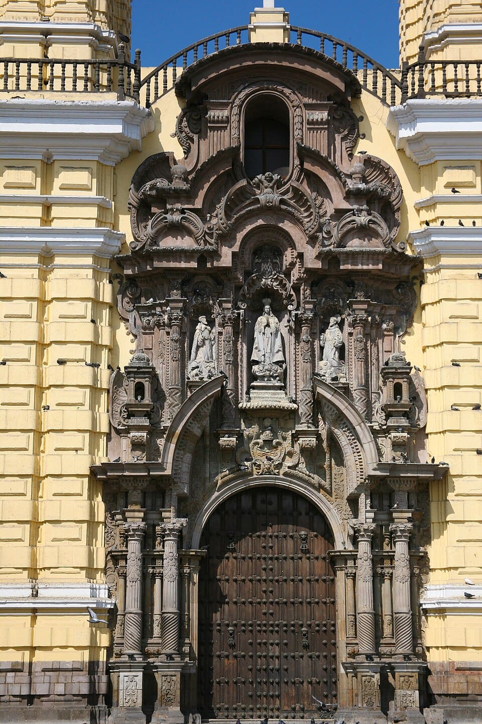 La basílica destaca por su estilo barroco español adaptado al contexto americano. Su fachada amarilla y blanca, característica del paisaje urbano limeño, transmite monumentalidad y elegancia colonial.