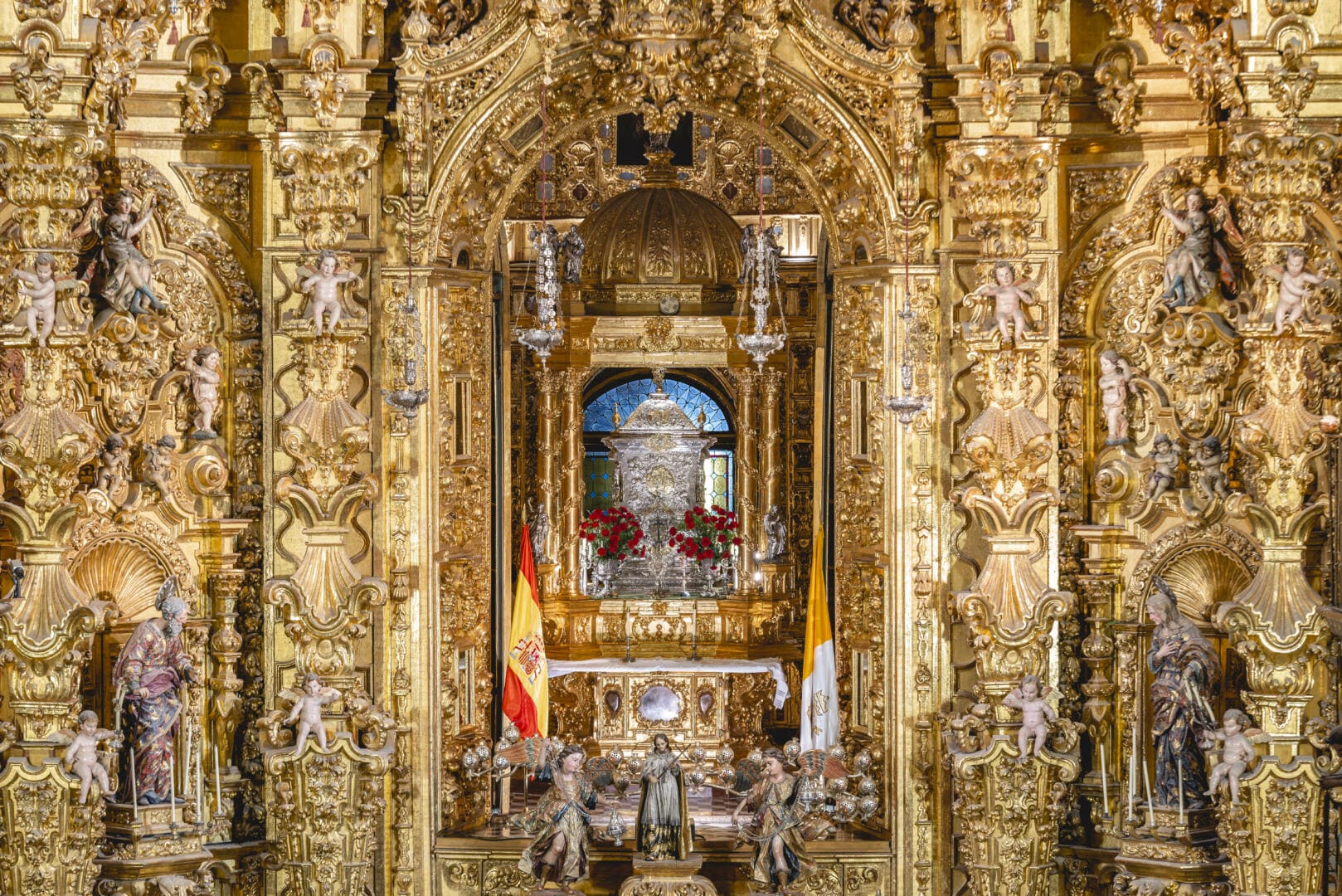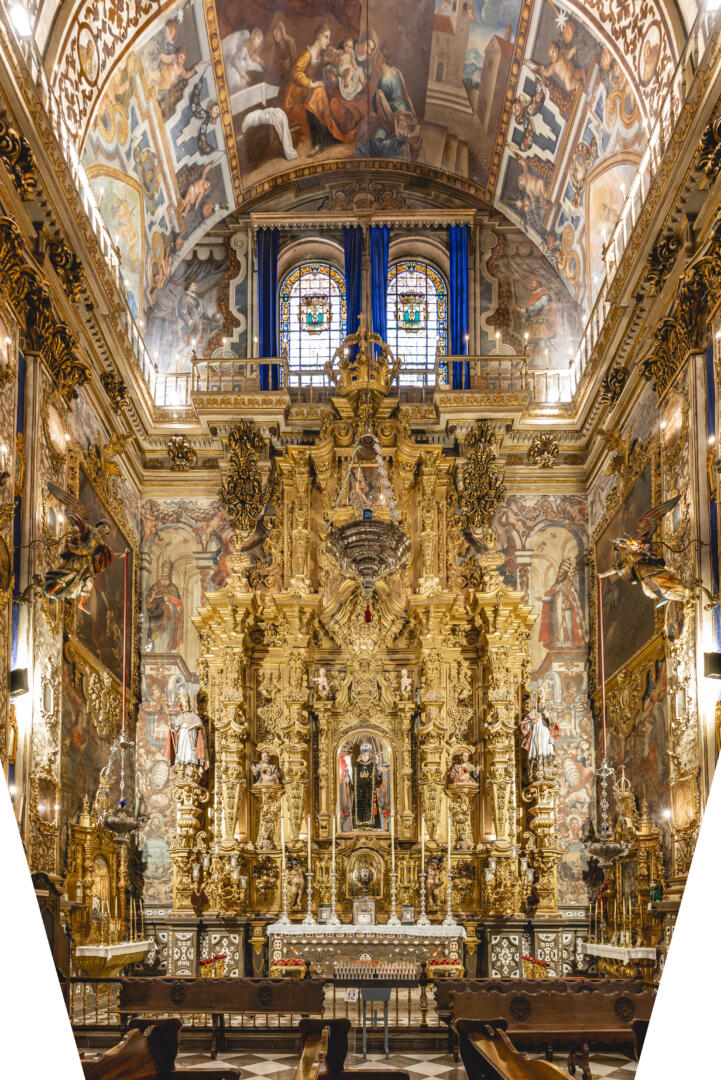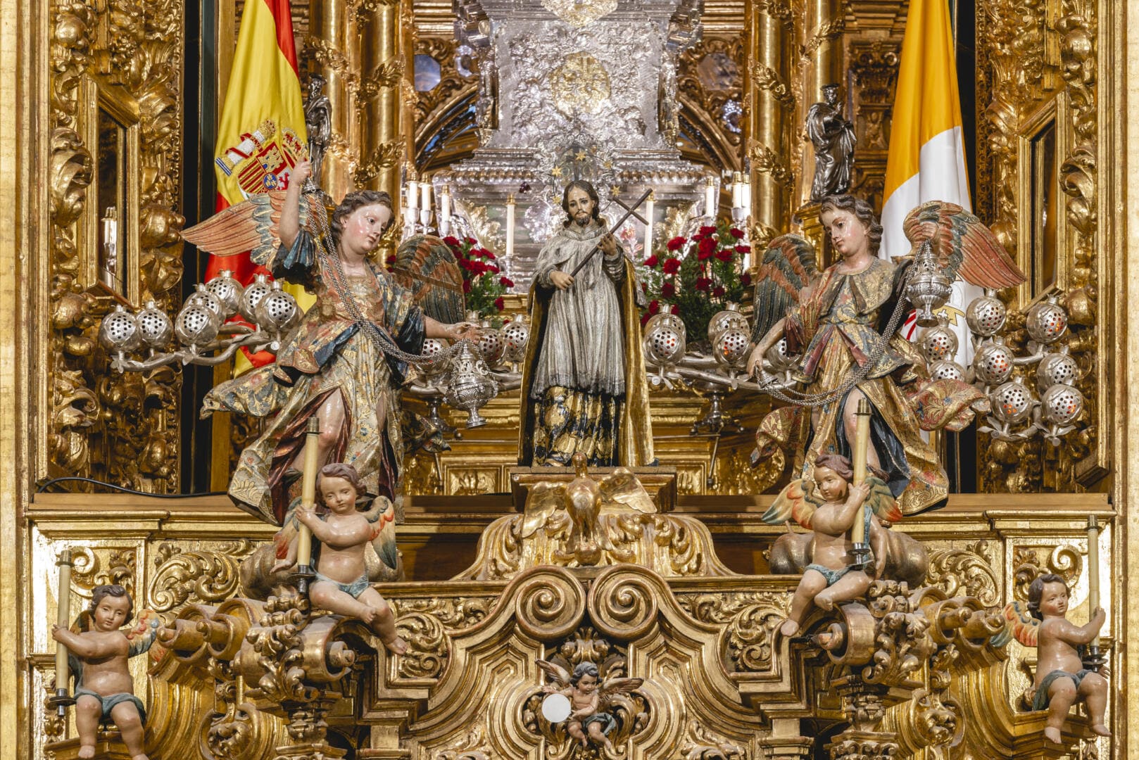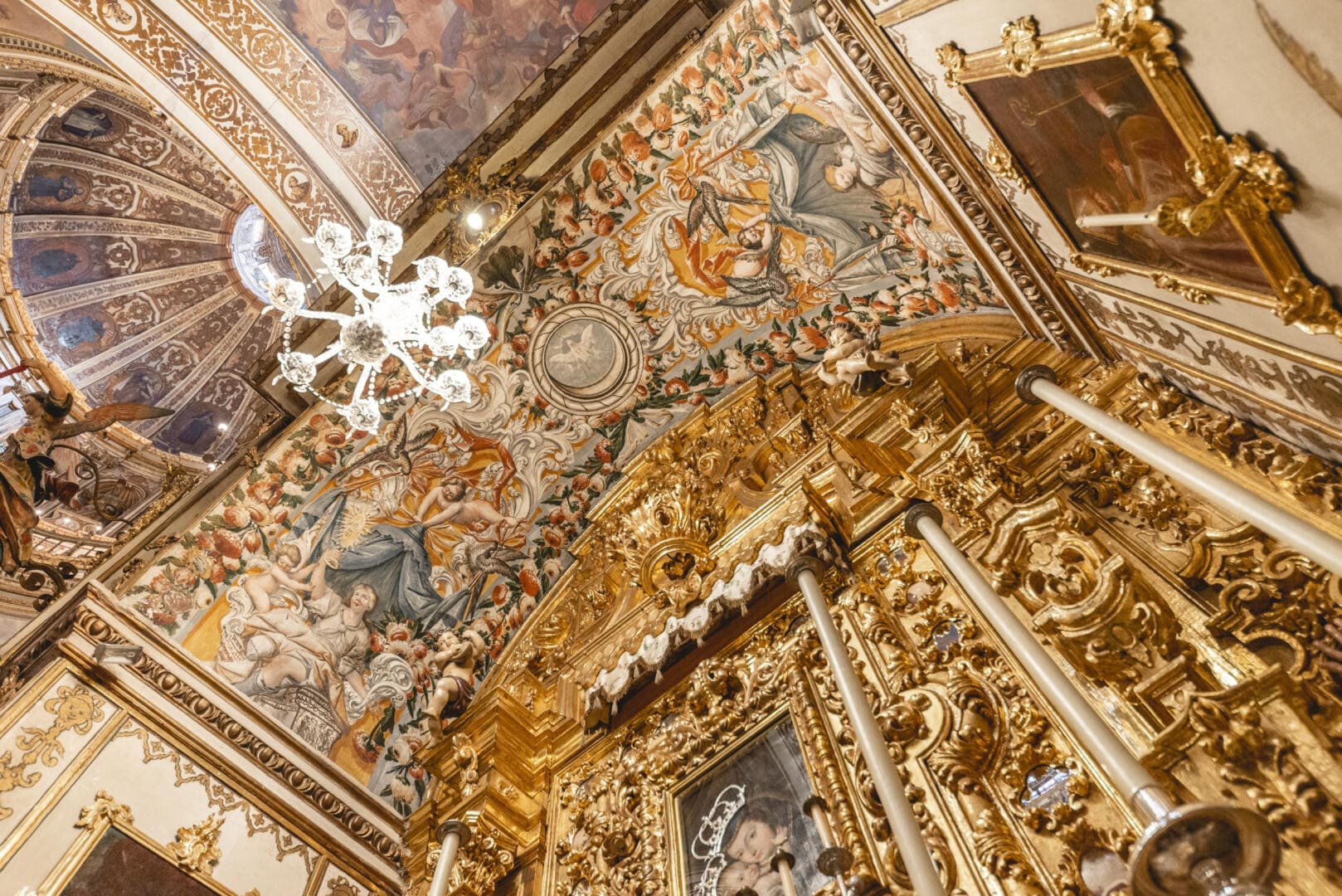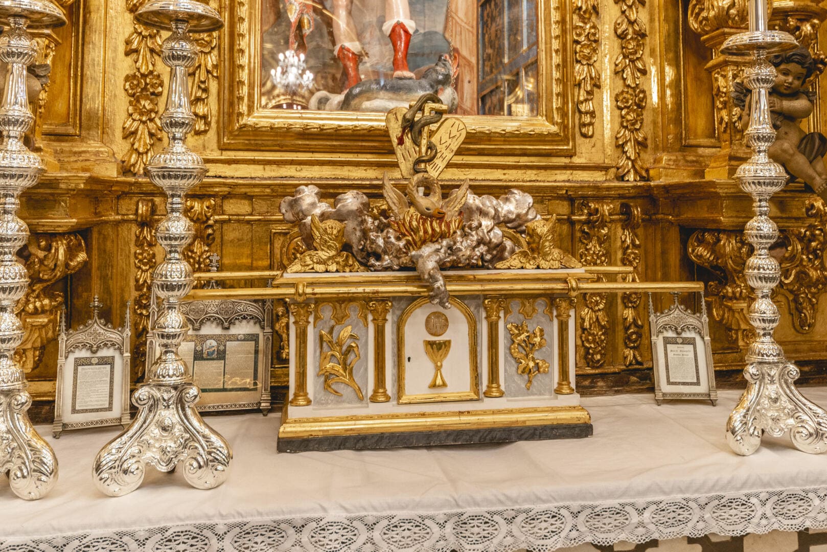 El interior se caracteriza por una gran riqueza ornamental: abundancia de dorados, tallas, relieves, policromía, frescos y espejos en el camarín que resguardan las reliquias del santo.