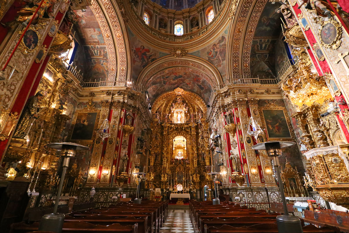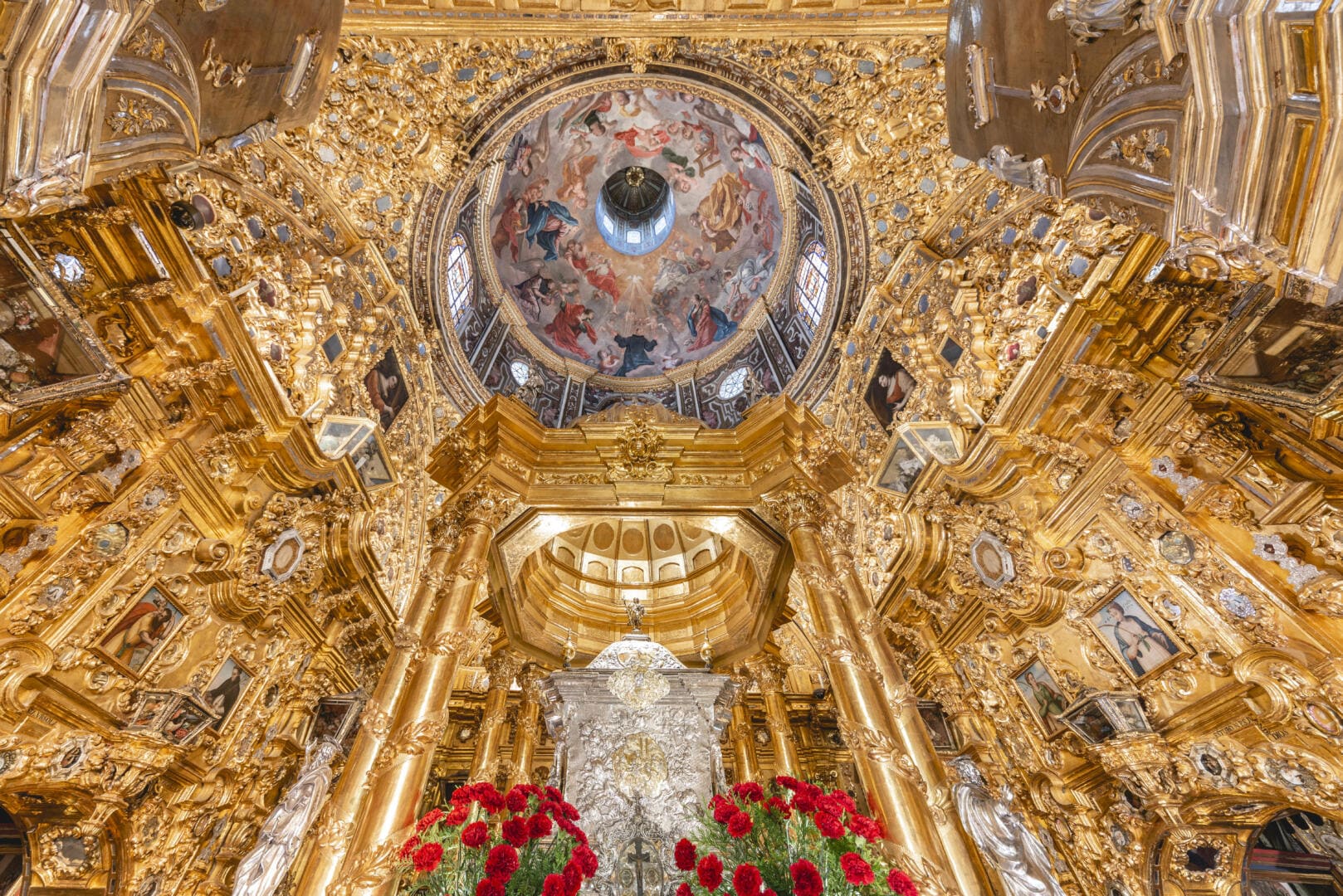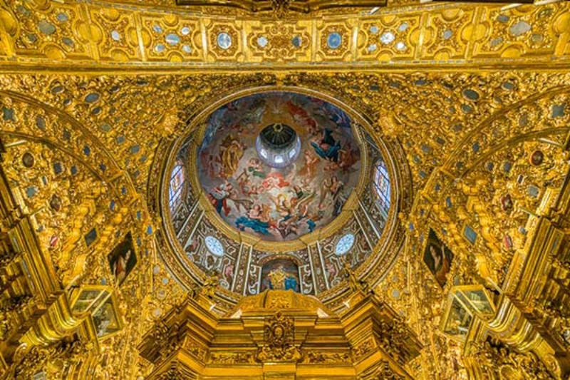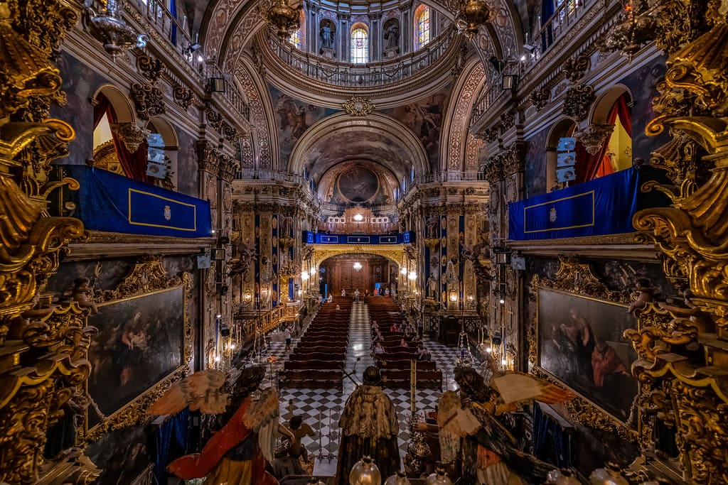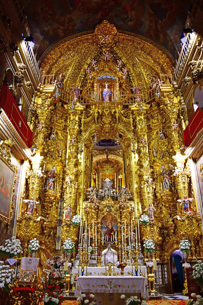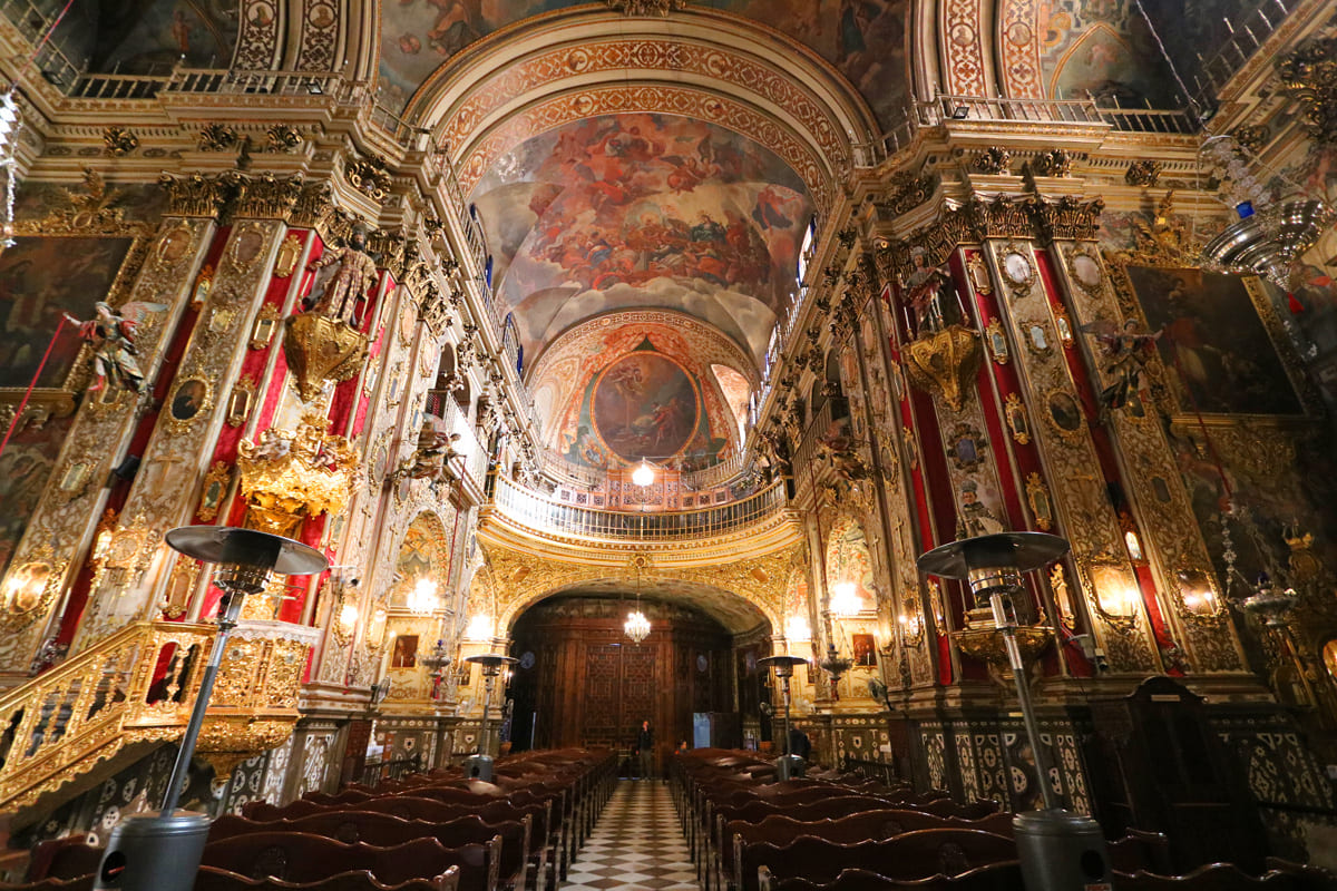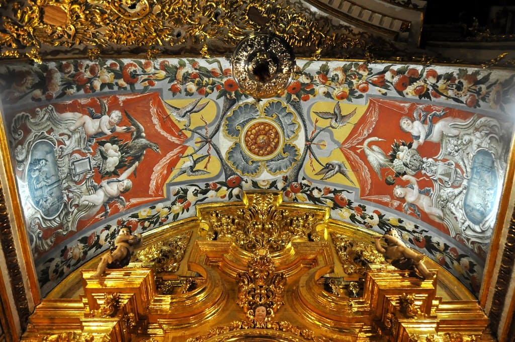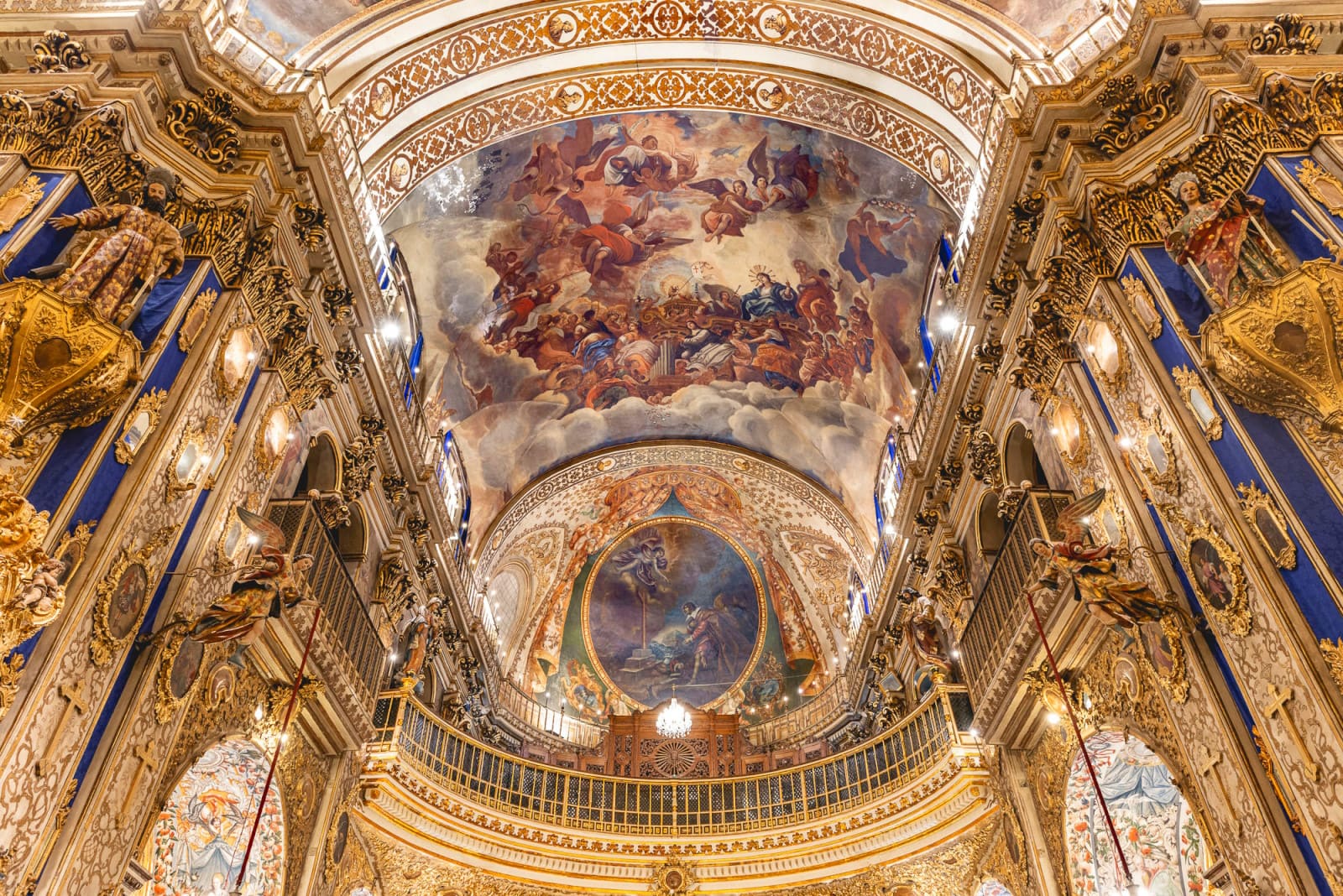 El interior se caracteriza por una gran riqueza ornamental: abundancia de dorados, tallas, relieves, policromía, frescos y espejos en el camarín que resguardan las reliquias del santo.