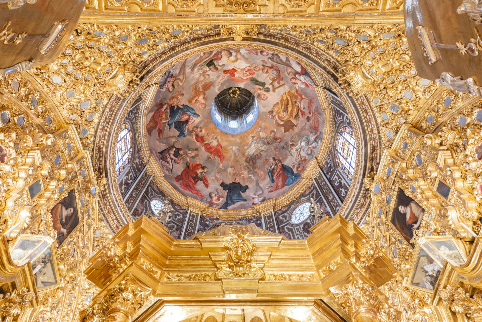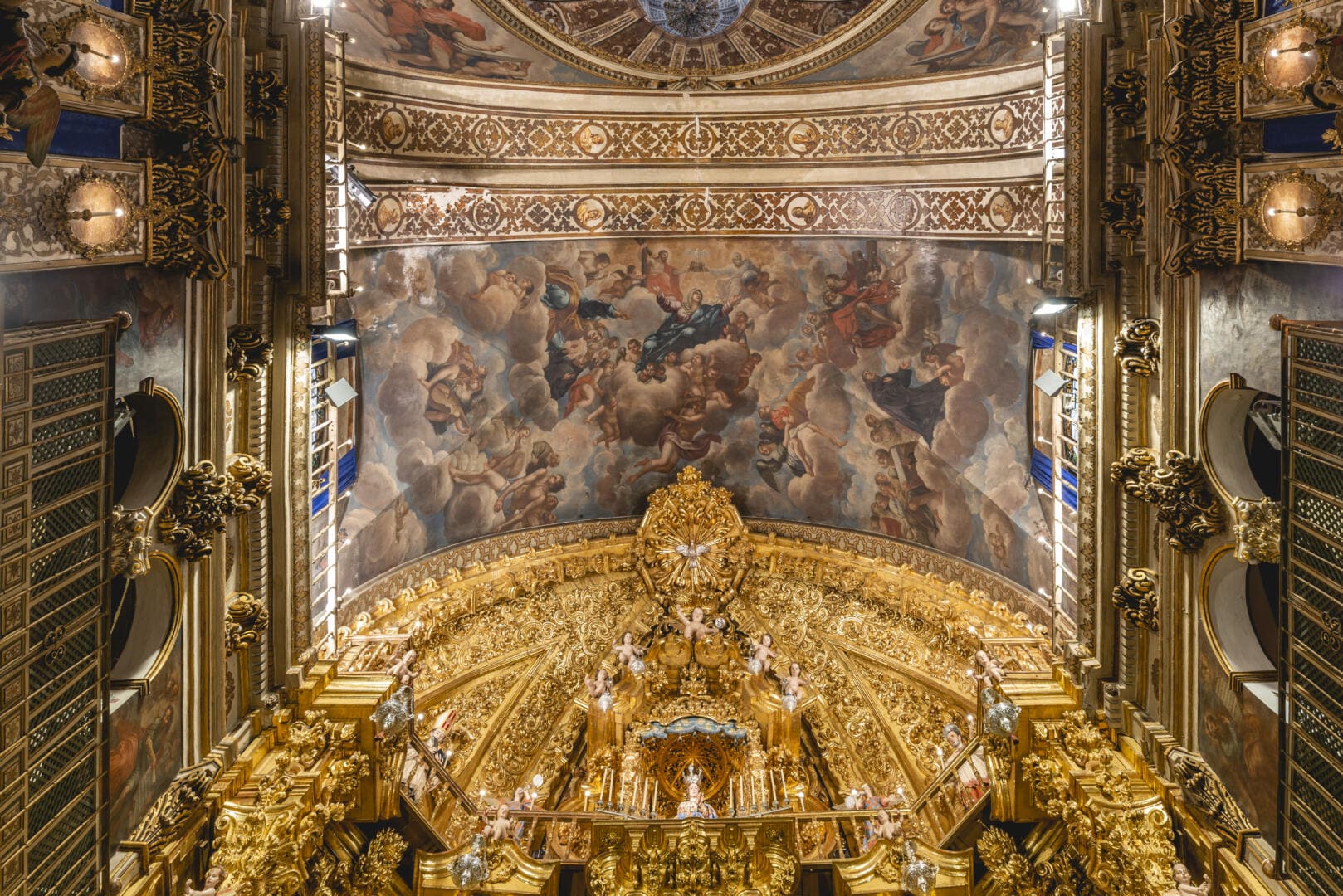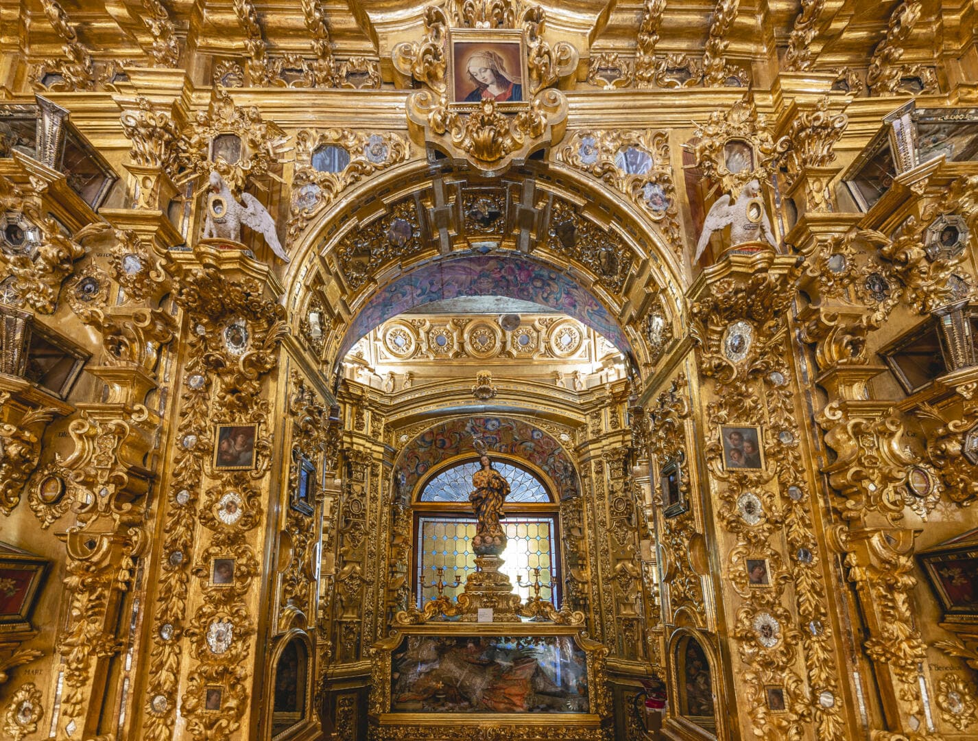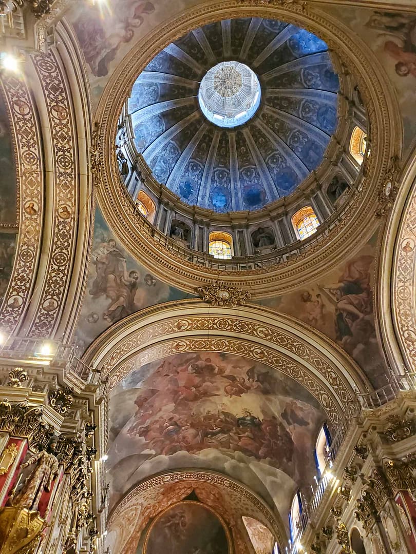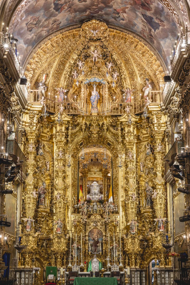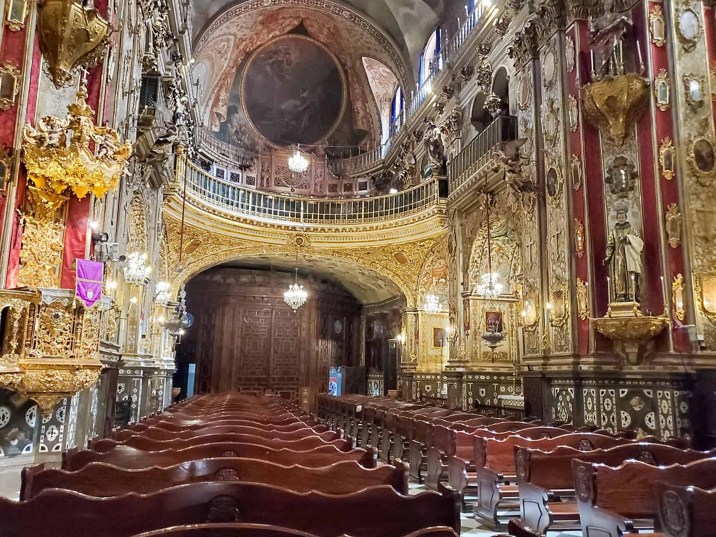 El interior se caracteriza por una gran riqueza ornamental: abundancia de dorados, tallas, relieves, policromía, frescos y espejos en el camarín que resguardan las reliquias del santo.