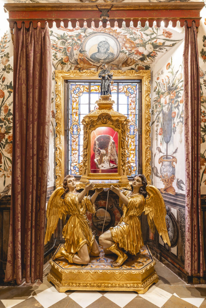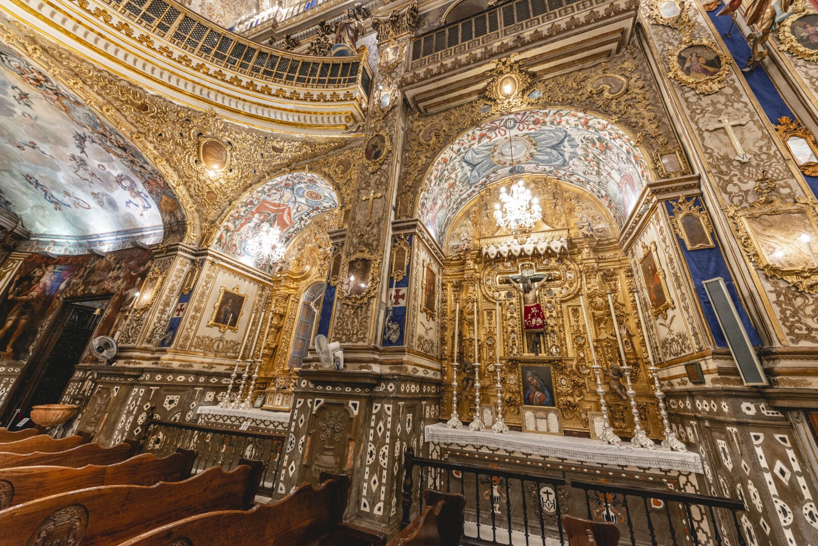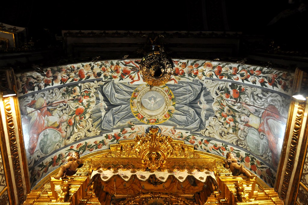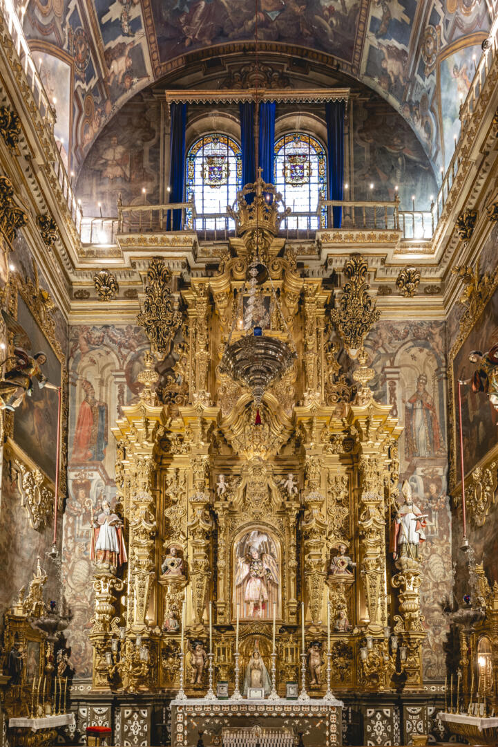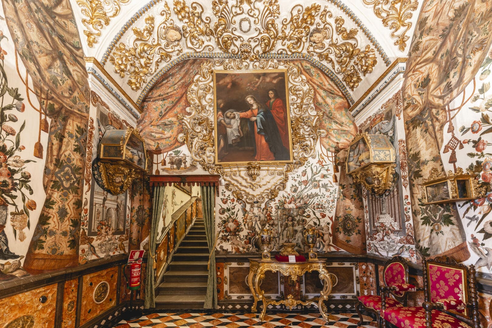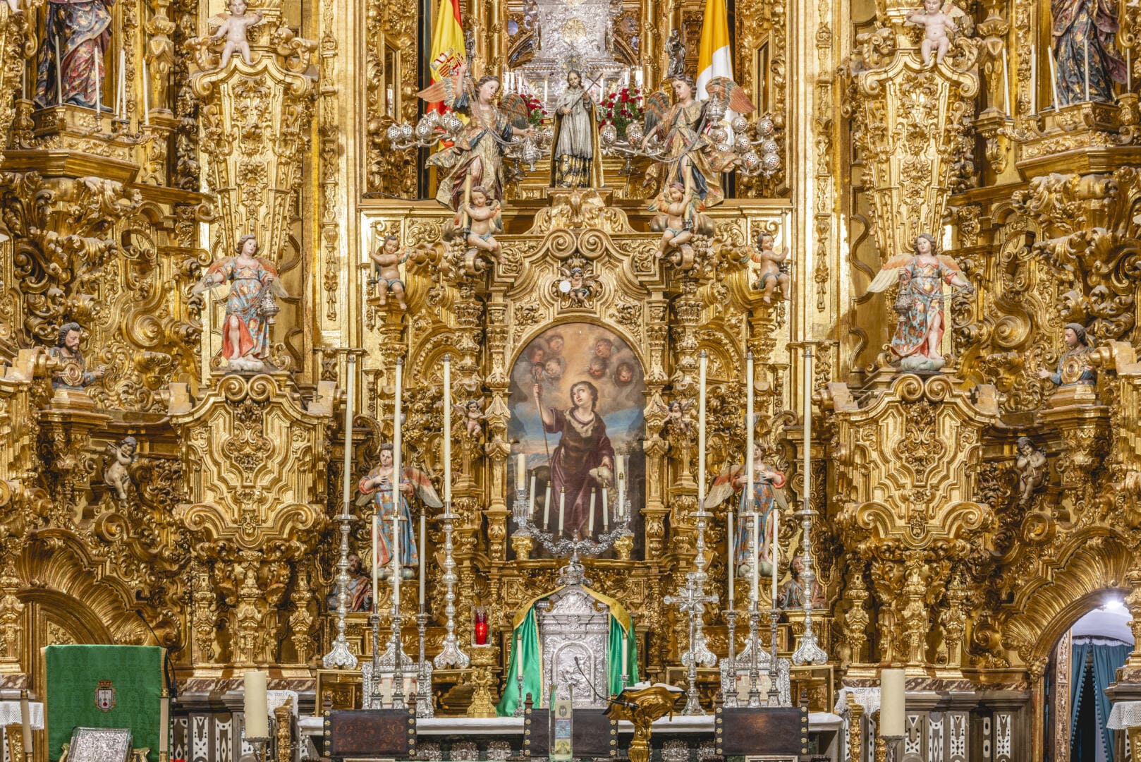 El interior se caracteriza por una gran riqueza ornamental: abundancia de dorados, tallas, relieves, policromía, frescos y espejos en el camarín que resguardan las reliquias del santo.