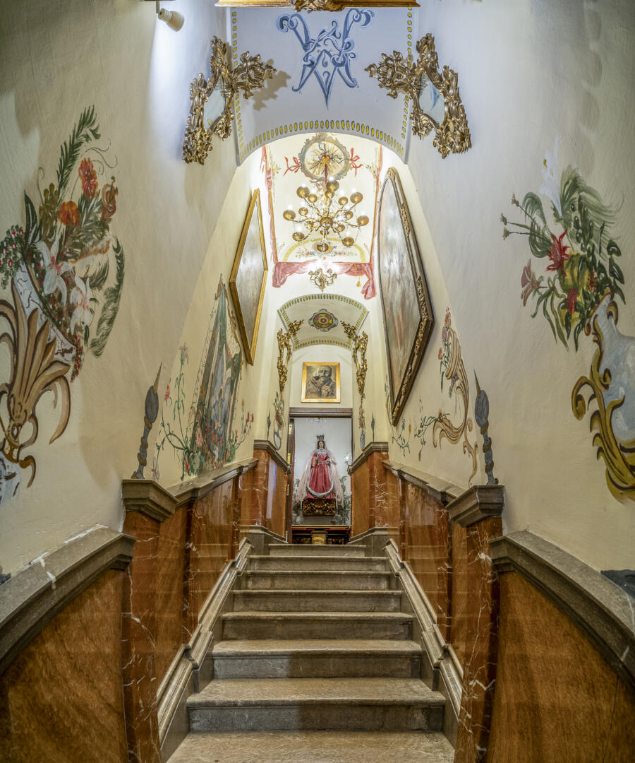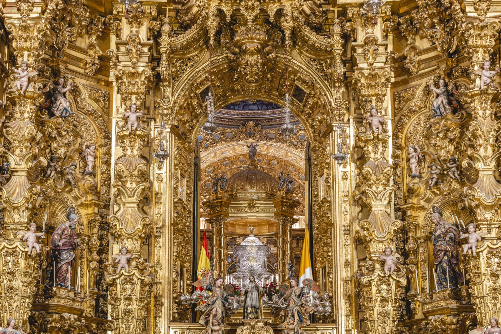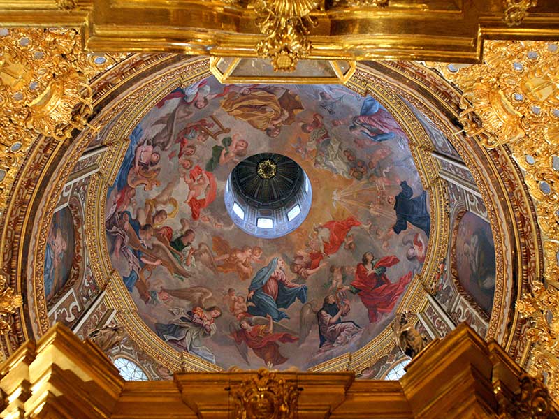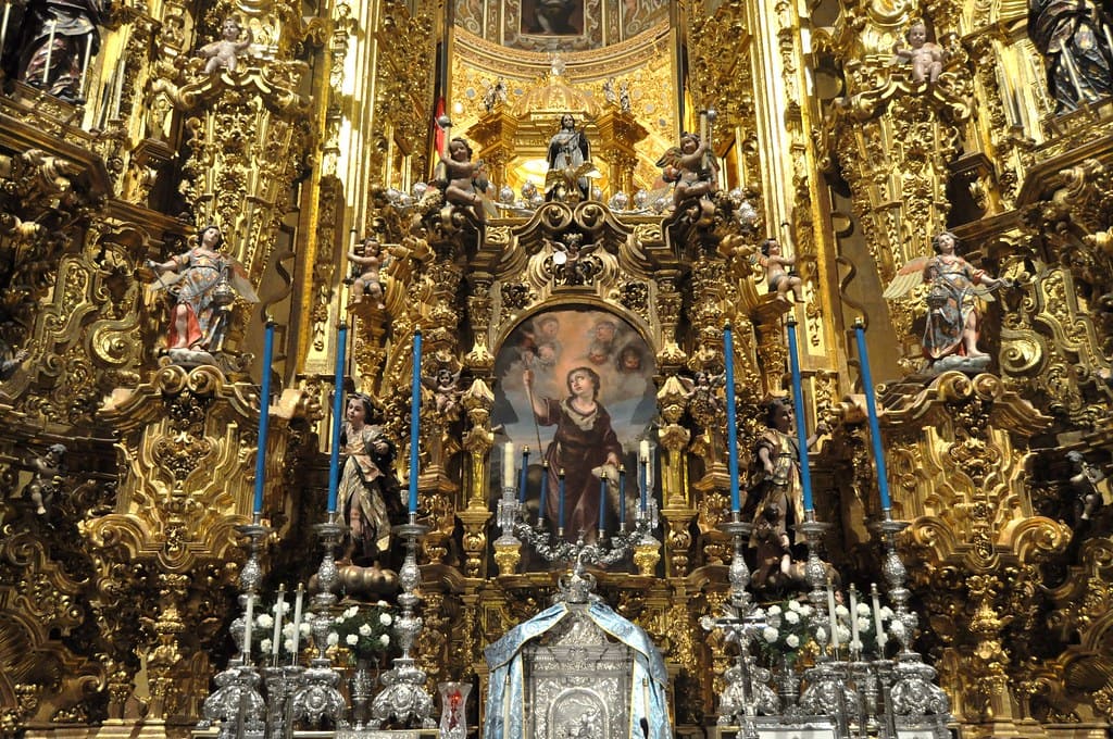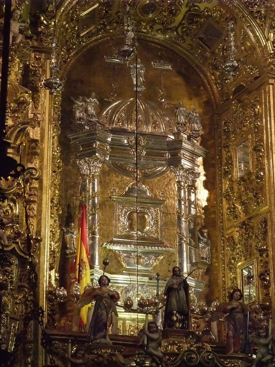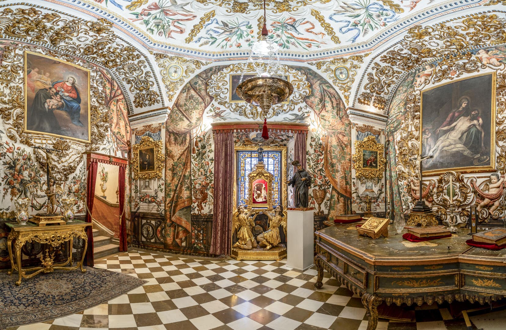 El interior se caracteriza por una gran riqueza ornamental: abundancia de dorados, tallas, relieves, policromía, frescos y espejos en el camarín que resguardan las reliquias del santo.