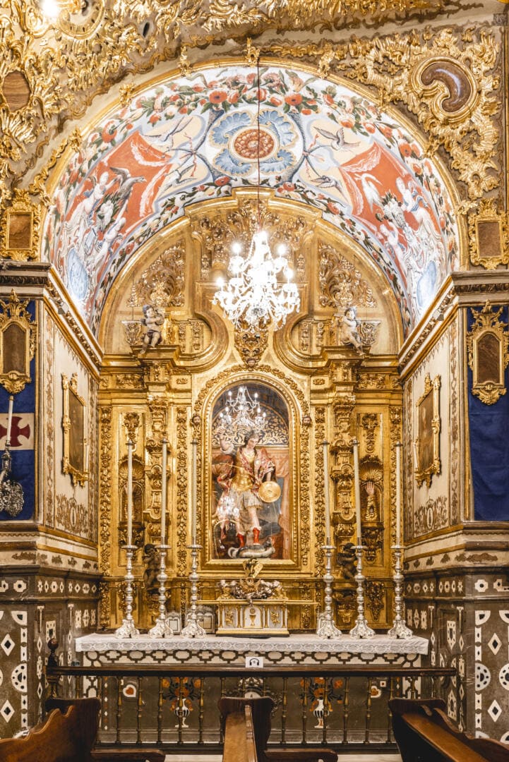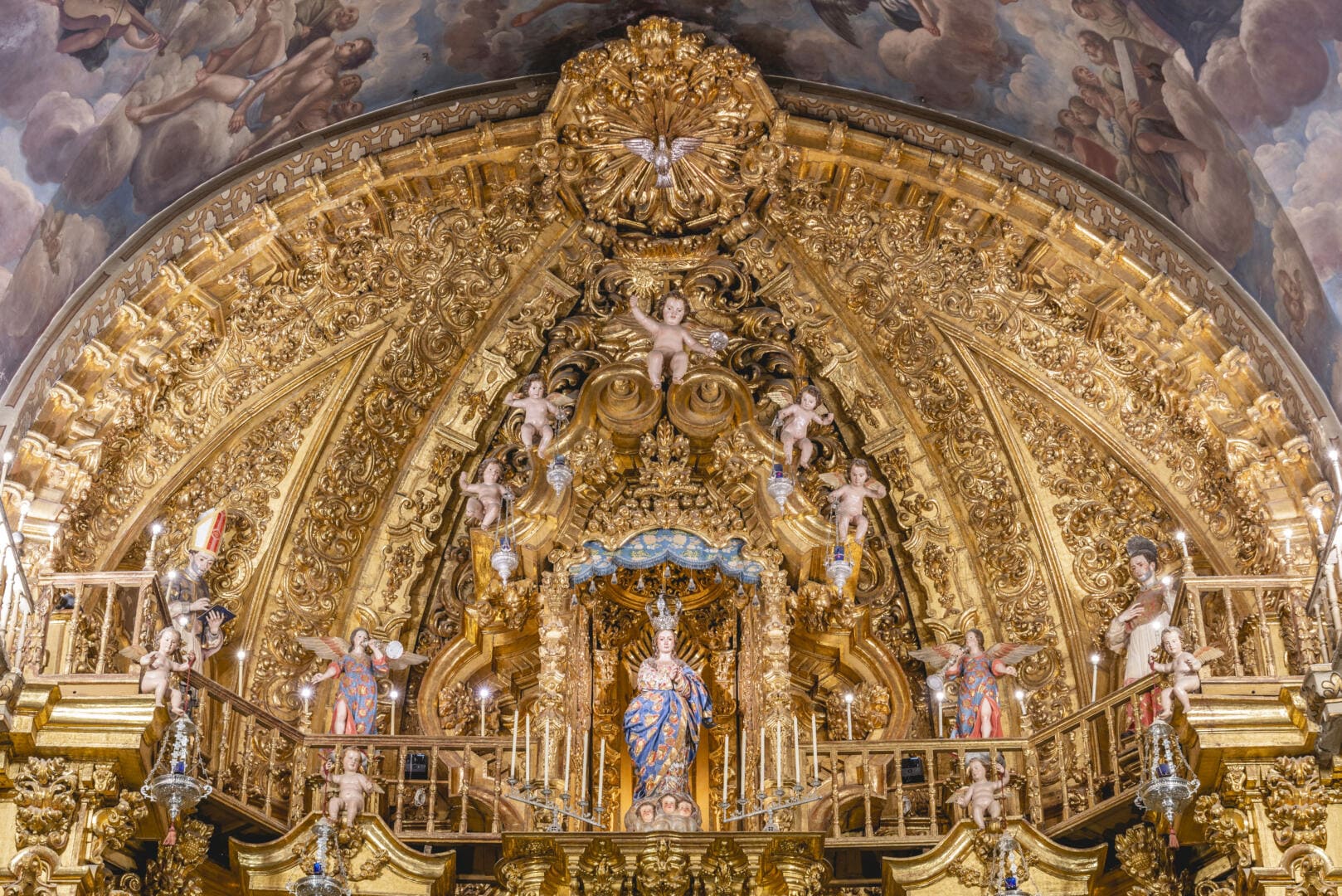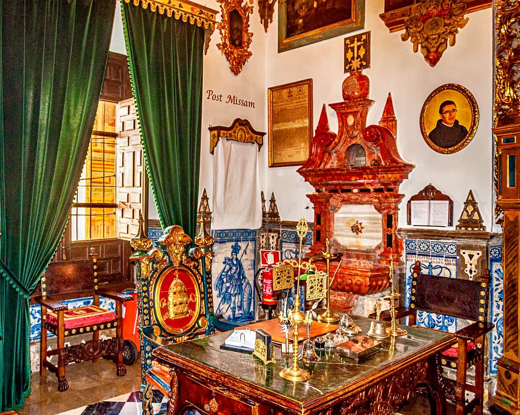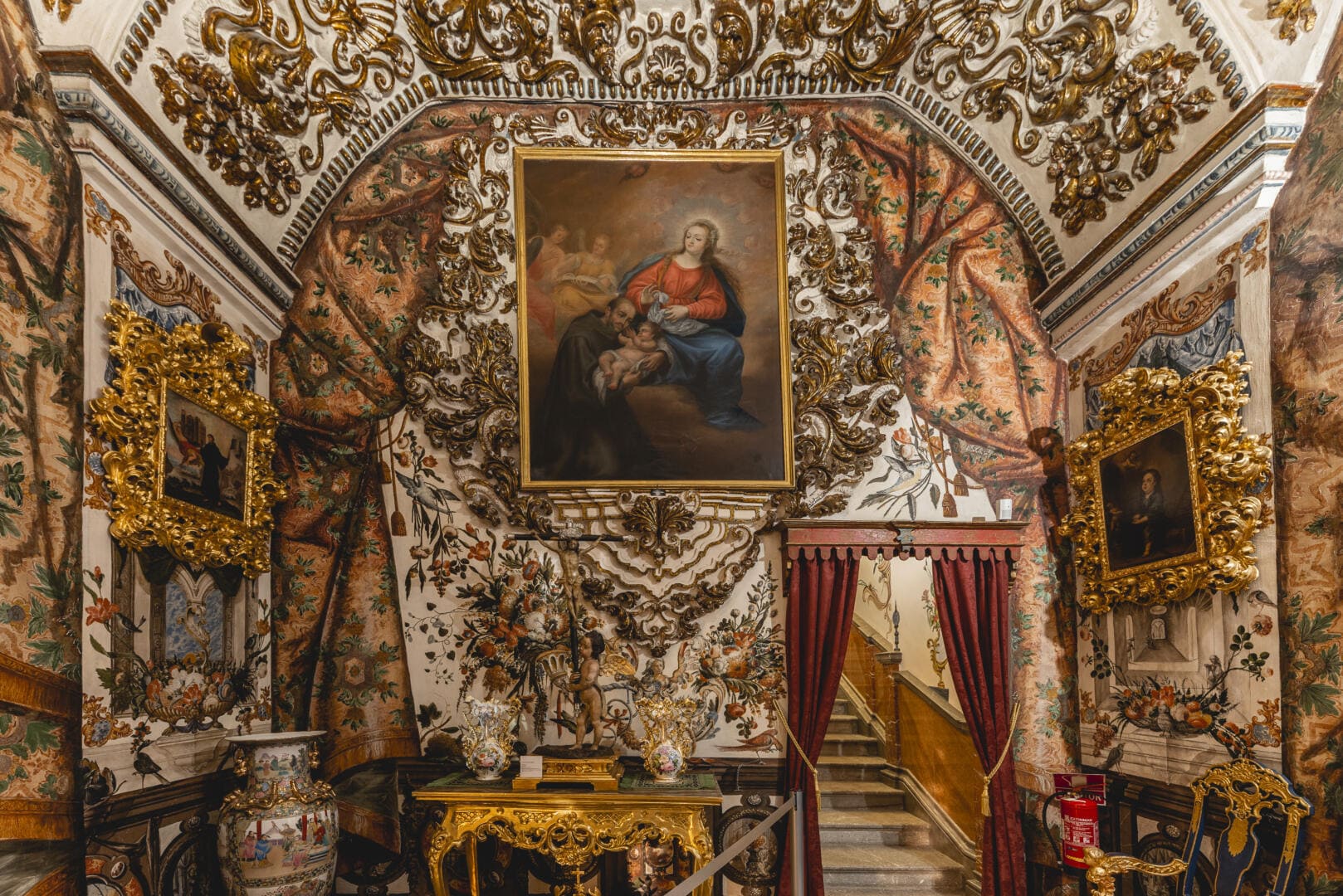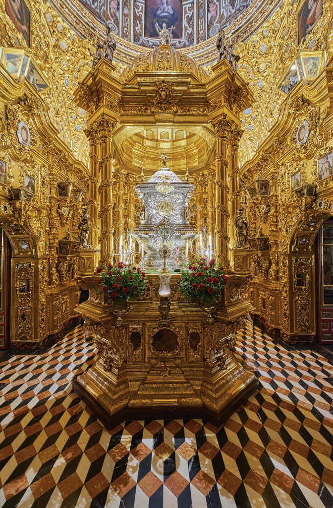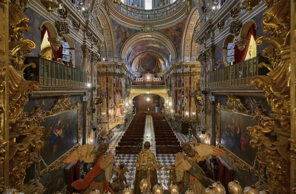El interior se caracteriza por una gran riqueza ornamental: abundancia de dorados, tallas, relieves, policromía, frescos y espejos en el camarín que resguardan las reliquias del santo.
