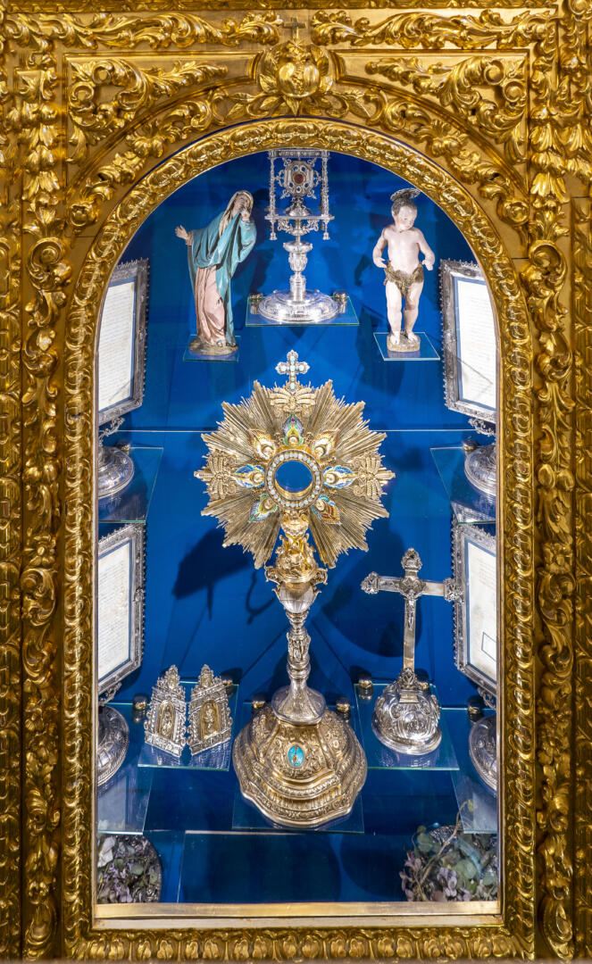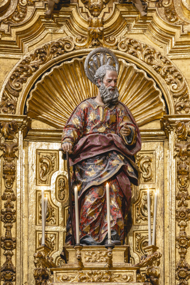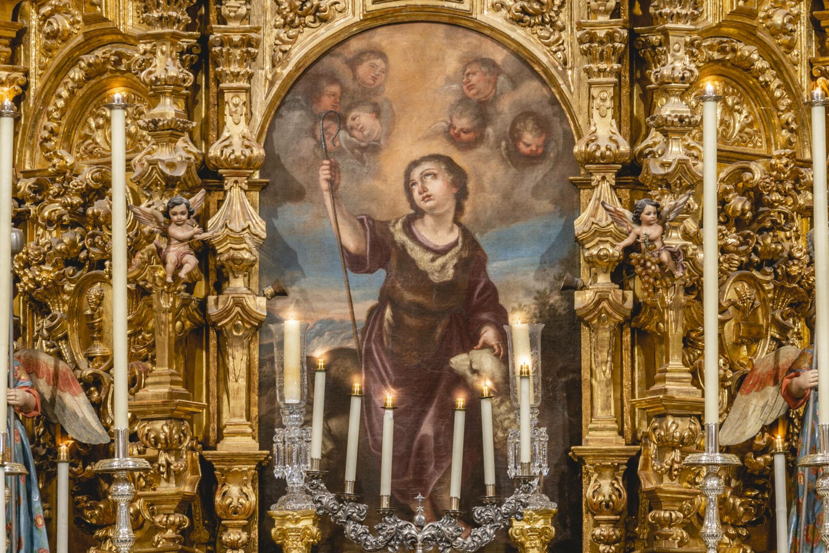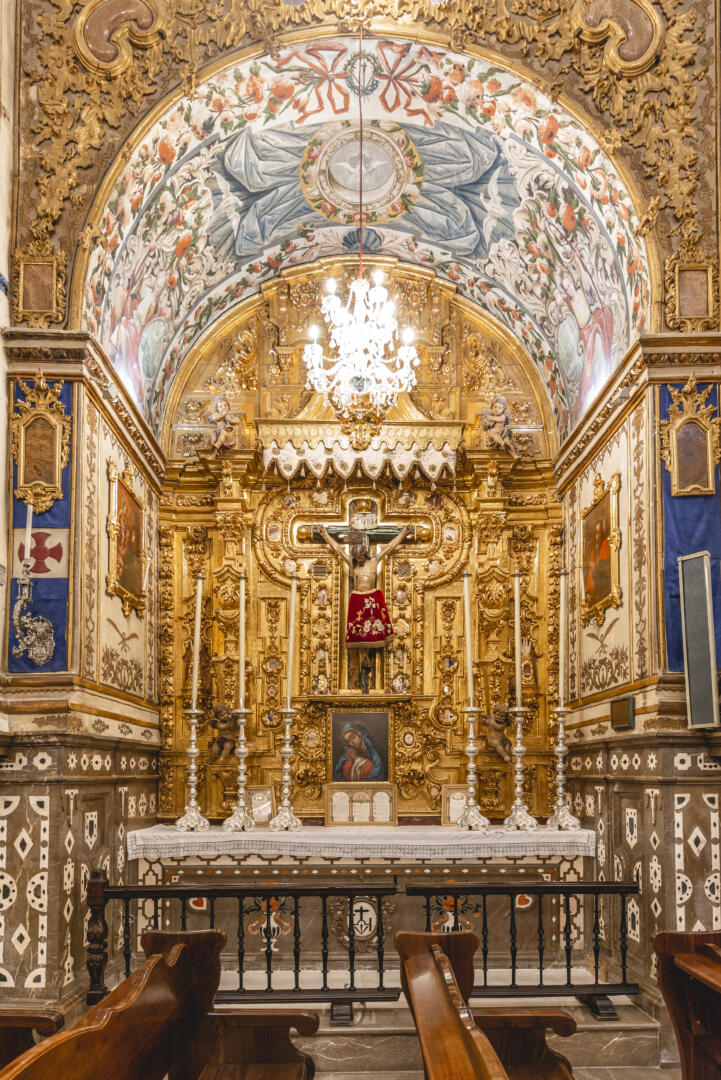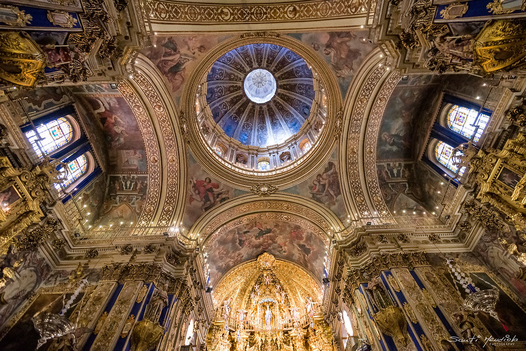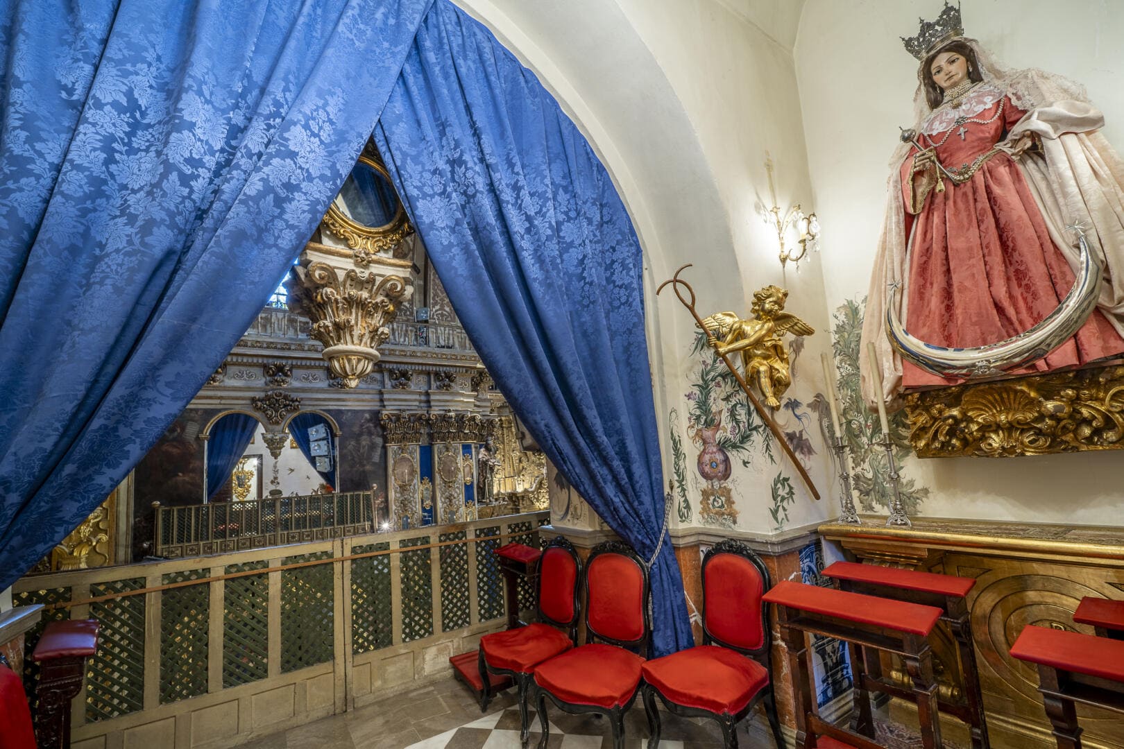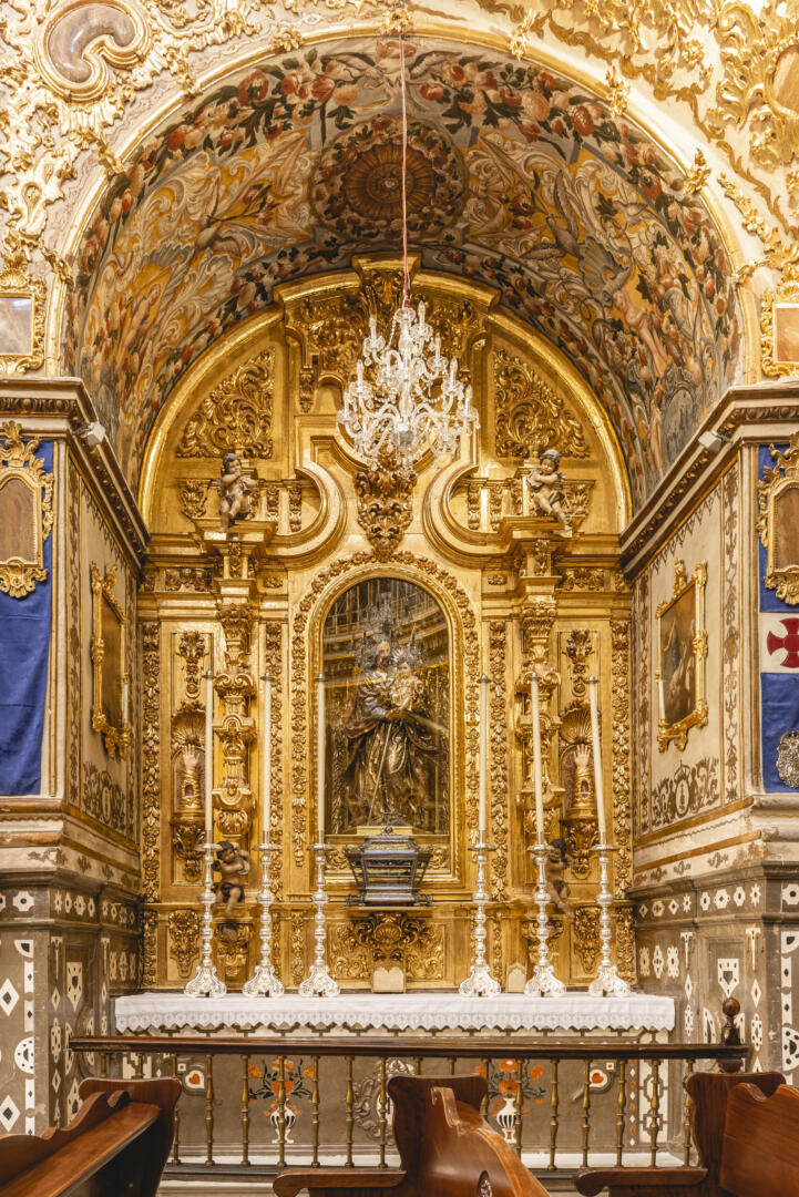 El interior se caracteriza por una gran riqueza ornamental: abundancia de dorados, tallas, relieves, policromía, frescos y espejos en el camarín que resguardan las reliquias del santo.