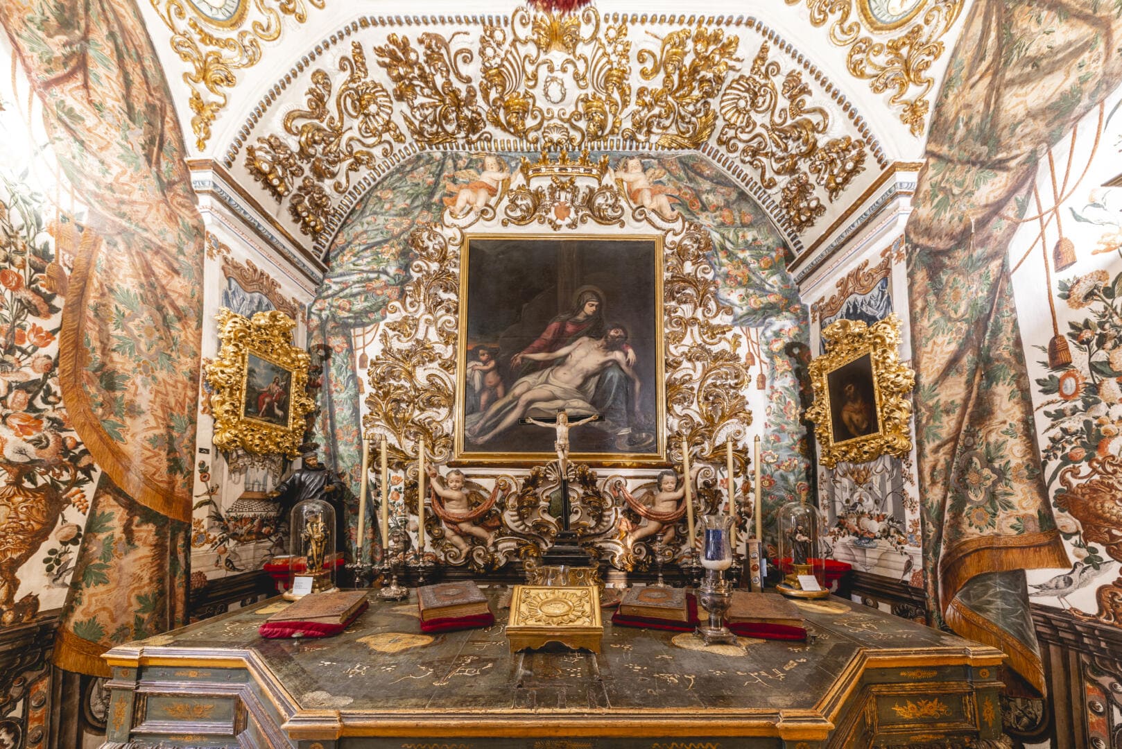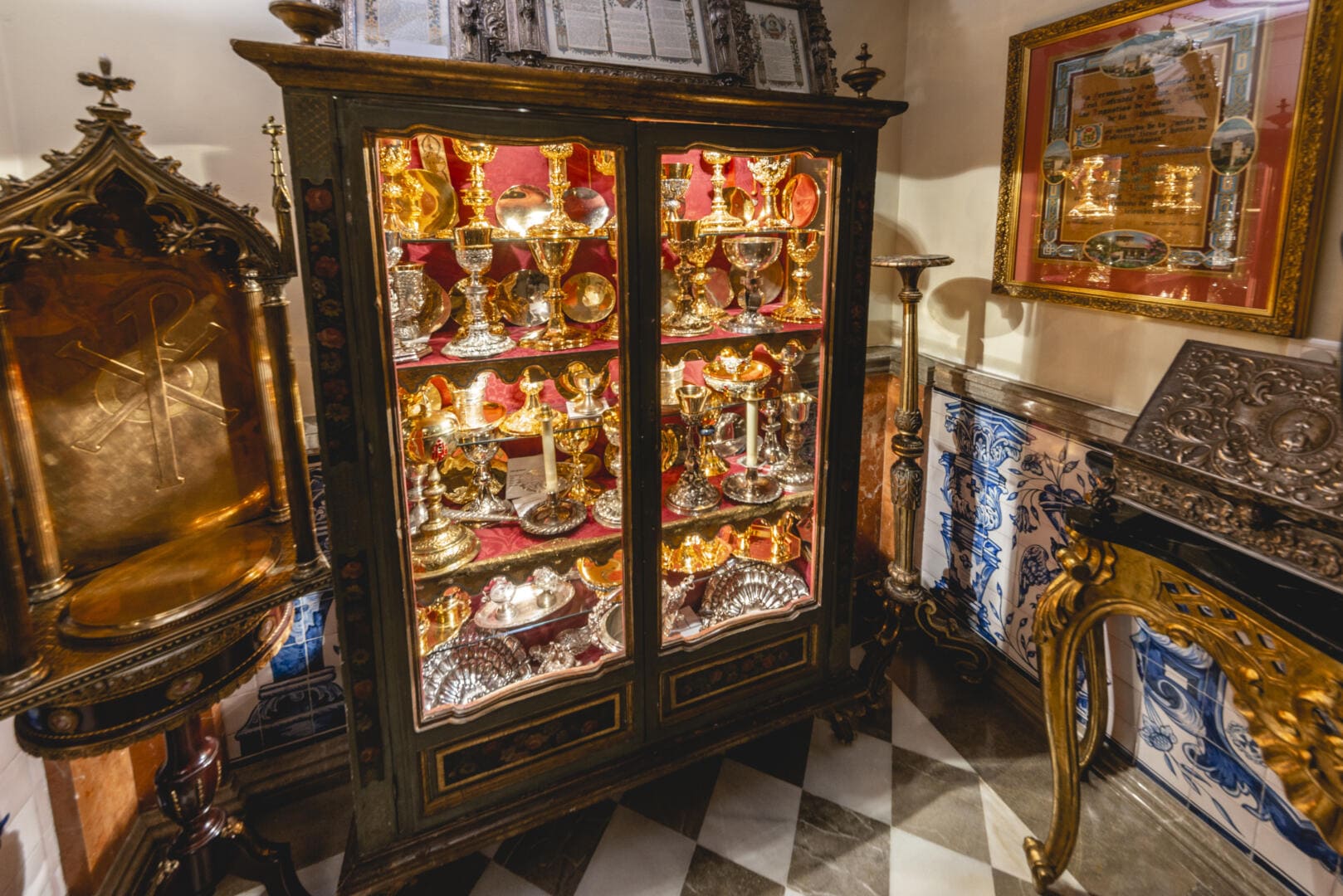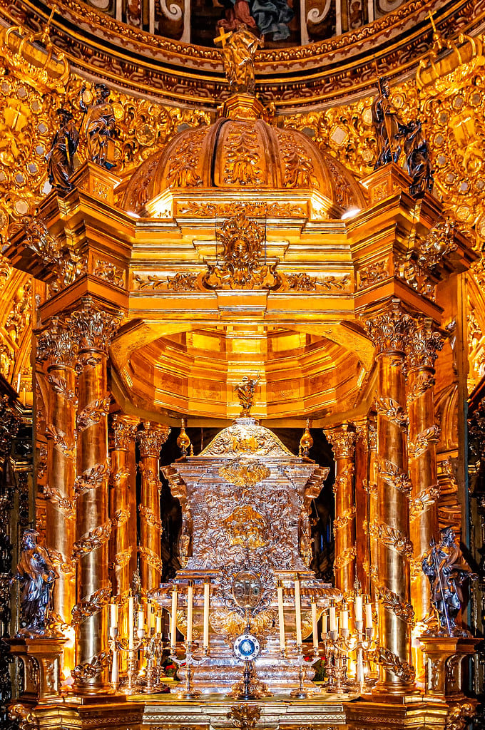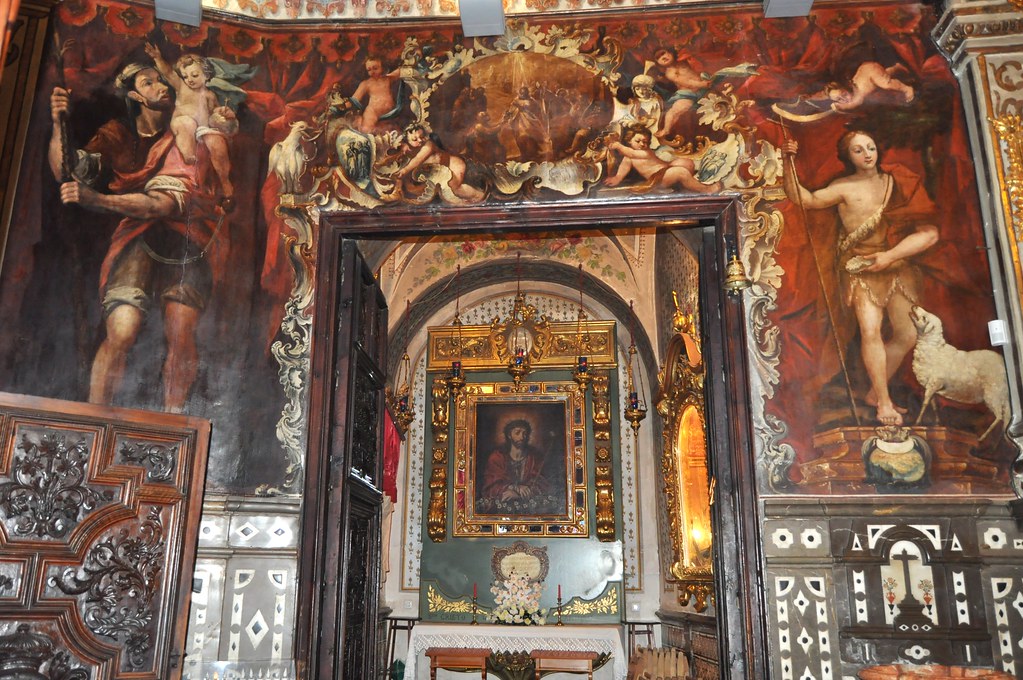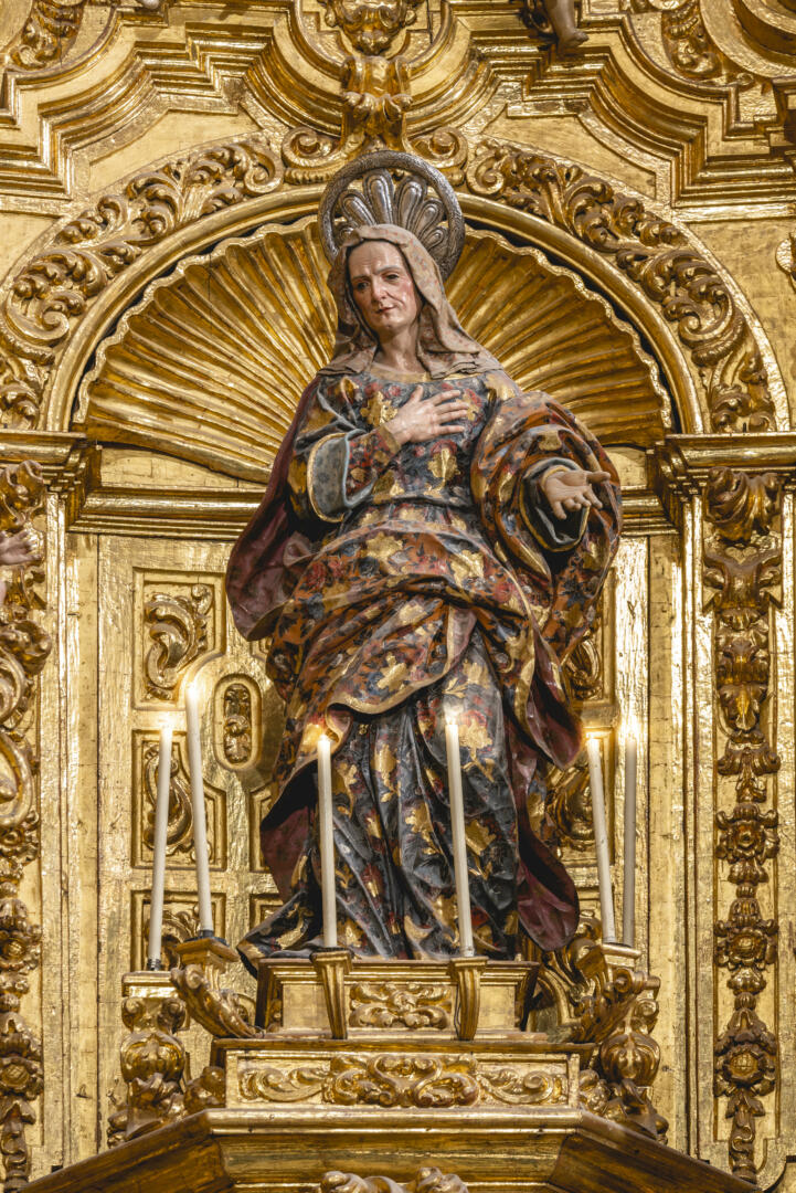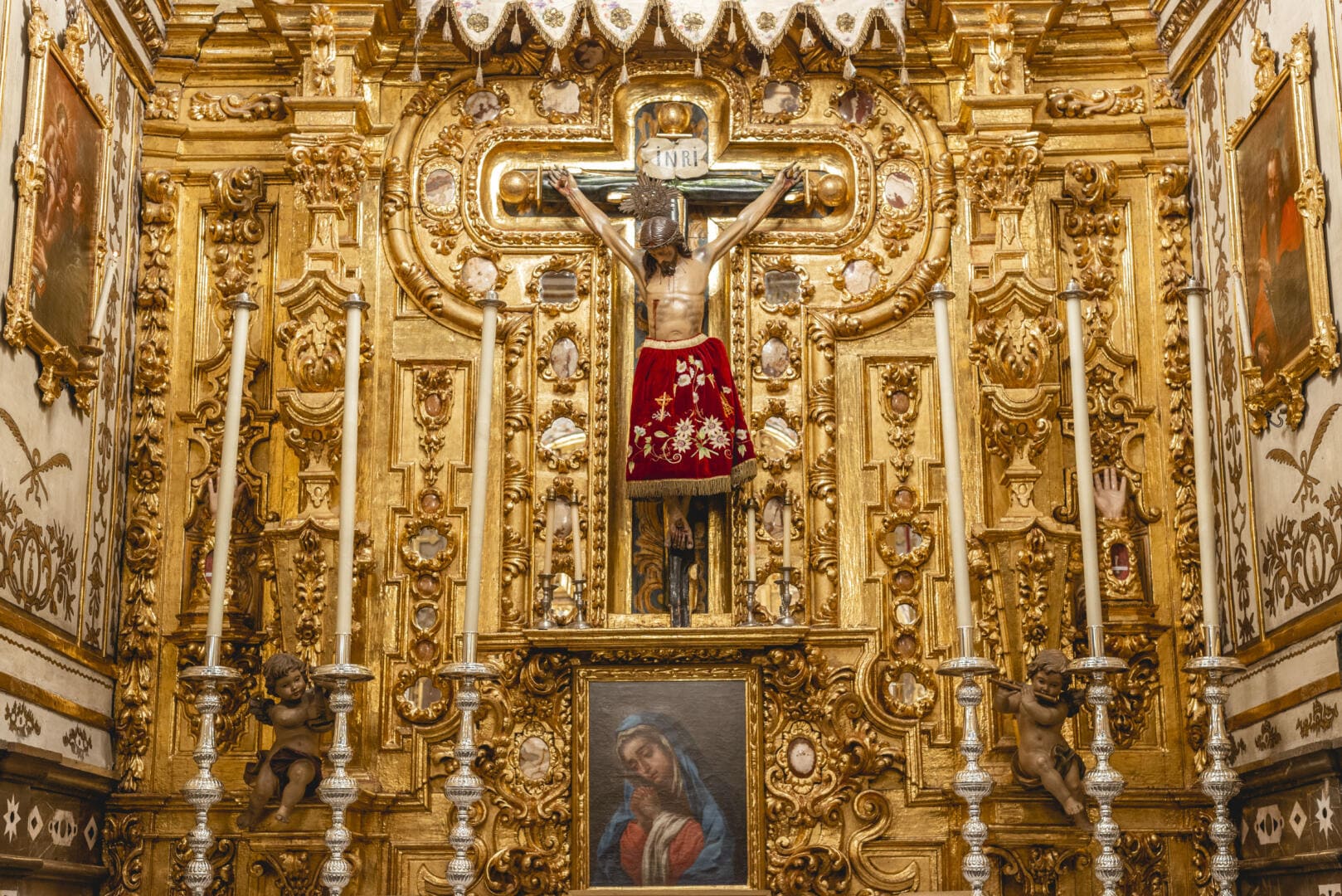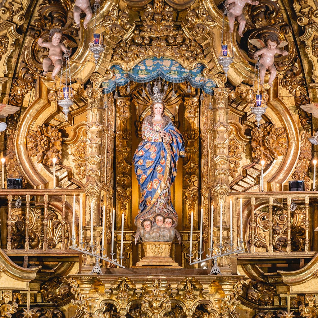 El interior se caracteriza por una gran riqueza ornamental: abundancia de dorados, tallas, relieves, policromía, frescos y espejos en el camarín que resguardan las reliquias del santo.