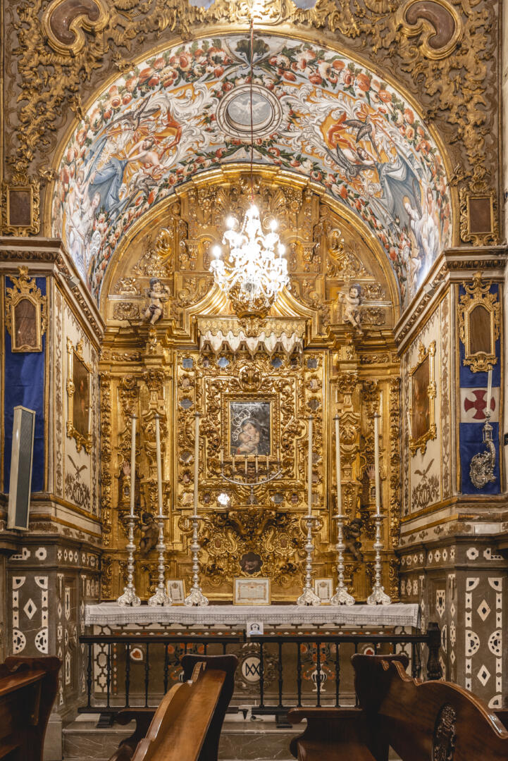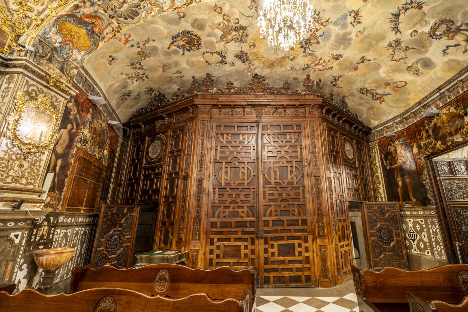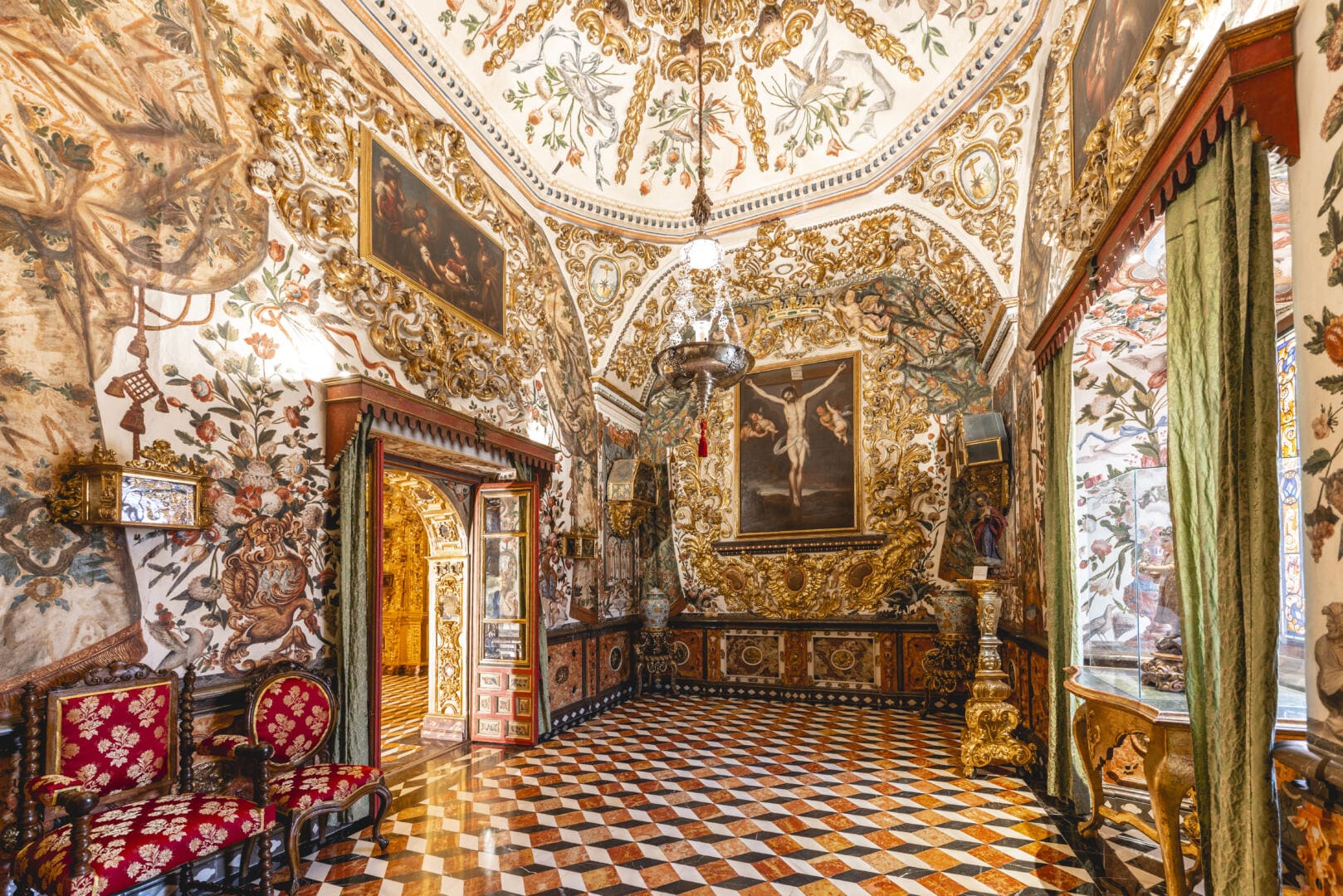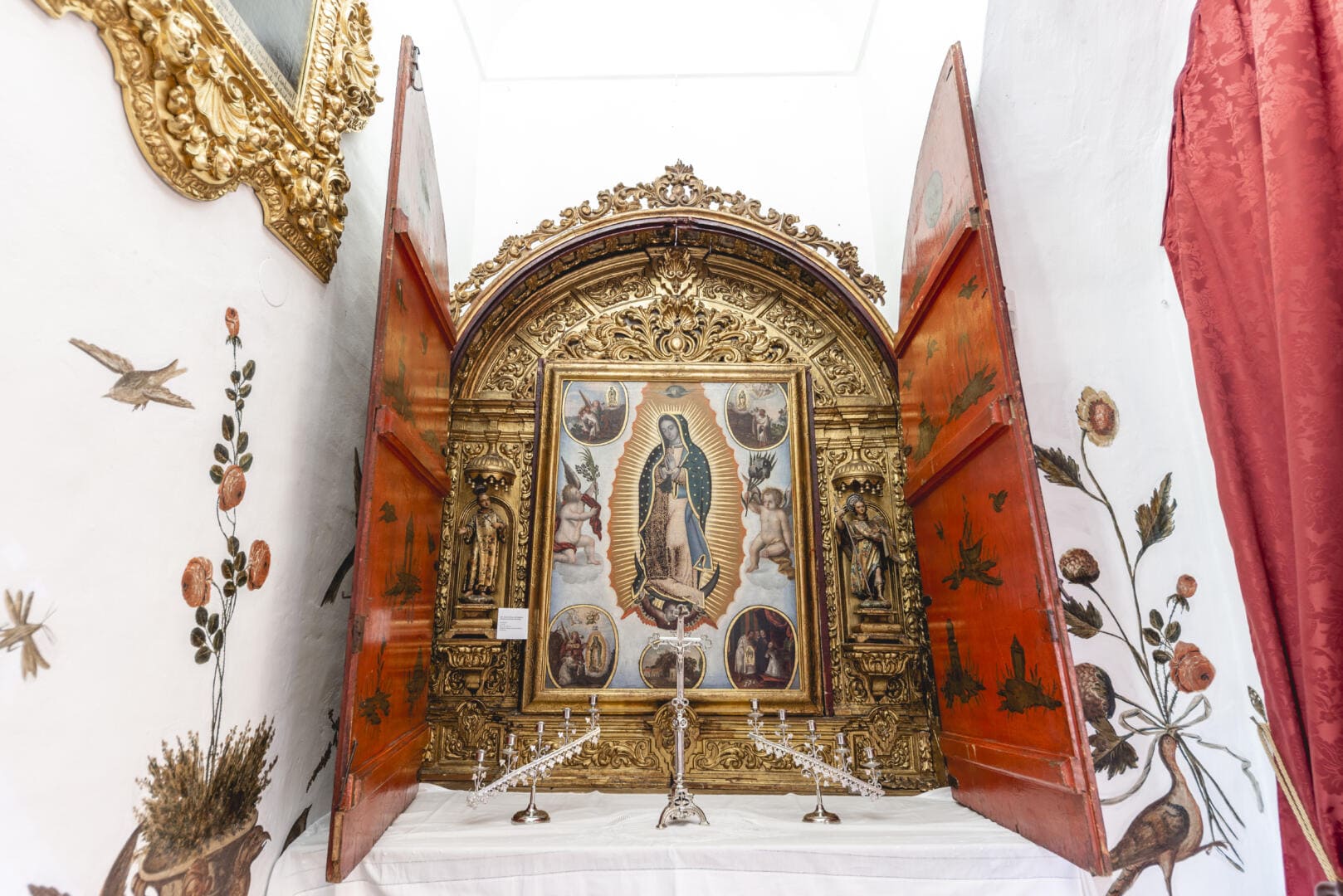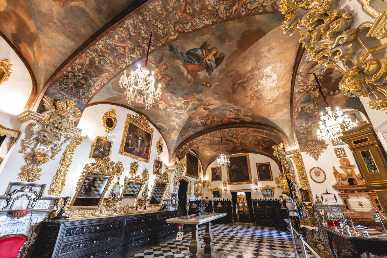 El interior se caracteriza por una gran riqueza ornamental: abundancia de dorados, tallas, relieves, policromía, frescos y espejos en el camarín que resguardan las reliquias del santo.
