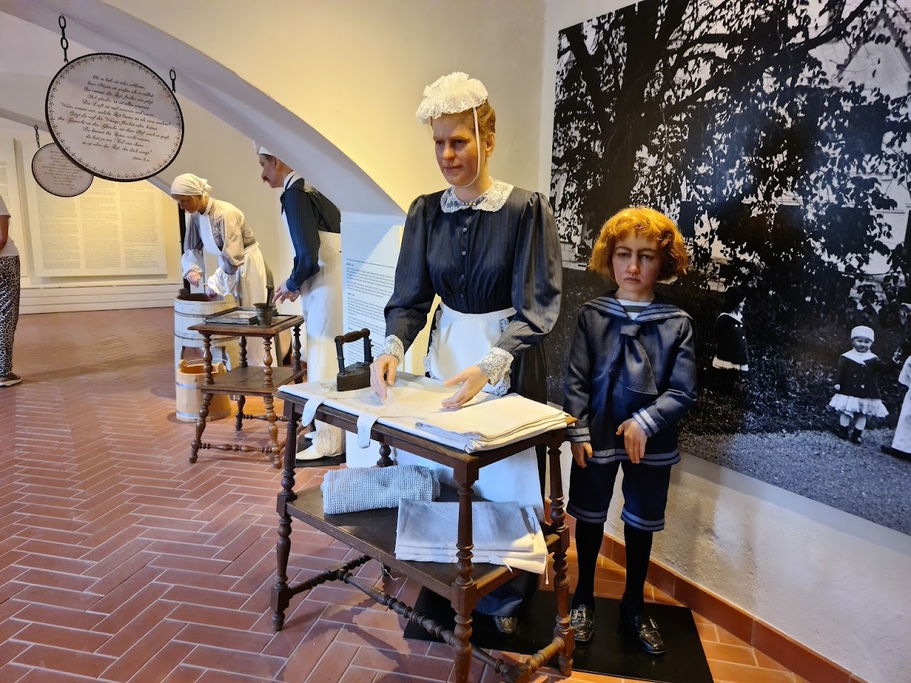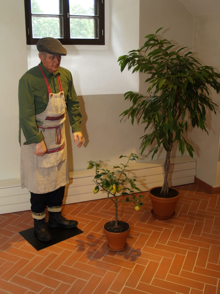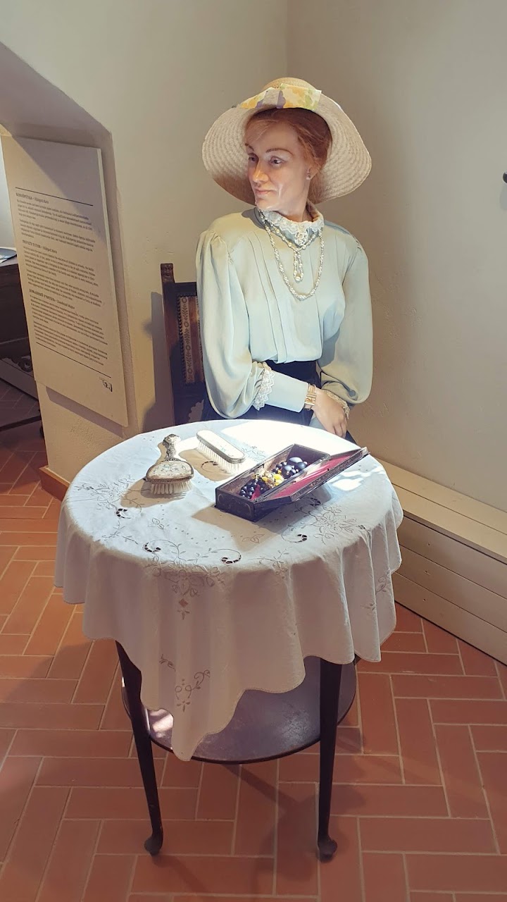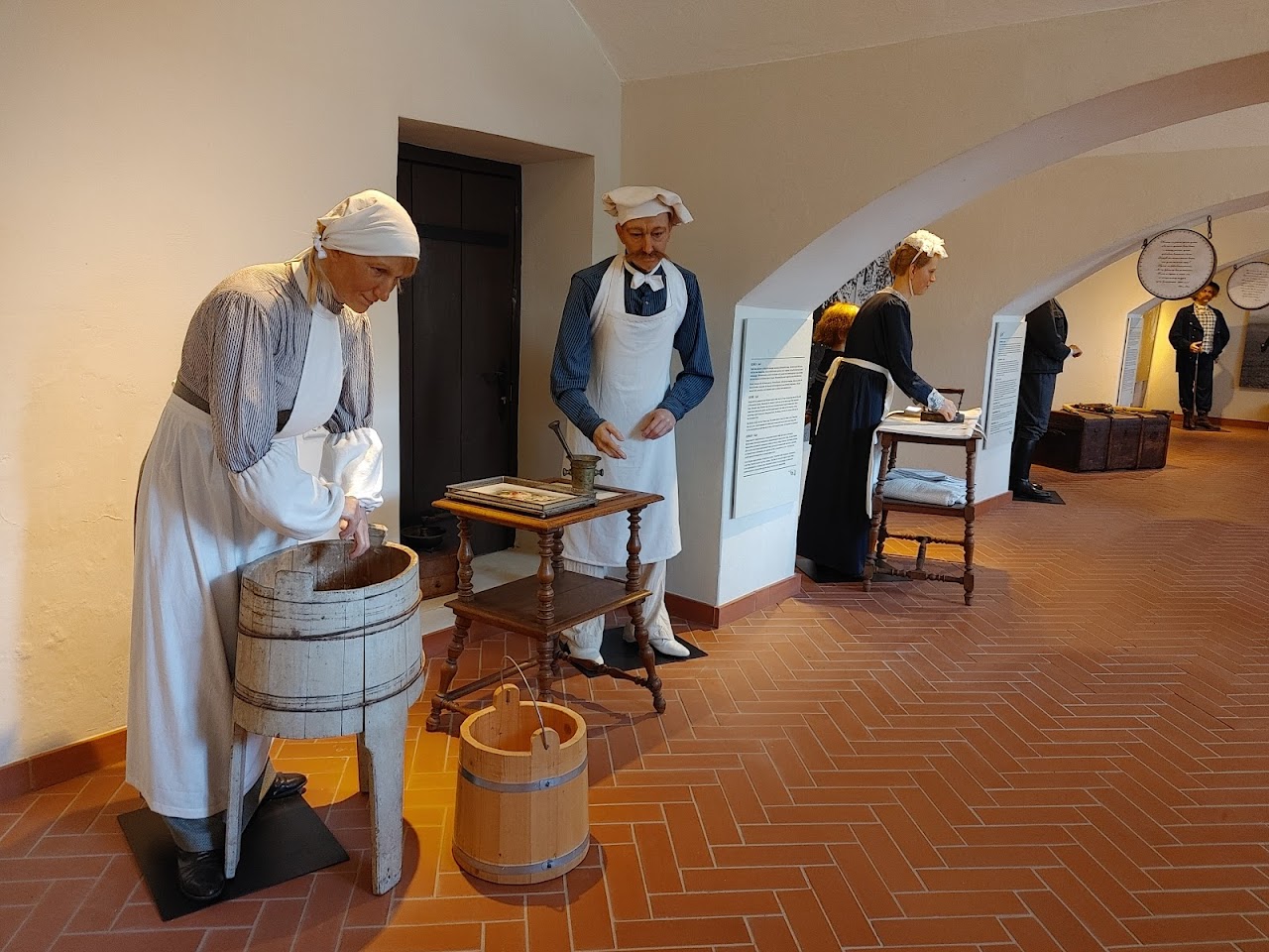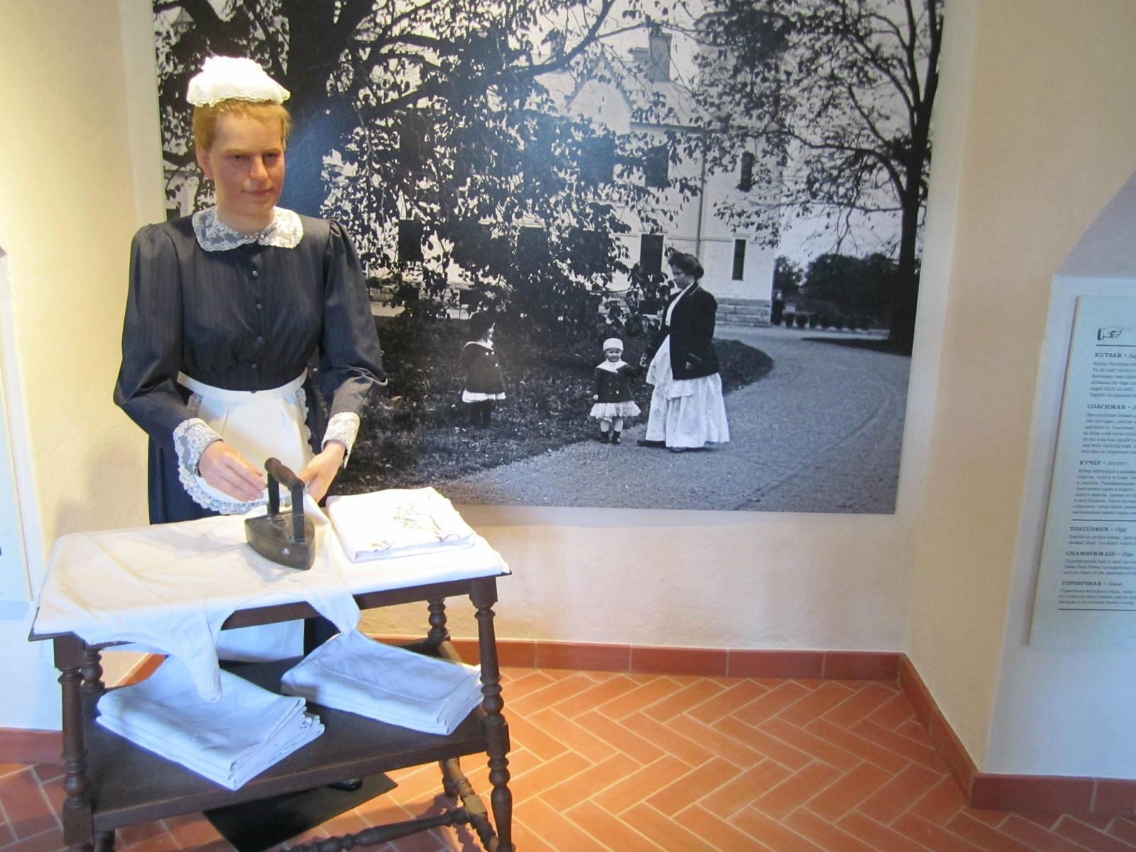 En el sótano del Alatskivi Castle se encuentra una exposición de figuras de cera que representa los oficios tradicionales de una finca señorial del siglo XIX. La muestra recrea escenas de la vida cotidiana del personal de servicio que trabajaba en la mansión, mostrando personajes como el mayordomo (butler), el ama de llaves (housekeeper), la cocinera (cook), el panadero (baker), la doncella (maid), la lavandera (laundress), el jardinero (gardener), el cochero (coachman) y el mozo de cuadra (stableman). También aparece el administrador de la finca (estate manager o steward), encargado de supervisar el funcionamiento general de la propiedad. Esta exposición permite comprender mejor cómo funcionaba la organización del trabajo y la vida diaria en una gran finca aristocrática del Báltico.