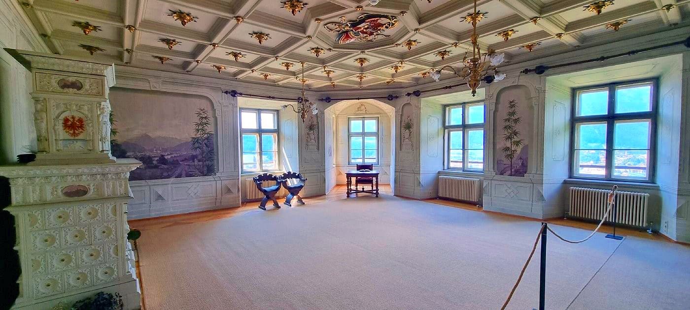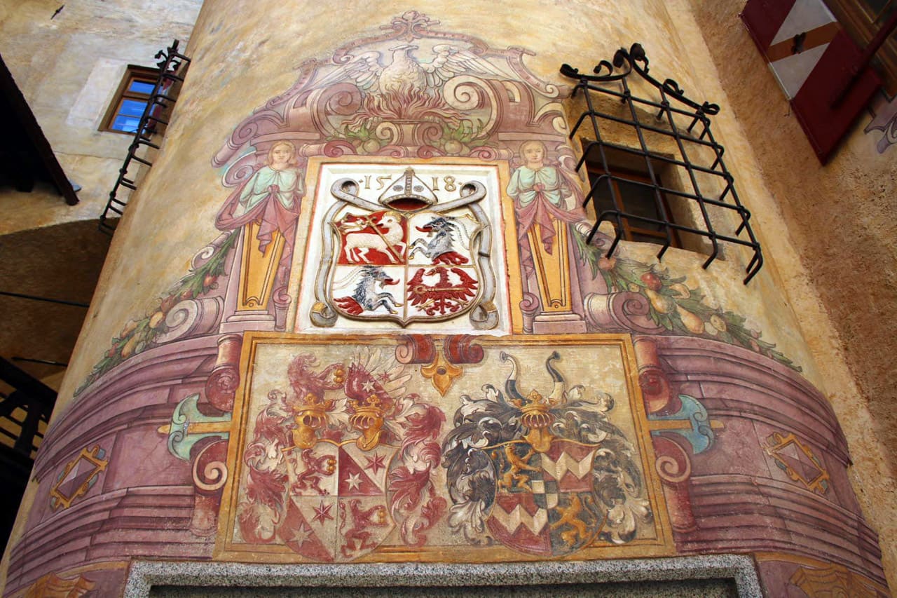 También merecen atención las vidrieras con el escudo de los Habsburgo (el águila negra de dos cabezas), el del Tirol (el águila roja) y el escudo del obispo Simon Aichner (el cordero, el águila con el báculo, la flecha y el ancla), bajo el cual se restauró el castillo en 1900.