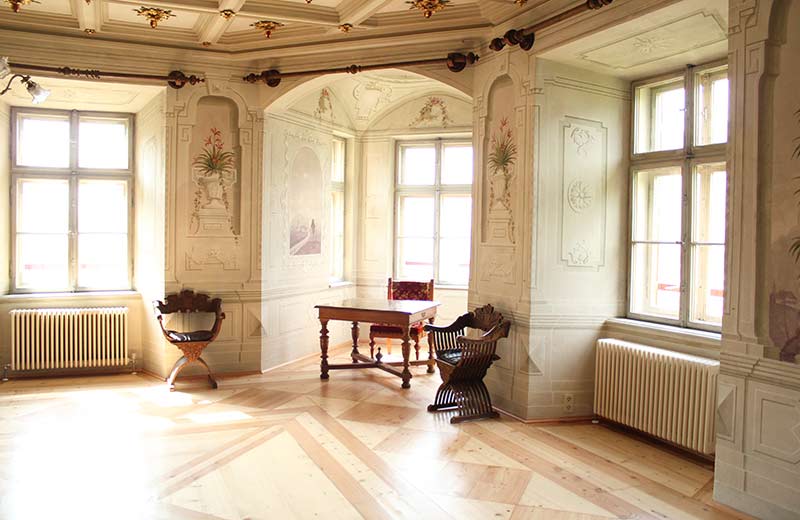 Las habitaciones del obispo (salón, salas de conferencias, dormitorio) fueron completamente renovadas durante la última restauración de 1900 según el gusto de la época. Son habitaciones amplias y luminosas y ofrecen una vista panorámica de la ciudad de Brunico. Hasta los años 50, durante los meses de verano, acogían a los obispos de Bressanone. En el salón destaca un bonito techo artesonado con el escudo de los condes/obispos von Spaur y un suelo decorado con tallas de madera (la fecha 1900 y las letras A y S del obispo Simon Aichner). También son muy bonitas las estufas de estuco, una en cada habitación. Las paredes están decoradas con pinturas de un estilo muy poco común en la zona; a excepción de un cuadro, que representa la ciudad de Bressanone, todos los demás son paisajes fantásticos.