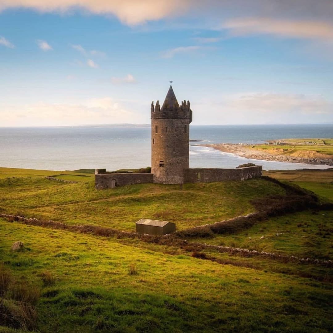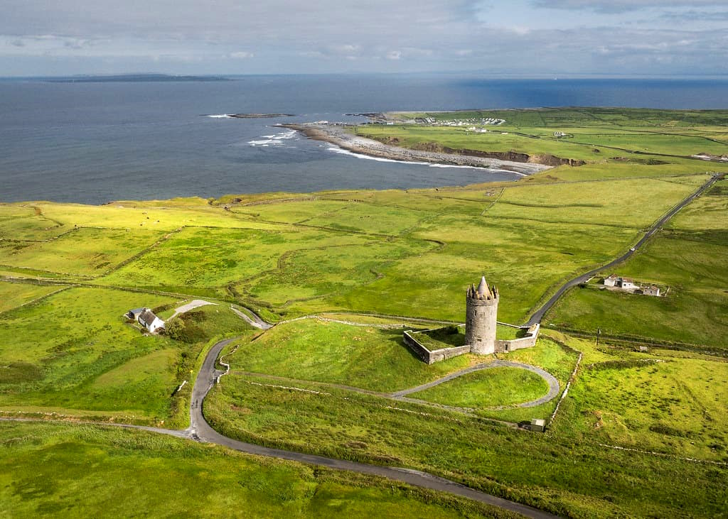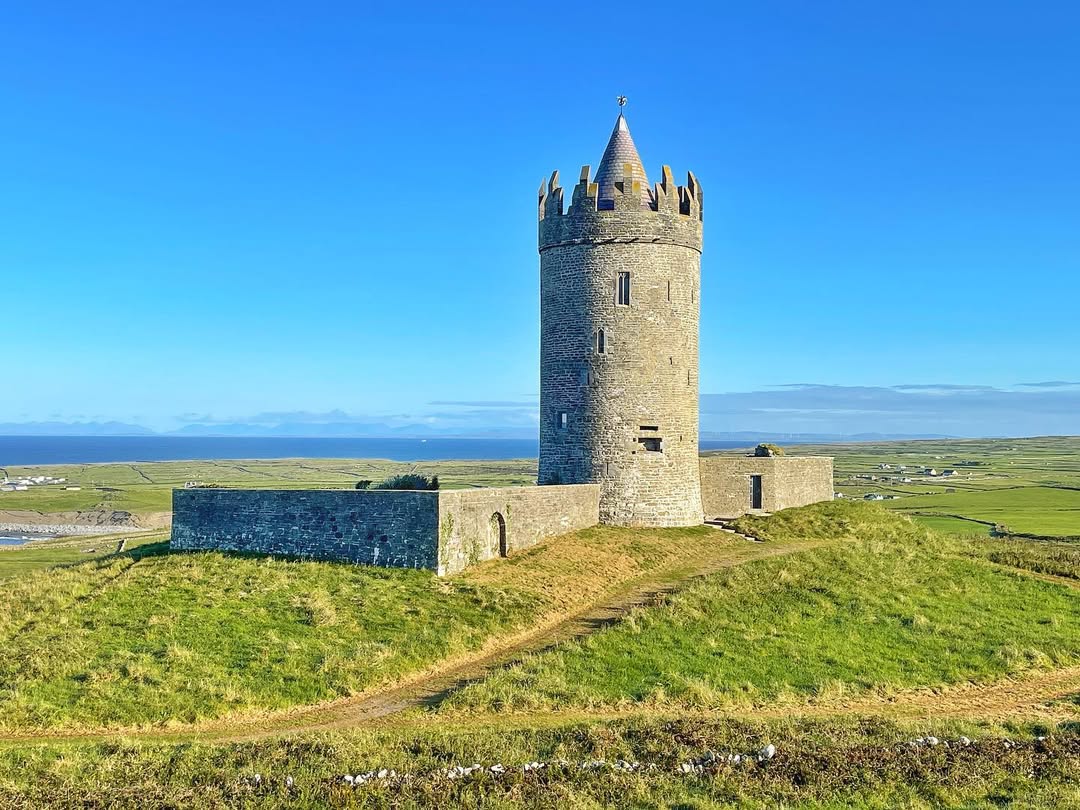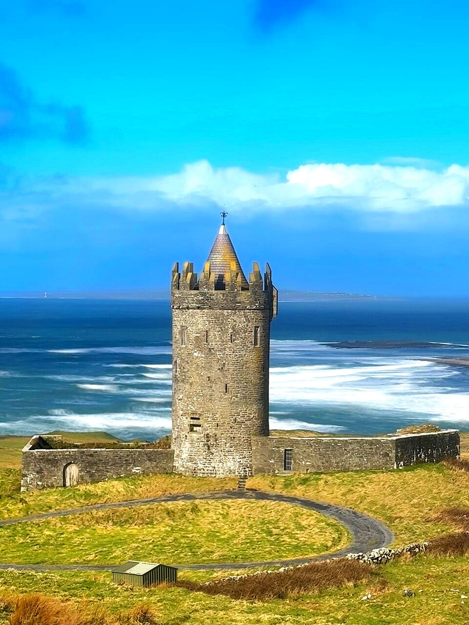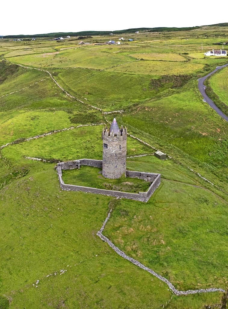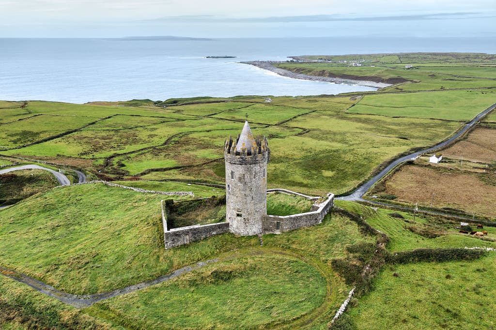 Doonagore —posiblemente derivado del irlandés Dún na Gabhair, “fortaleza de las cabras” o “del cerro redondeado”— es una torre cilíndrica del siglo XVI situada sobre las colinas que dominan Doolin, en el condado de Clare. Construida principalmente en arenisca, destaca por su posición estratégica sobre el Atlántico, utilizada históricamente como referencia para la navegación hacia el muelle de Doolin.