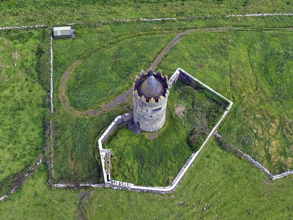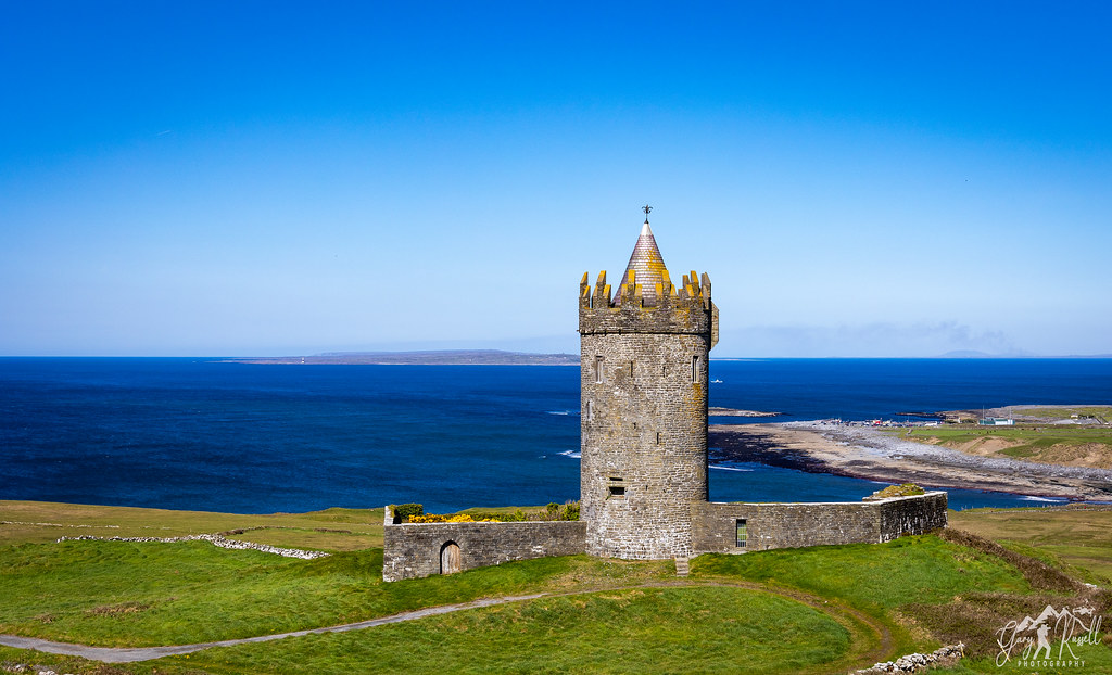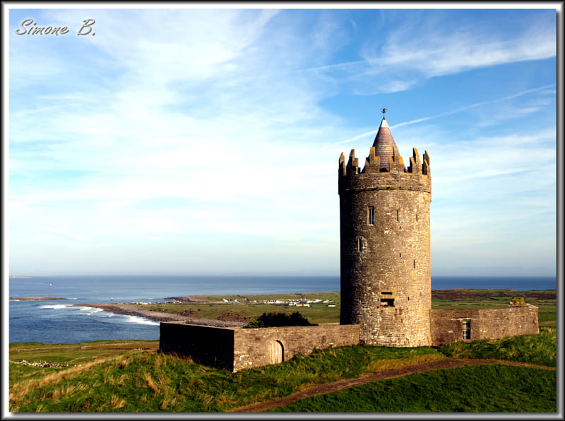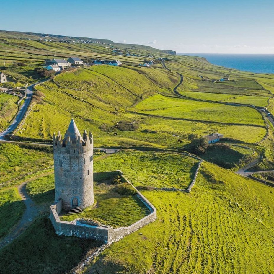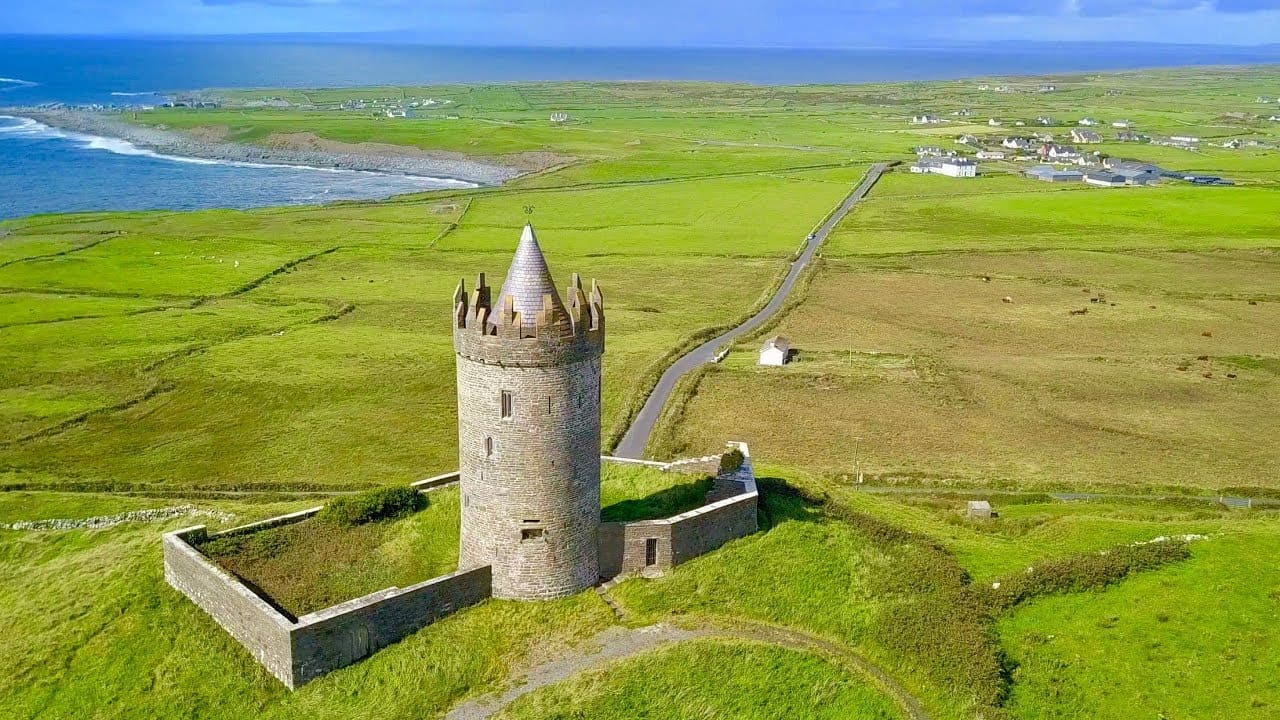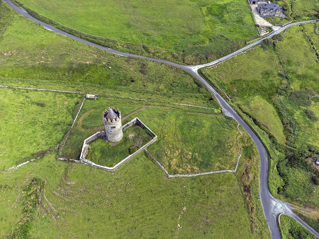 Doonagore —posiblemente derivado del irlandés Dún na Gabhair, “fortaleza de las cabras” o “del cerro redondeado”— es una torre cilíndrica del siglo XVI situada sobre las colinas que dominan Doolin, en el condado de Clare. Construida principalmente en arenisca, destaca por su posición estratégica sobre el Atlántico, utilizada históricamente como referencia para la navegación hacia el muelle de Doolin.