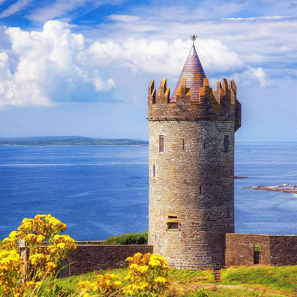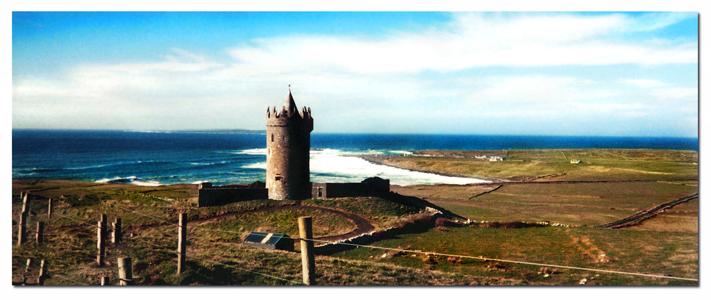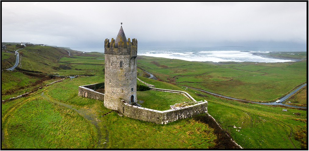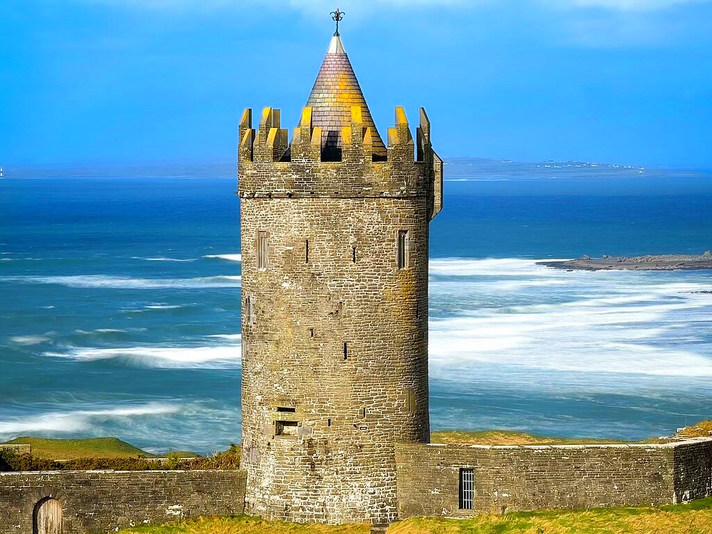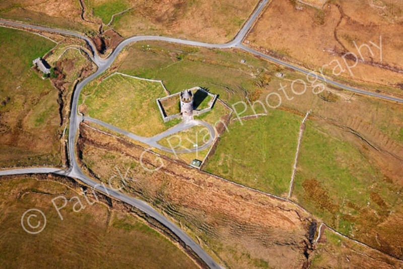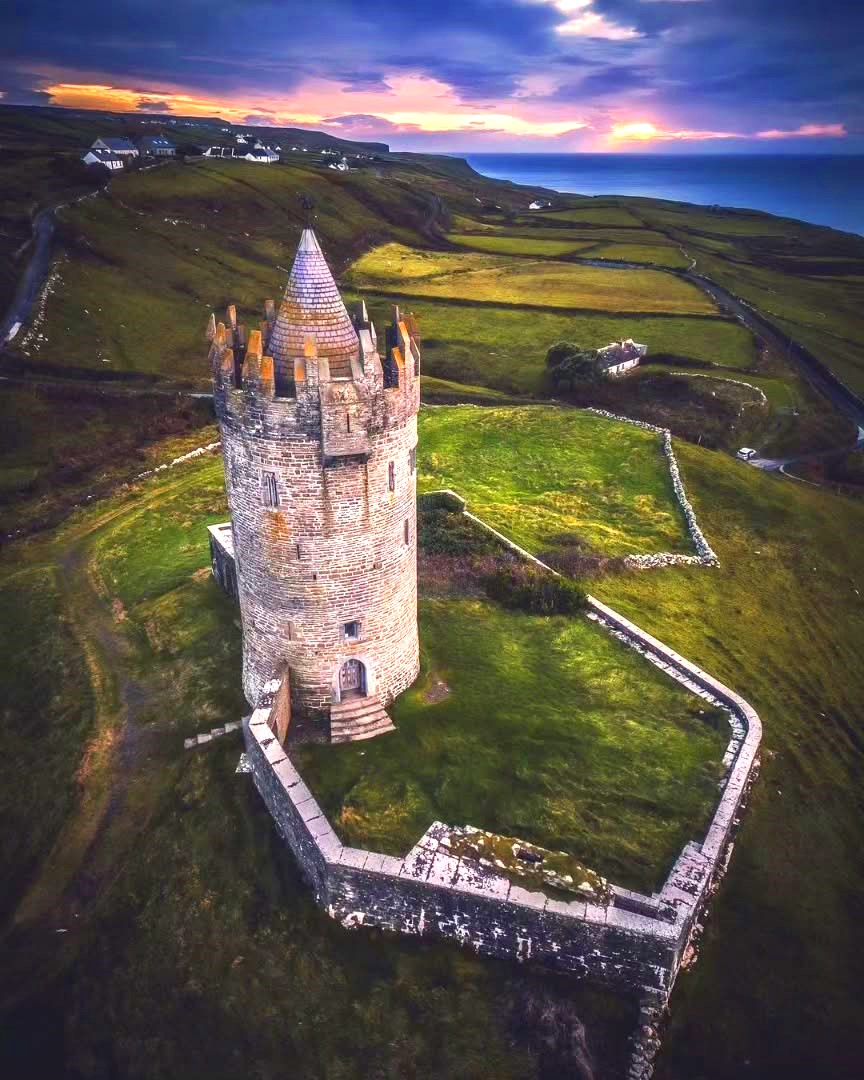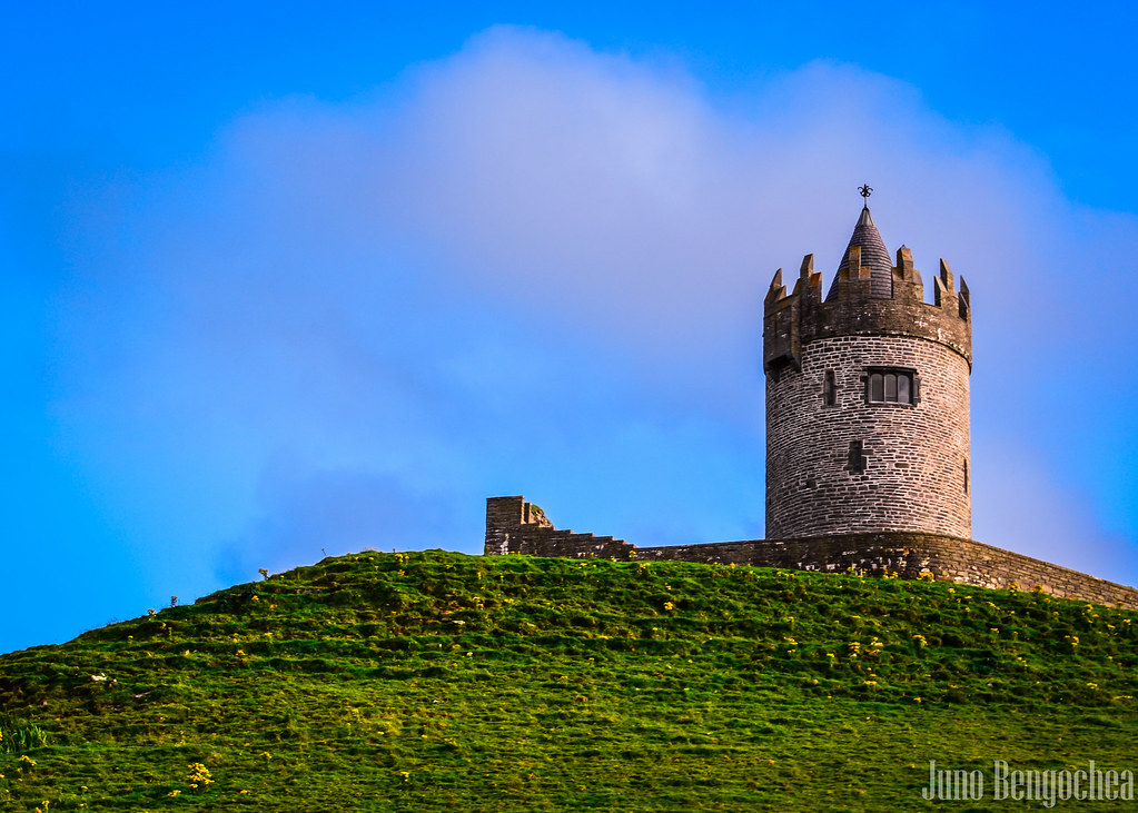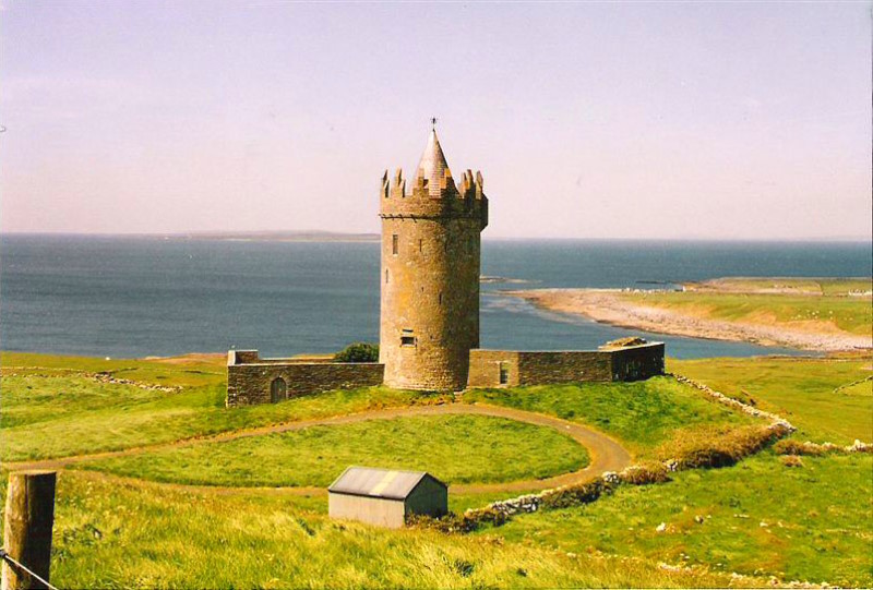 Doonagore —posiblemente derivado del irlandés Dún na Gabhair, “fortaleza de las cabras” o “del cerro redondeado”— es una torre cilíndrica del siglo XVI situada sobre las colinas que dominan Doolin, en el condado de Clare. Construida principalmente en arenisca, destaca por su posición estratégica sobre el Atlántico, utilizada históricamente como referencia para la navegación hacia el muelle de Doolin.