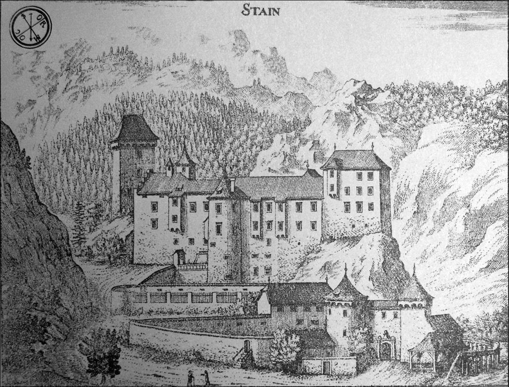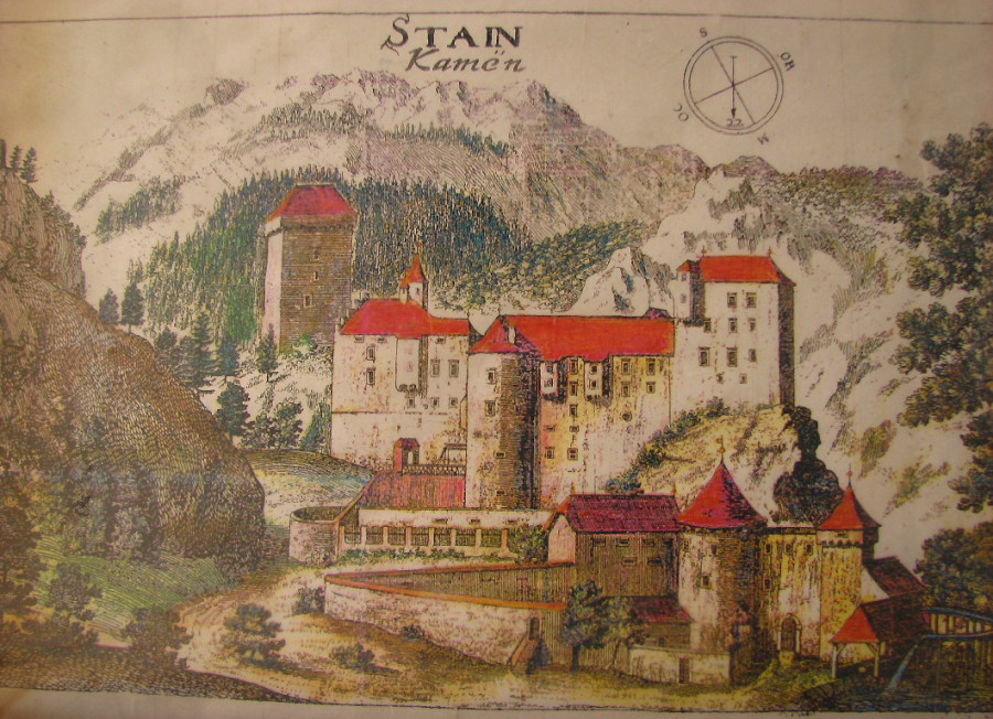 En 1185, una fuente histórica menciona al caballero Leocardis de Antro, y en 1263 el castillo aparece como castrum Lapis y solo en 1350 como vest czem Stain, cuando Enrique III de Ortenburg lo adquirió junto con el castillo de Zijalka, sobre Begunje, y cuatro castillos. El castillo y la finca fueron inicialmente propiedad de los Ortenburgo, que no residían en él, sino que lo administraban con la ayuda de castellanos o castellaneros. El castillo era un importante punto de control, ya que protegía la antigua ruta de transporte desde Bohinjsko kot y el valle del Alto Sava, pasando por Prevalo hacia Tržič y el hospicio de Podljubelj hasta Carintia.