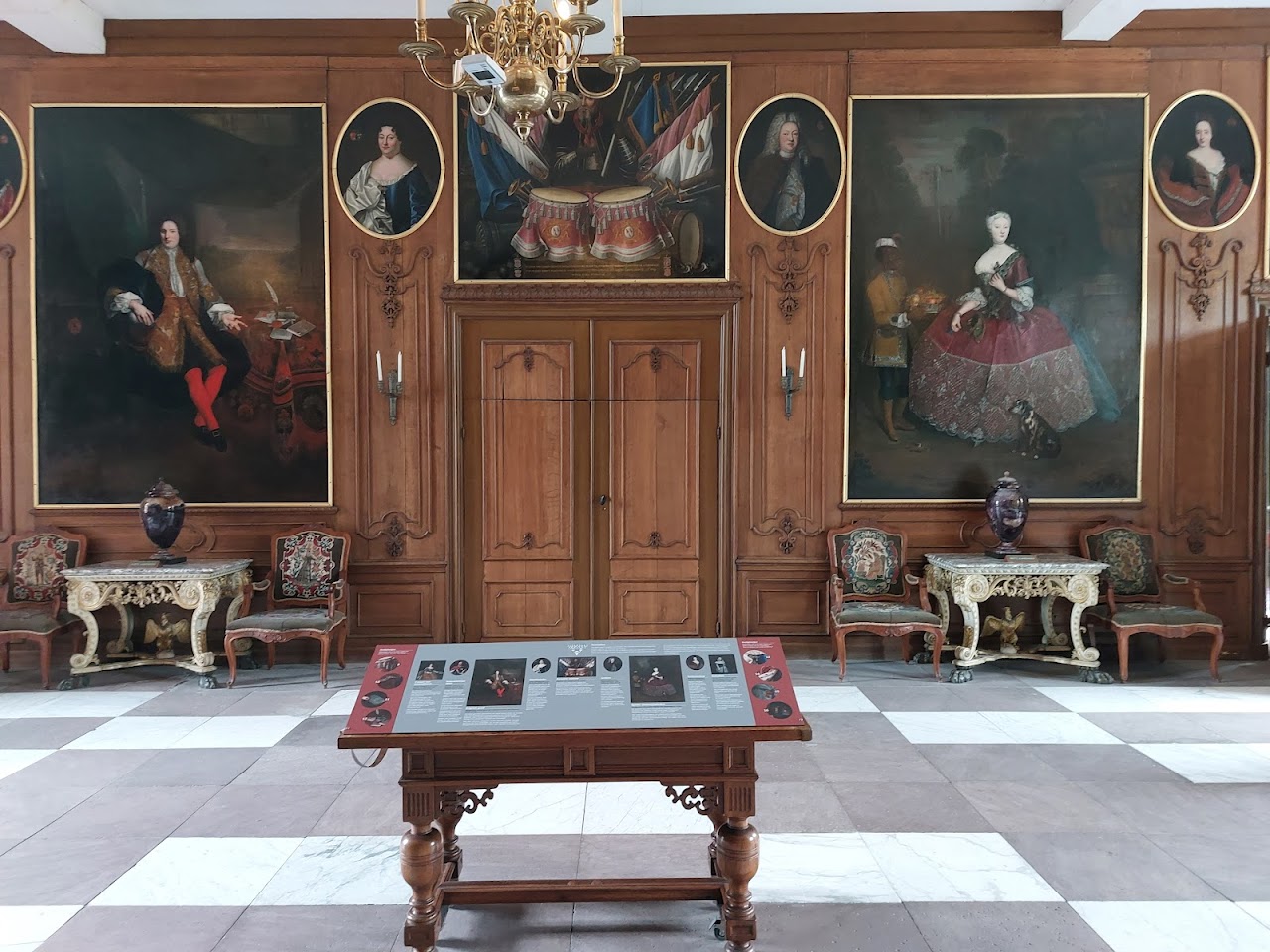 El interior del castillo ha conservado con fidelidad elementos históricos, con salas que reflejan la evolución estética desde el barroco hasta el rococó. También hay partes del interior trasladadas desde otras residencias nobiliarias en el siglo XIX.
