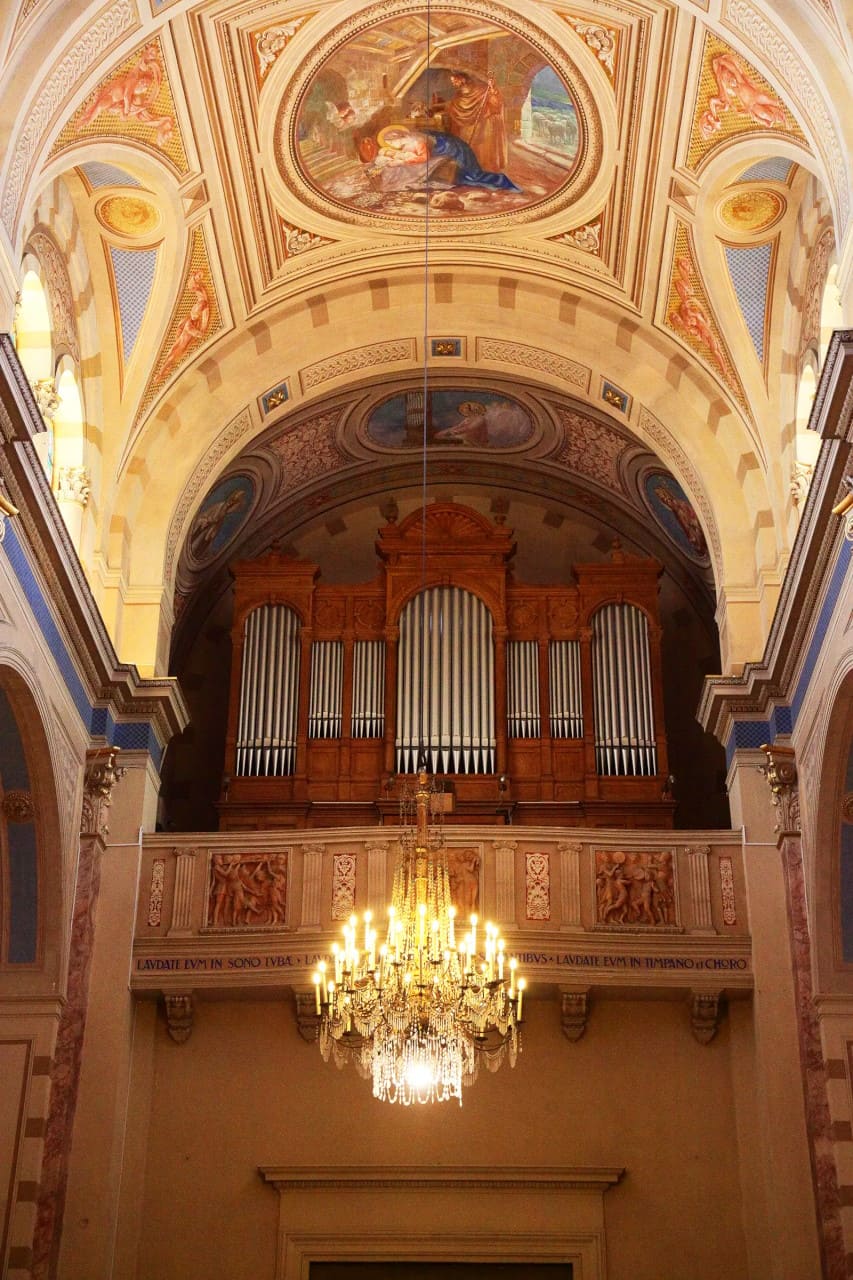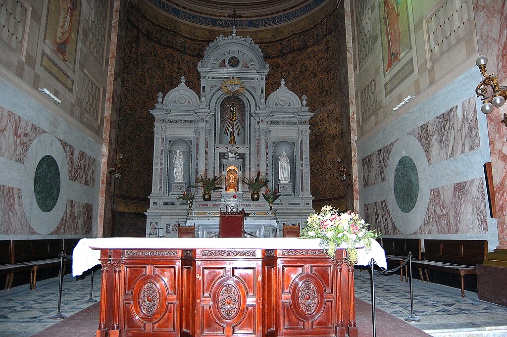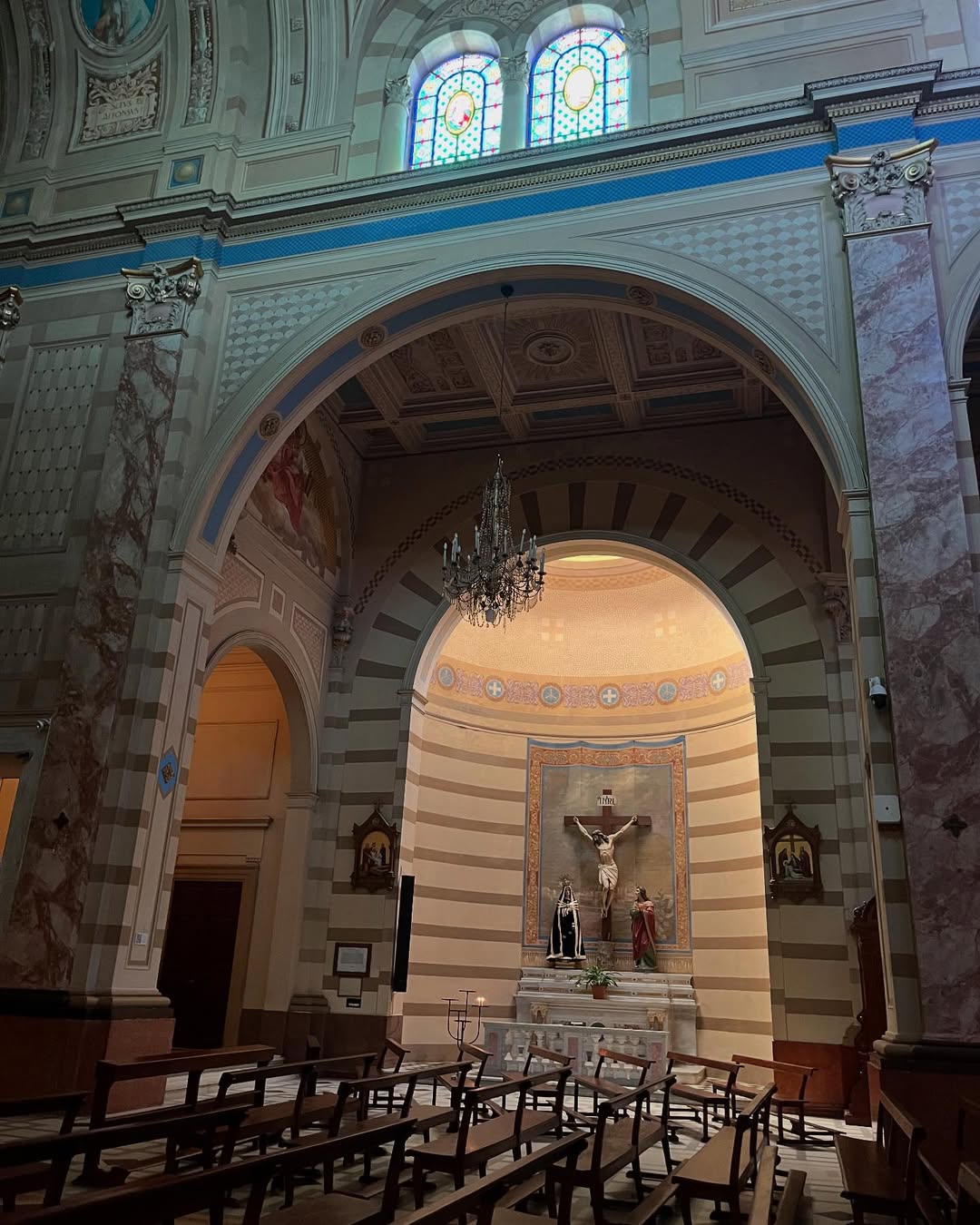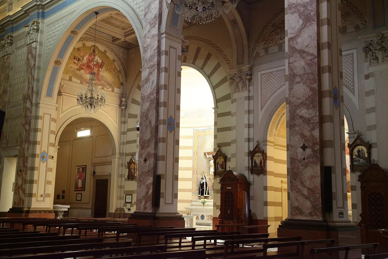 La basílica, de estilo neorrenacentista con influencia grecorromana, se eleva en un lugar destacado de la ciudad y está flanqueada por dos torres de 60 metros de altura coronadas con cúpulas de azulejos blancos y azules.