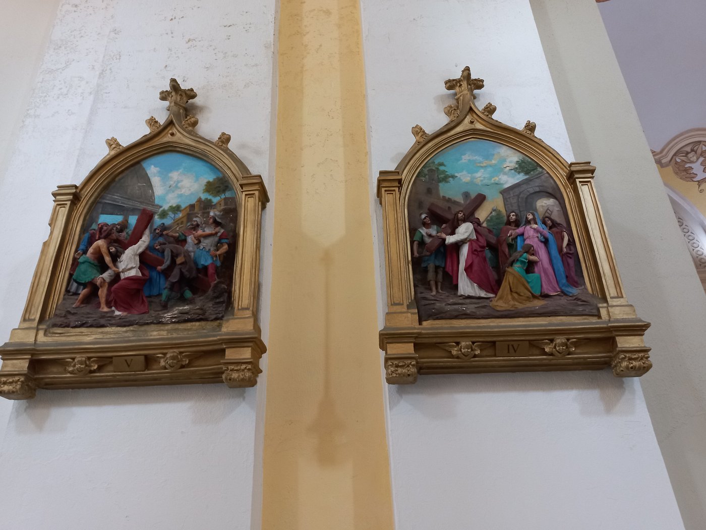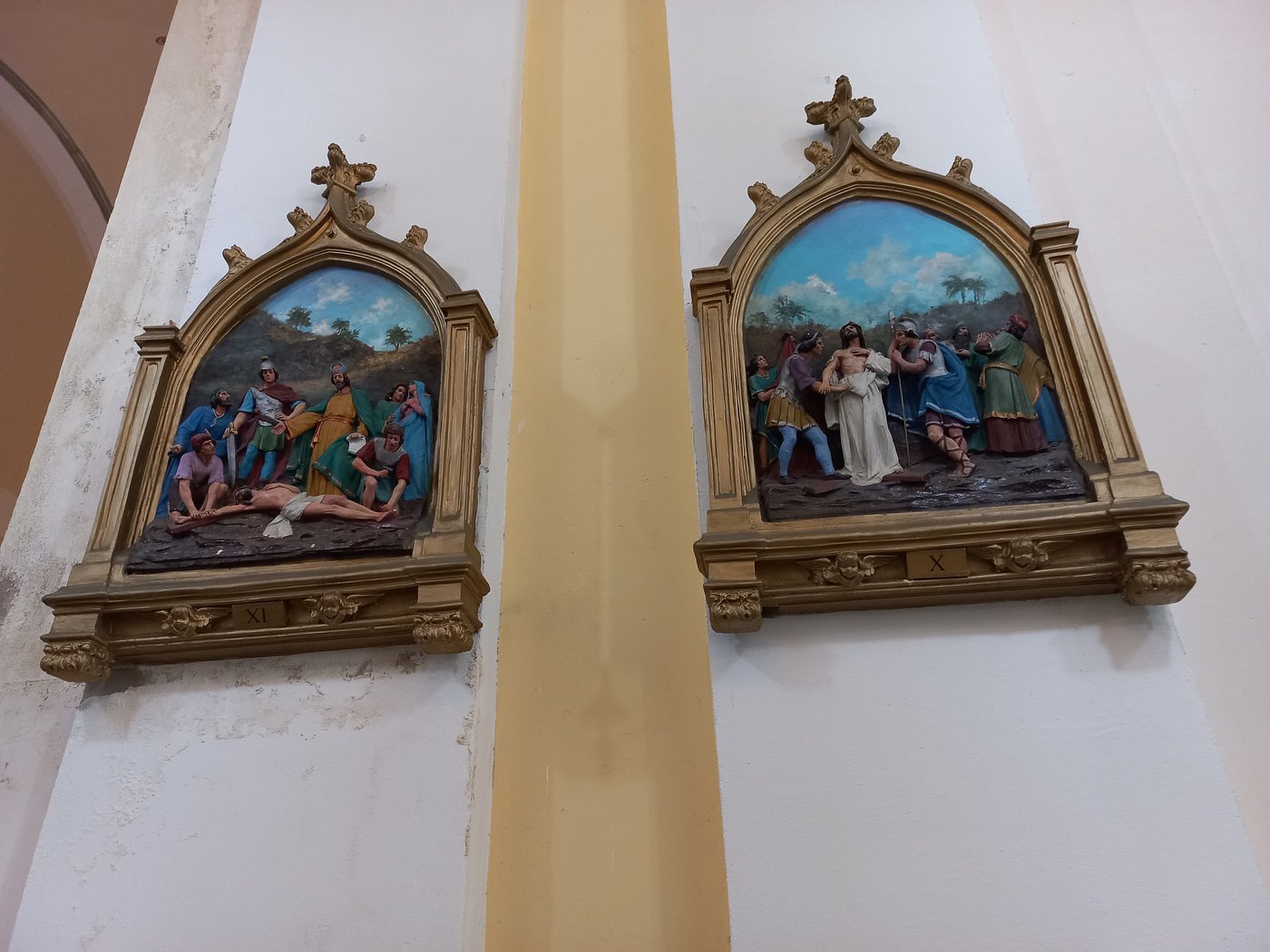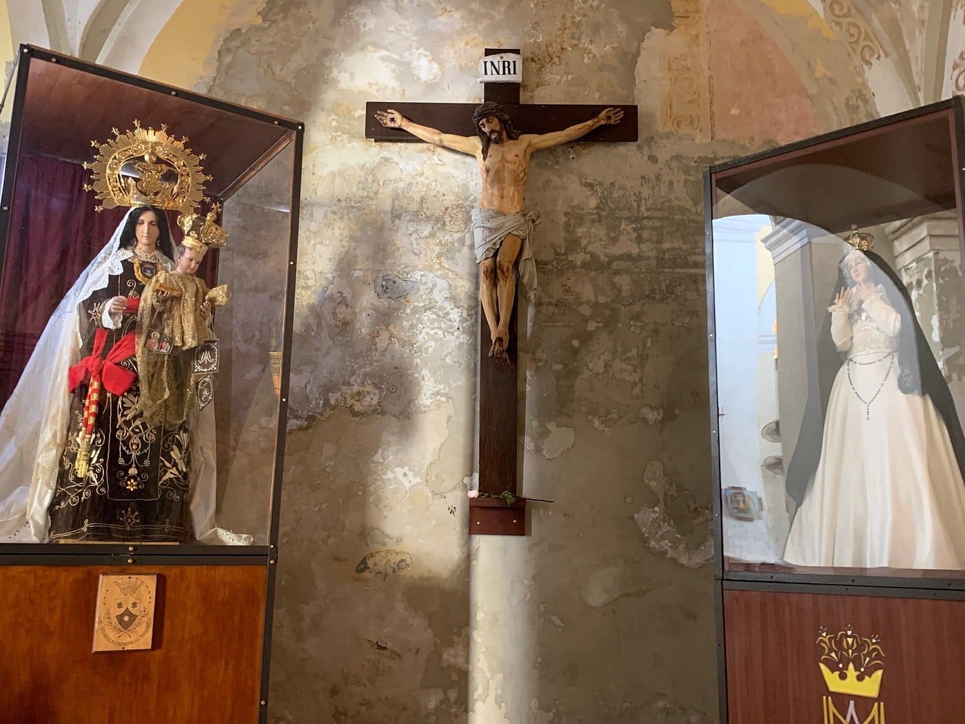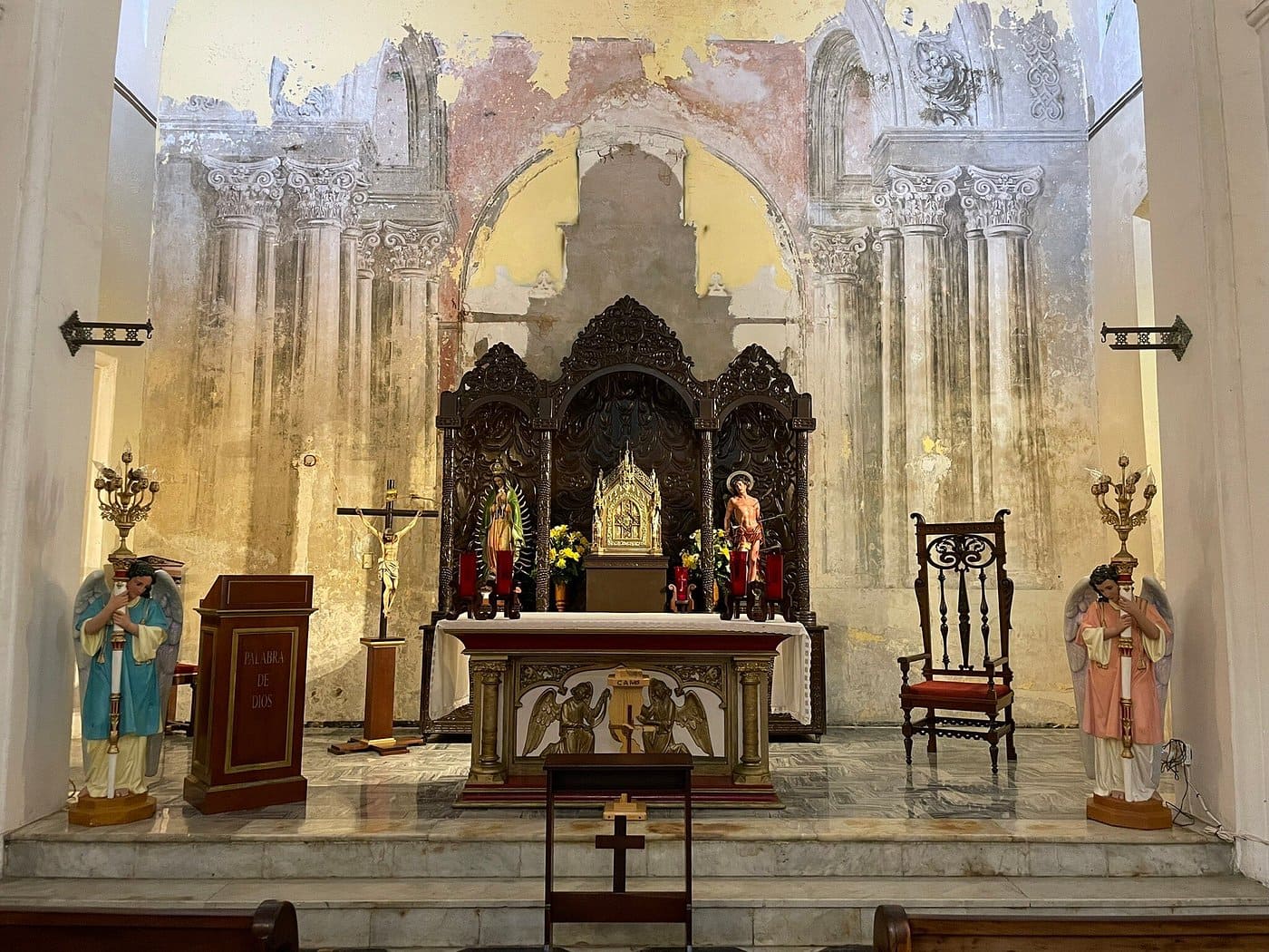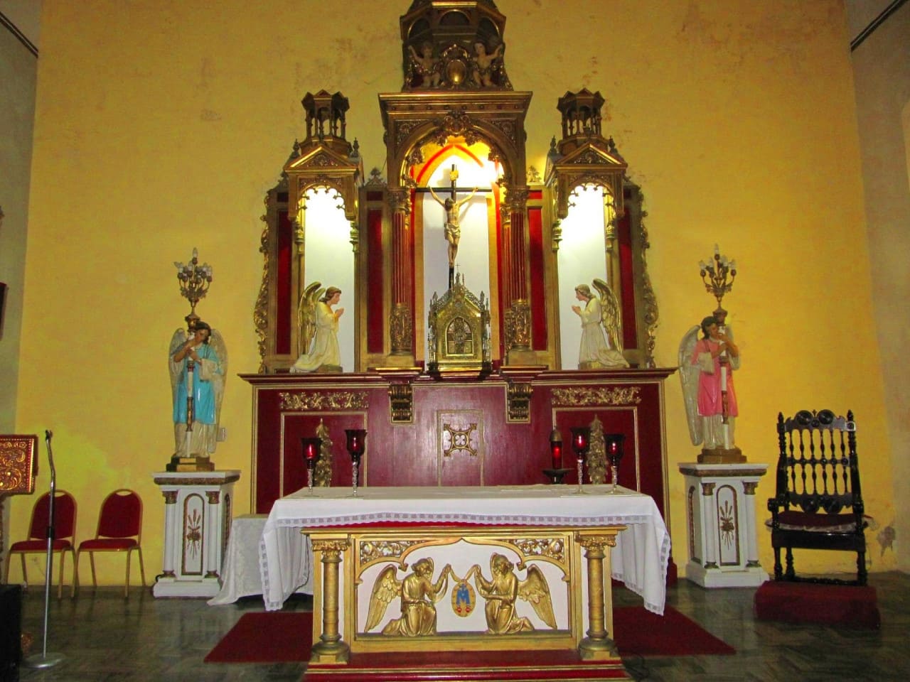 El altar mayor está presidido por un Cristo crucificado, acompañado por imágenes de San Juan Bautista y la Virgen de los Remedios, reafirmando la dedicación del templo.