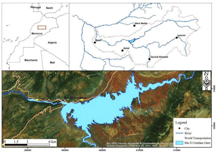 El embalse de Bin el Ouidane se encuentra en el uadi El Abid, el afluente más importante del río Oum Er-Rbia, en la provincia de Azilal, región de Beni Melal-Jenifra, en Marruecos, a 28 kilómetros al sur de Beni Melal. La presa fue diseñada por la empresa francesa Coyne y Bellier, con un doble objetivo: la producción de energía eléctrica y el regadío.