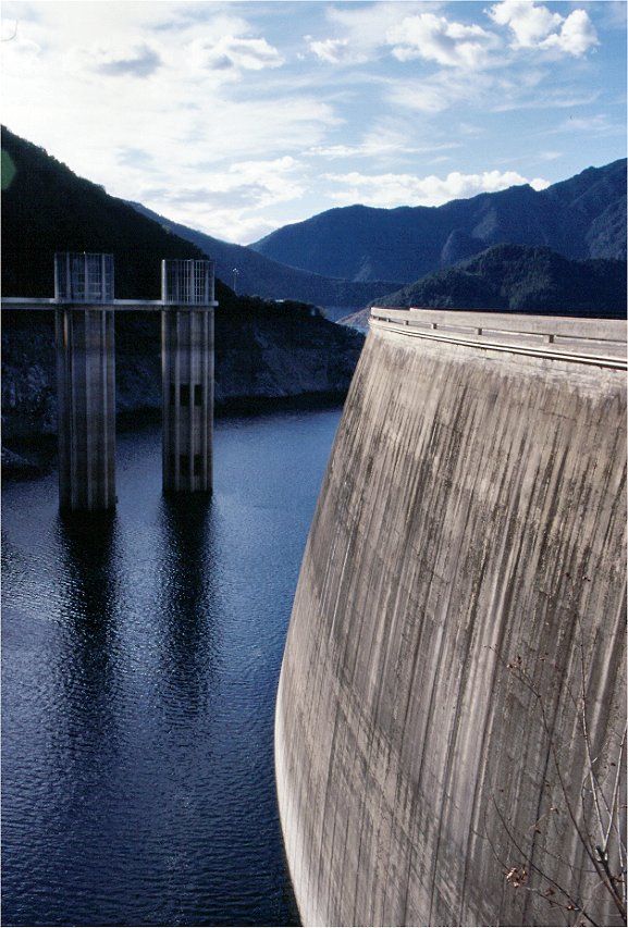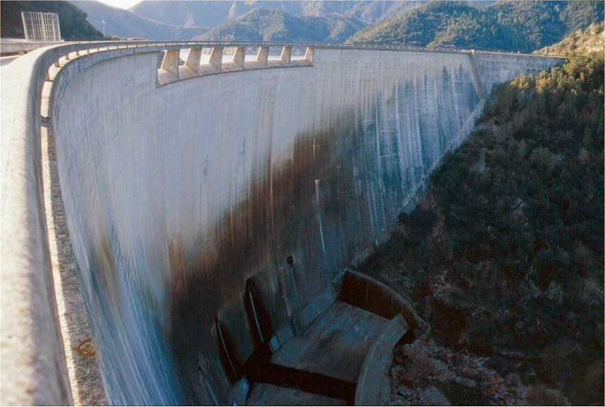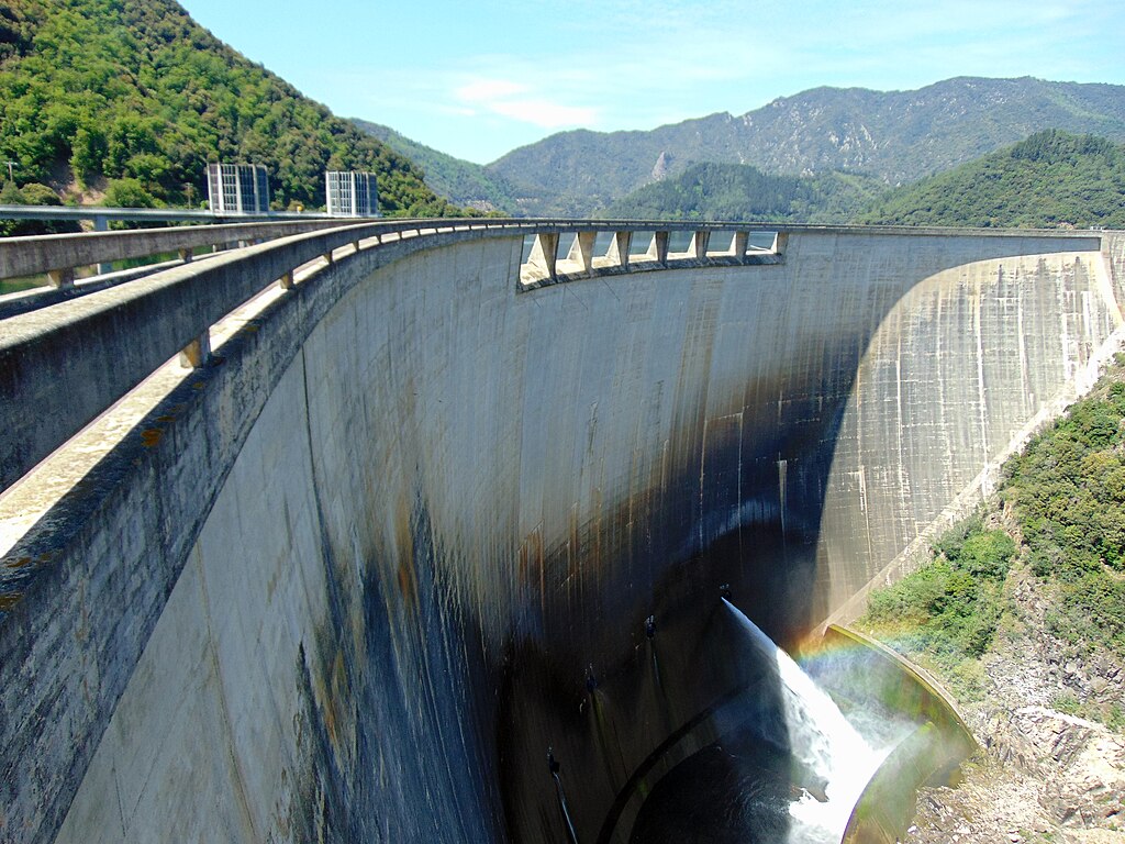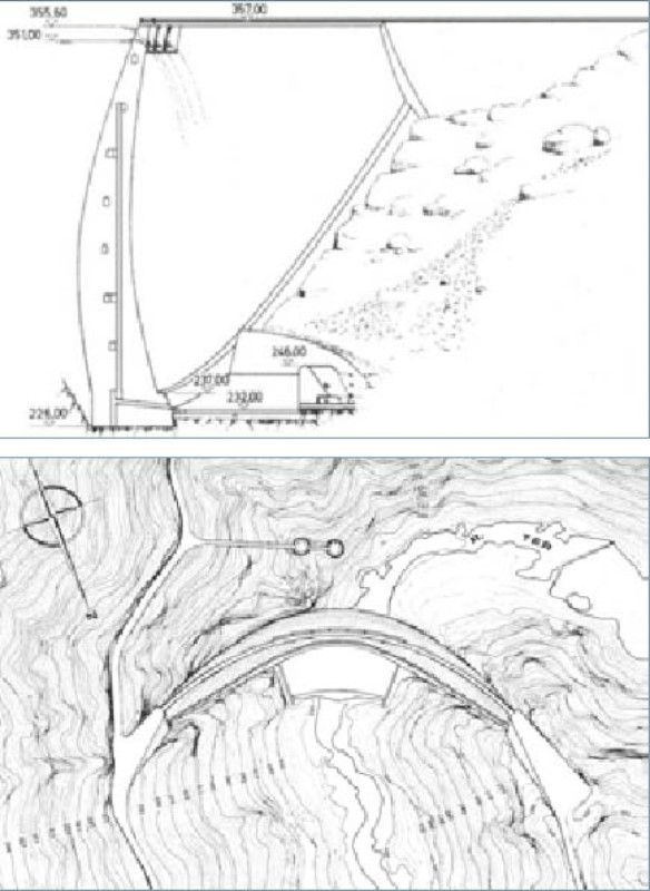 La presa es de tipo bóveda de doble curvatura, un diseño que distribuye las presiones del agua hacia los estribos de la montaña, reduciendo la cantidad de hormigón necesaria.