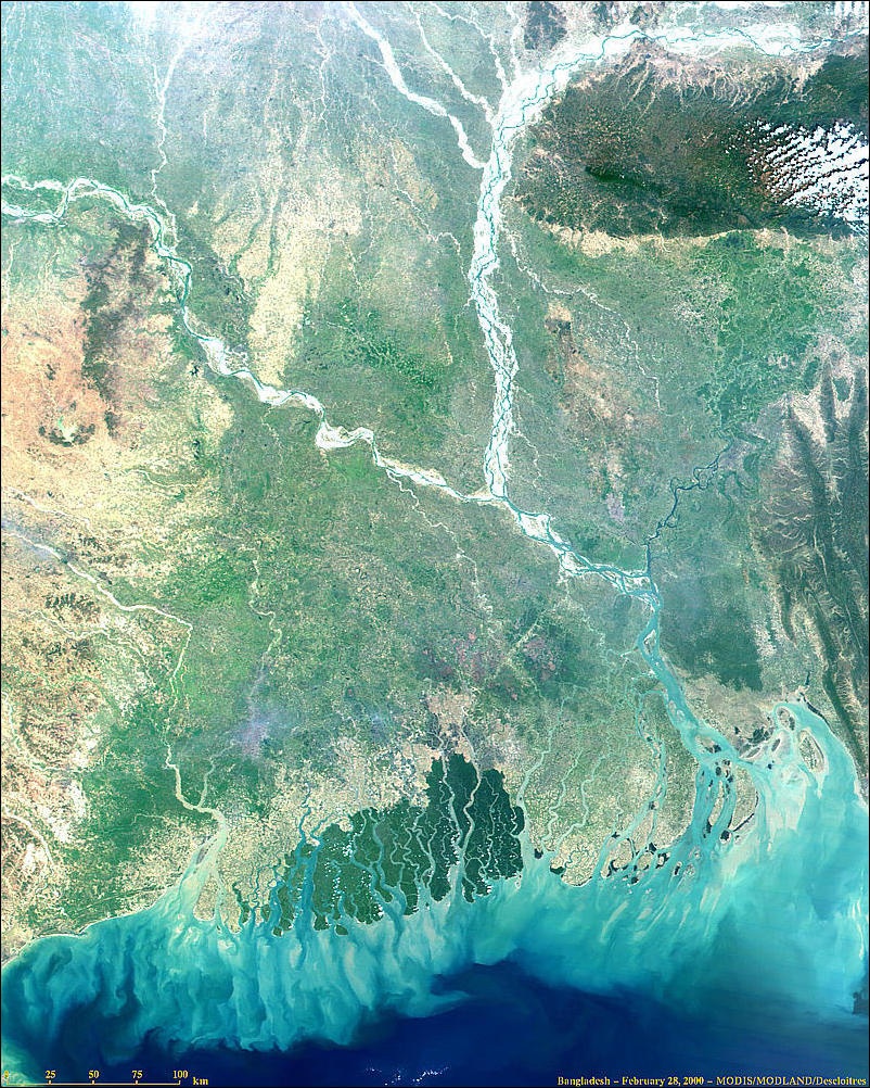 La entrada del río en Bangladesh marca una maraña de relaciones con algunos grandes ríos, como el Jamuna o el Meghna, los dos mayores afluentes del Brahmaputra. El Ganges se desparrama en un gran delta de 350 kilómetros de ancho, y muere finalmente en la Bahía de Bengala. Sólo dos ríos, el Amazonas y el Congo, transportan un flujo acuático mayor que el sistema de los ríos Ganges, Brahmaputra y Surma-Meghna.