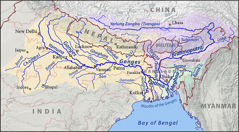 De todos los ríos del subcontinente indio, el Ganges, por cultura y tradición, es el más significativo. Fluye por las llanuras gangáticas del norte de la India hacia Bangladesh, desde su nacimiento en los Himalayas occidentales, en la región política india de Uttarakhand. Culmina un largo viaje de 2.510 kilómetros hasta llegar al delta de Sundarbans, en la bahía de Bengala. Durante mucho tiempo ha sido considerado un río sagrado por los hindúes, y ha sido objeto de culto, entendido como una encarnación de la diosa Ganga. También ha sido importante históricamente: muchas antiguas capitales provinciales o imperiales (como Pataliputra, Kannauj, Kara, Allahabad, Murshidabad o Calcuta) fueron edificadas en sus bancos. El Ganges y sus ríos afluentes riegan una cuenca de un millón de kilómetros cuadrados que sirve como base alimenticia a millones de personas, con una de las mayores densidades de población del mundo.