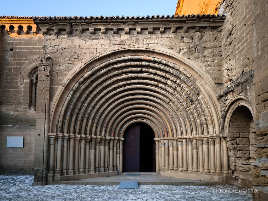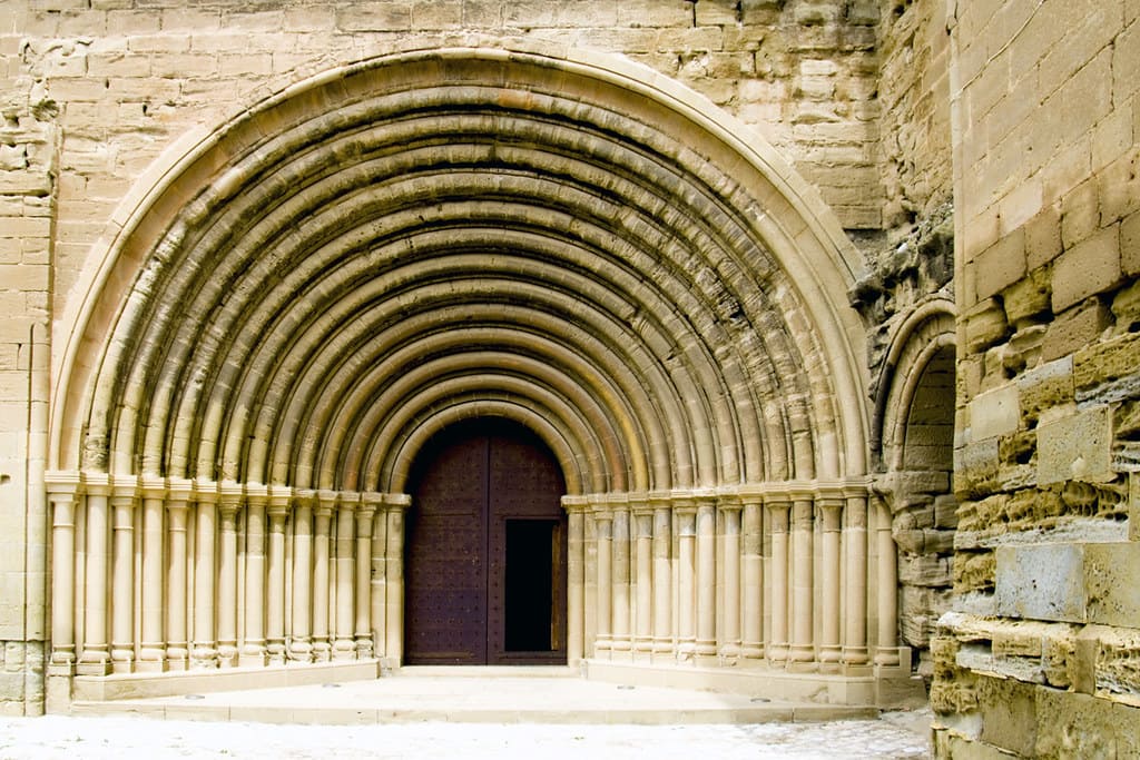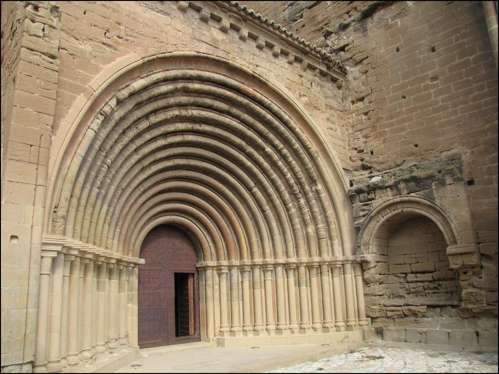Uno de sus elementos más característicos es su impresionante portada, formada por 14 arquivoltas, considerada una de las más complejas del románico español. A lo largo de los siglos, el conjunto sufrió diversas modificaciones, especialmente en el siglo XVIII, cuando se realizaron reformas que alteraron parcialmente la iglesia original.