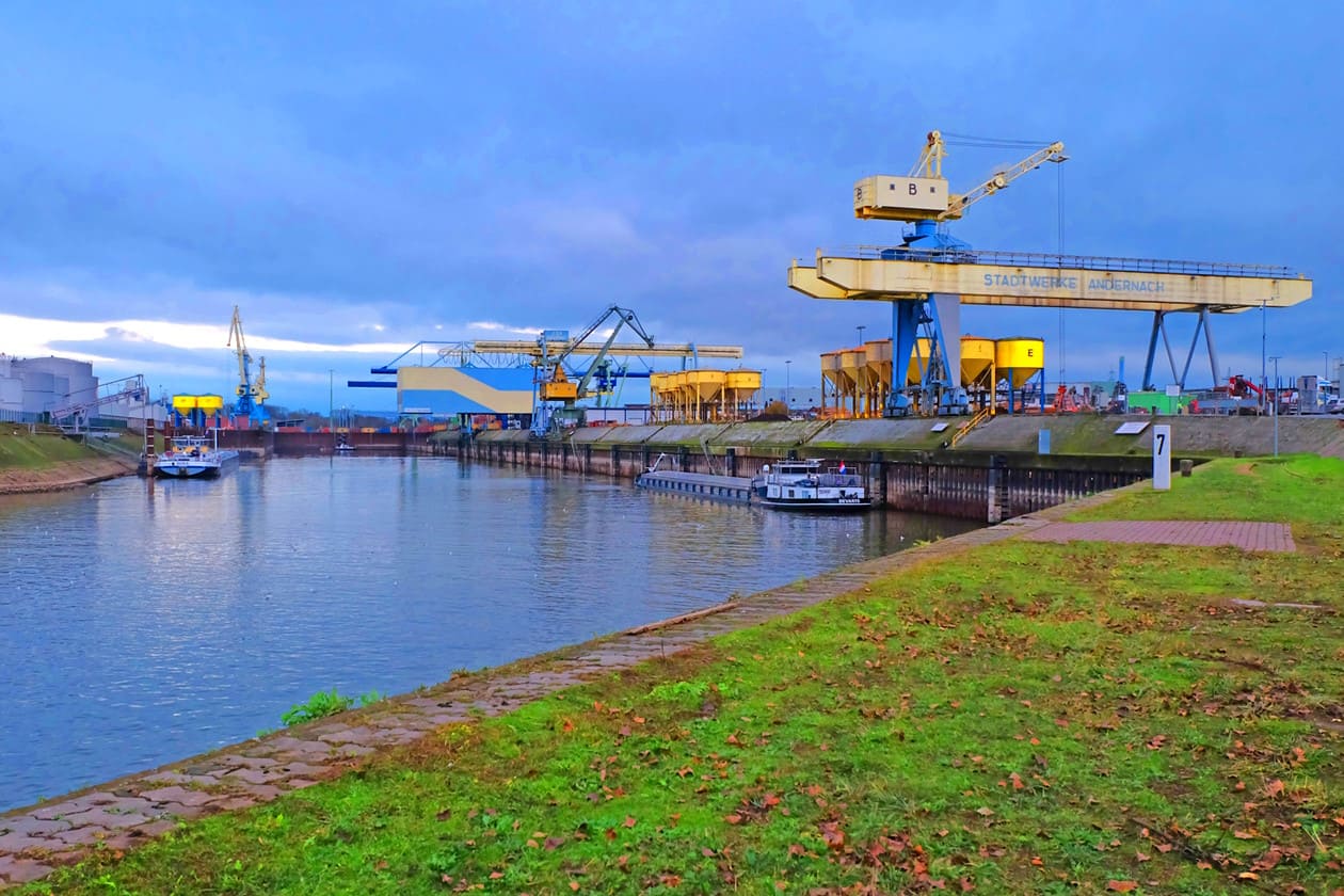 Descripción:Puerto de Andernach: eje logístico en el Medio Rin