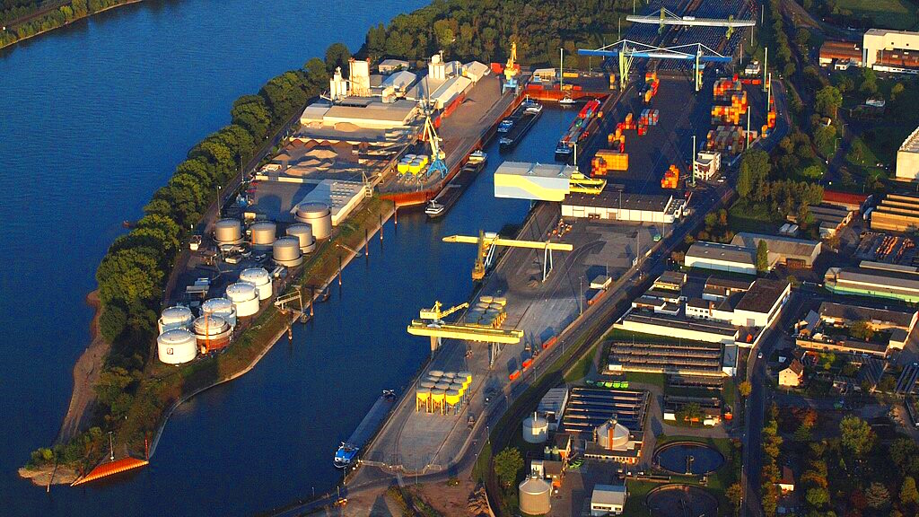 El puerto está compuesto por un stromhafen (puerto fluvial) directamente sobre el Rin y un hafenbecken (dársena portuaria). Ambos ofrecen amplios muelles, áreas de atraque y equipamientos para la carga y descarga de mercancías a granel, contenedores y productos especializados.