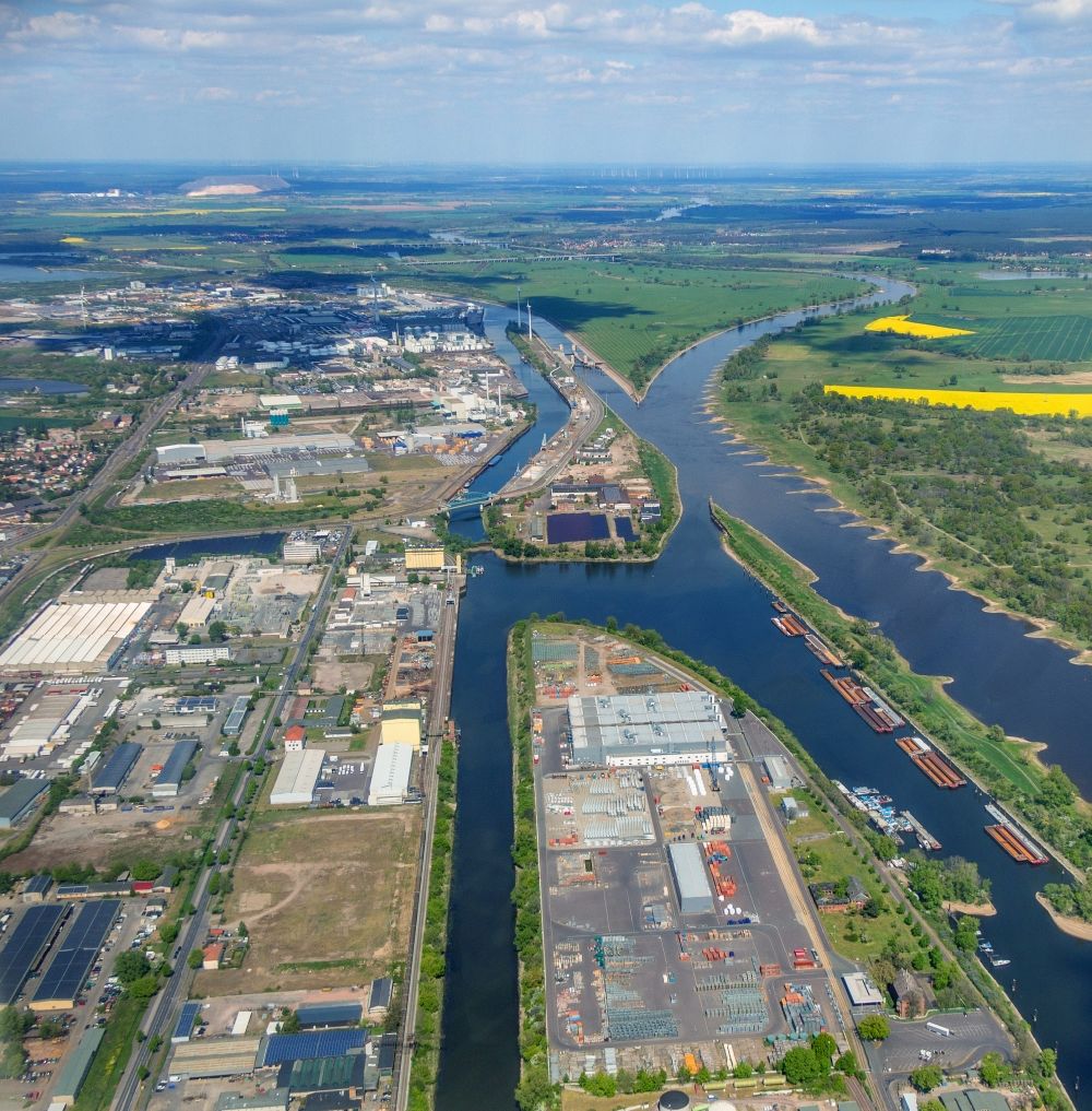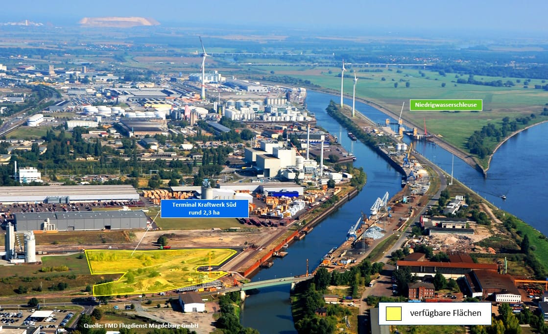 Con su ubicación central en el punto de encuentro del canal Mittelland, el canal Elba-Havel y el Elba, el cruce de vías navegables de Magdeburgo, el puerto ofrece una buena situación de partida para el tráfico de transbordo. Se encuentra en la zona de influencia de los puertos marítimos de Hamburgo y Bremen y, además, está conectado directamente con la A 2, cerca del cruce de autopistas de Magdeburgo (A 14), y cuenta con su propio ferrocarril portuario con conexión a la red ferroviaria en el nudo de Magdeburgo. Al sur de Magdeburgo se encuentra el aeropuerto de Magdeburgo-Cochstedt, que cuenta con dos grandes naves de carga para el tráfico aéreo de mercancías y en el que se ha creado una zona industrial y comercial de 68 hectáreas gracias a nuevas inversiones.
