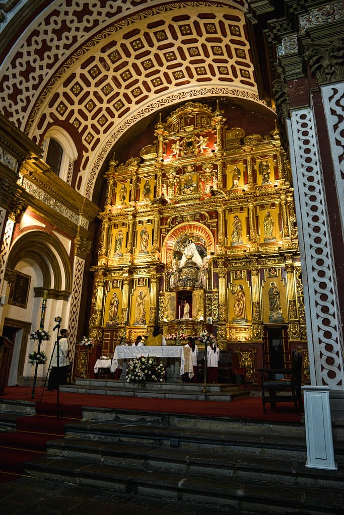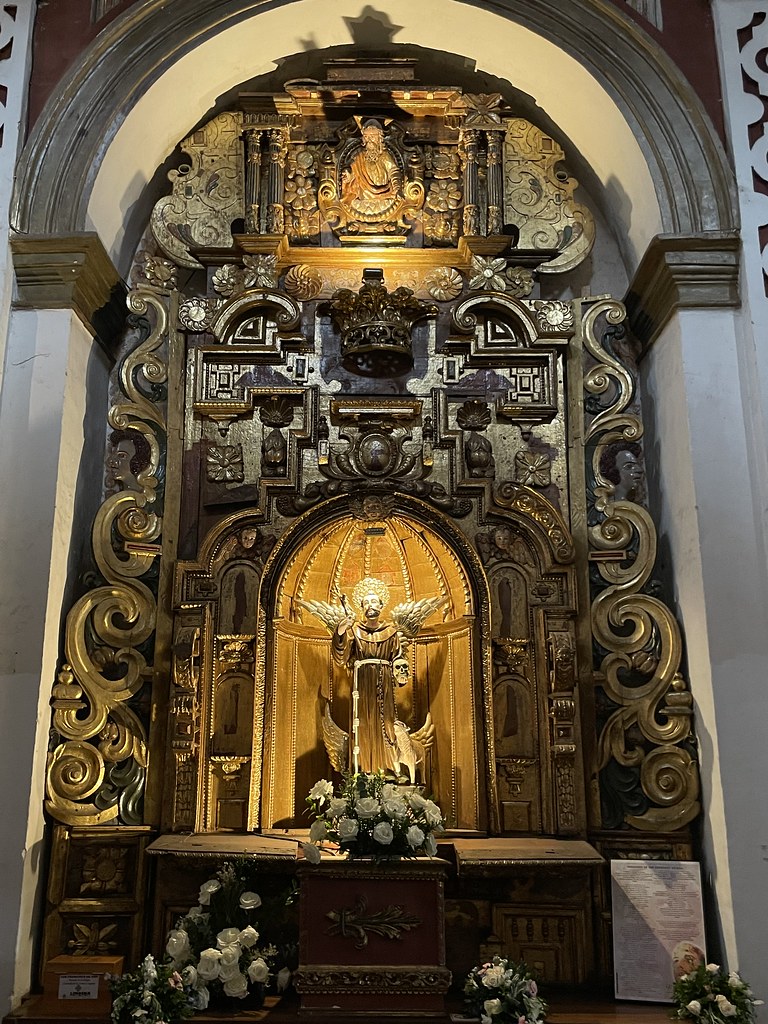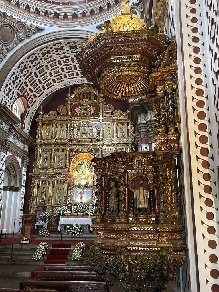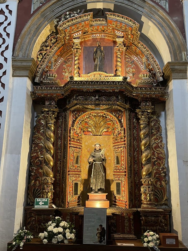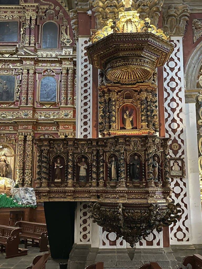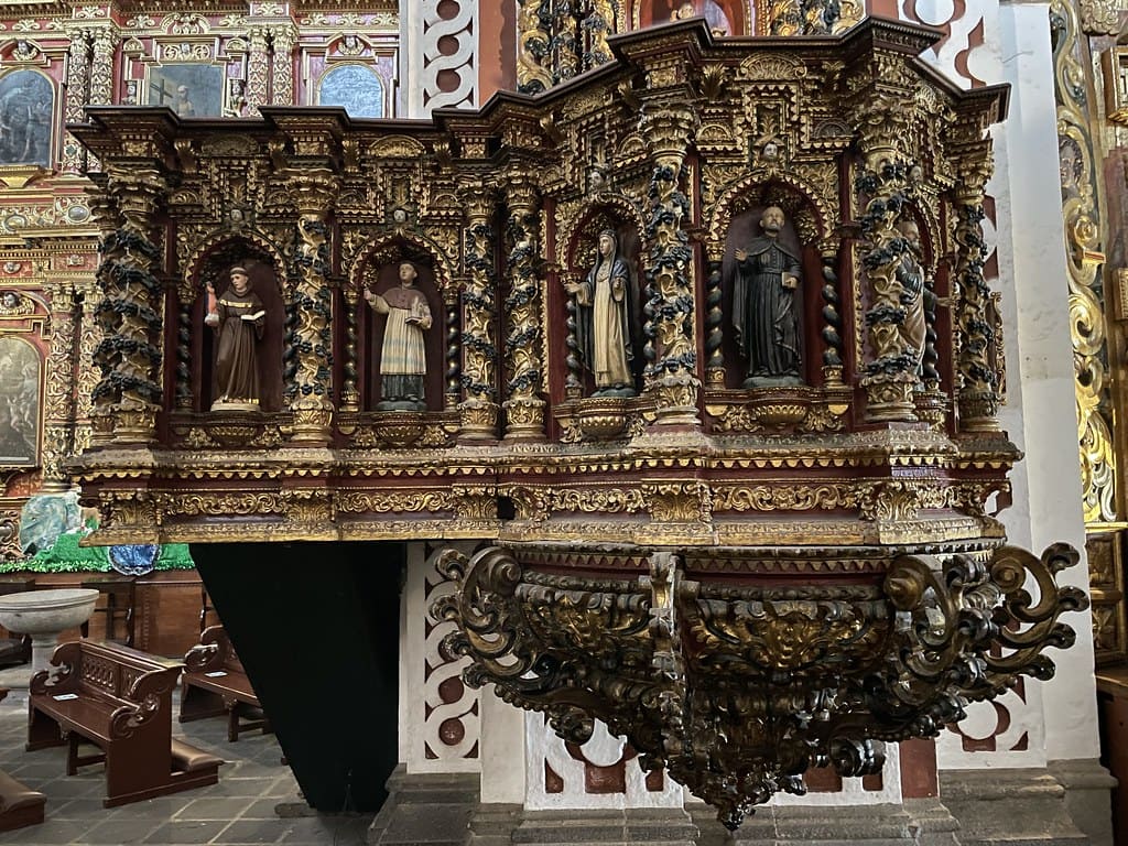 Destaca el púlpito barroco, considerado uno de los más importantes de América Latina, ricamente decorado con columnas salomónicas, nichos y esculturas policromadas.