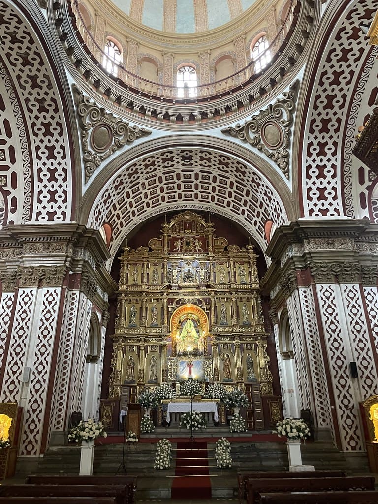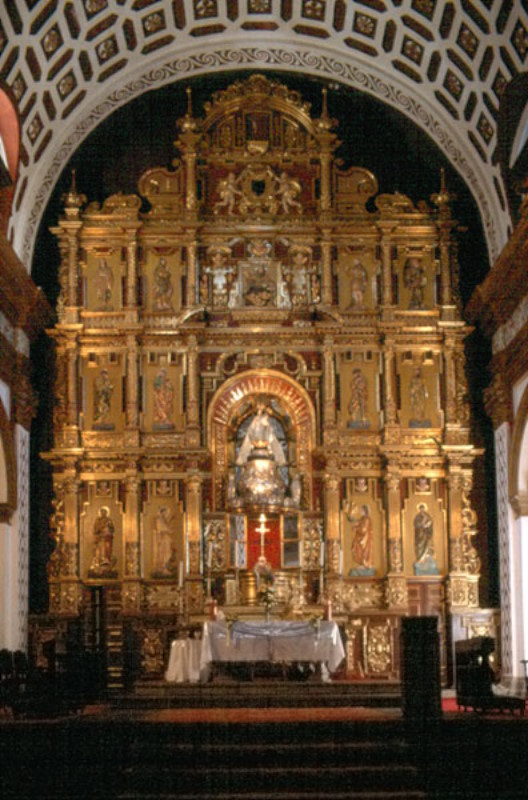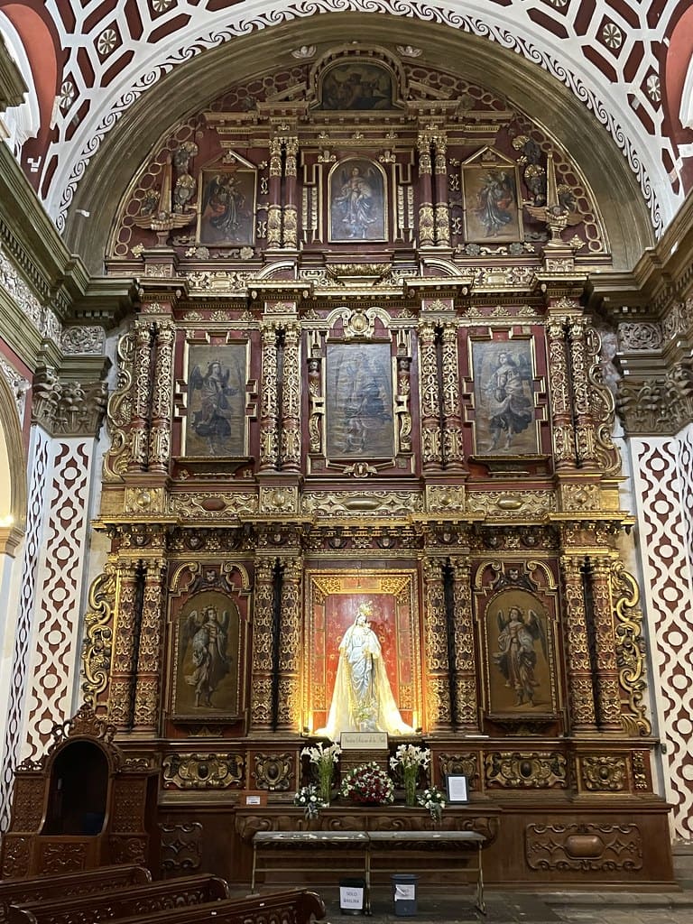 La ornamentación combina elementos barrocos y mudéjares, con yeserías y detalles que reflejan la fusión cultural propia del período colonial.