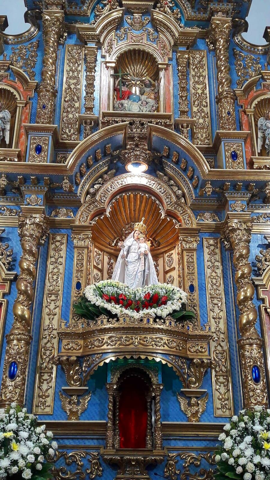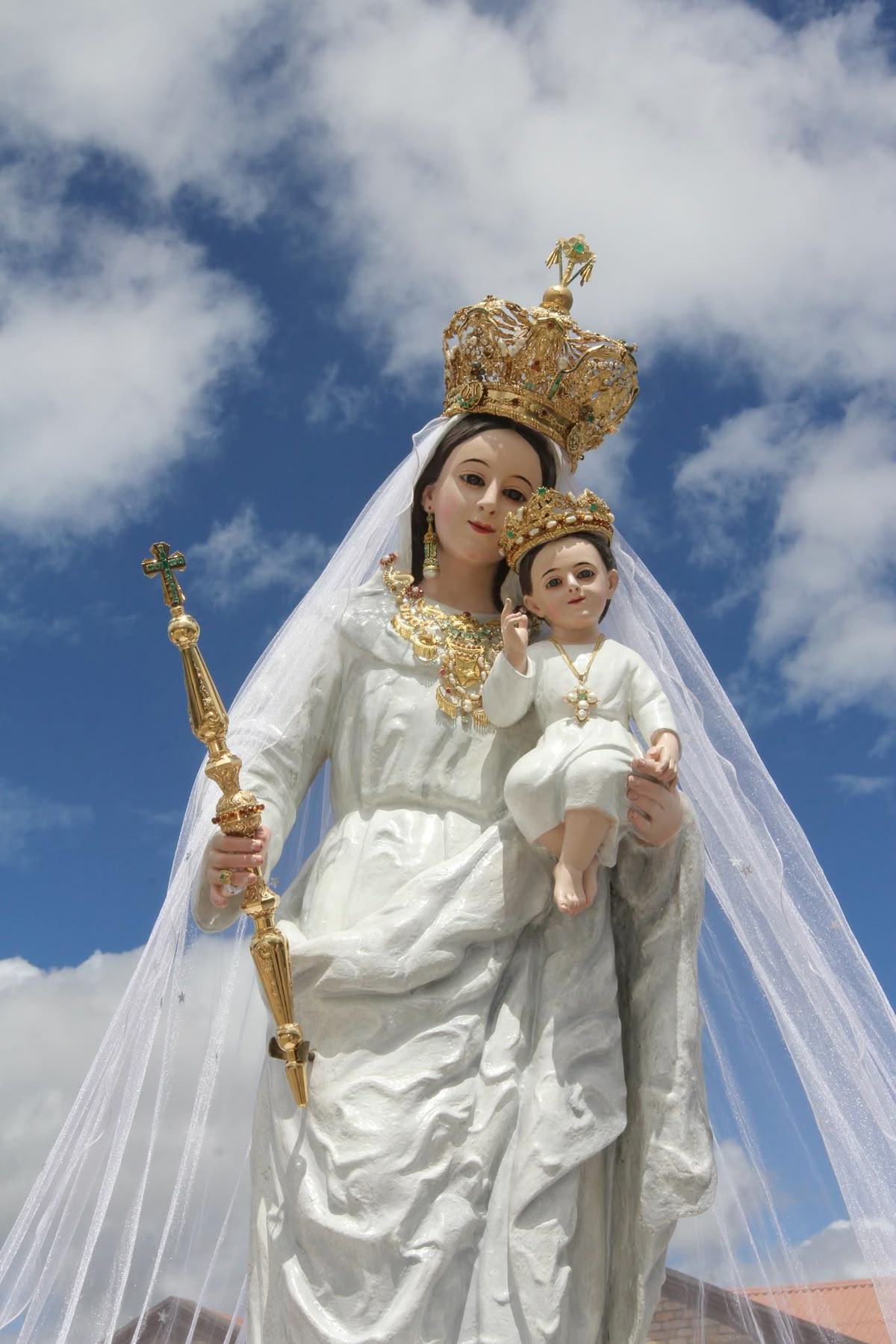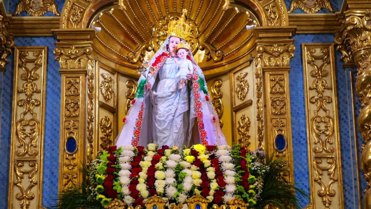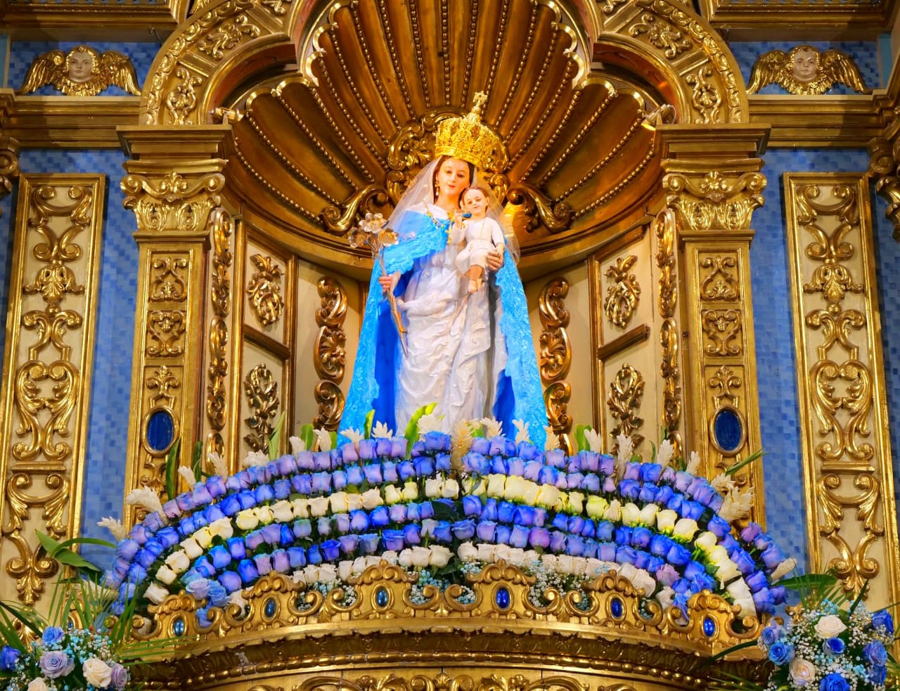 Esta representación resalta tanto la maternidad divina de María como su presencia protectora sobre los fieles.