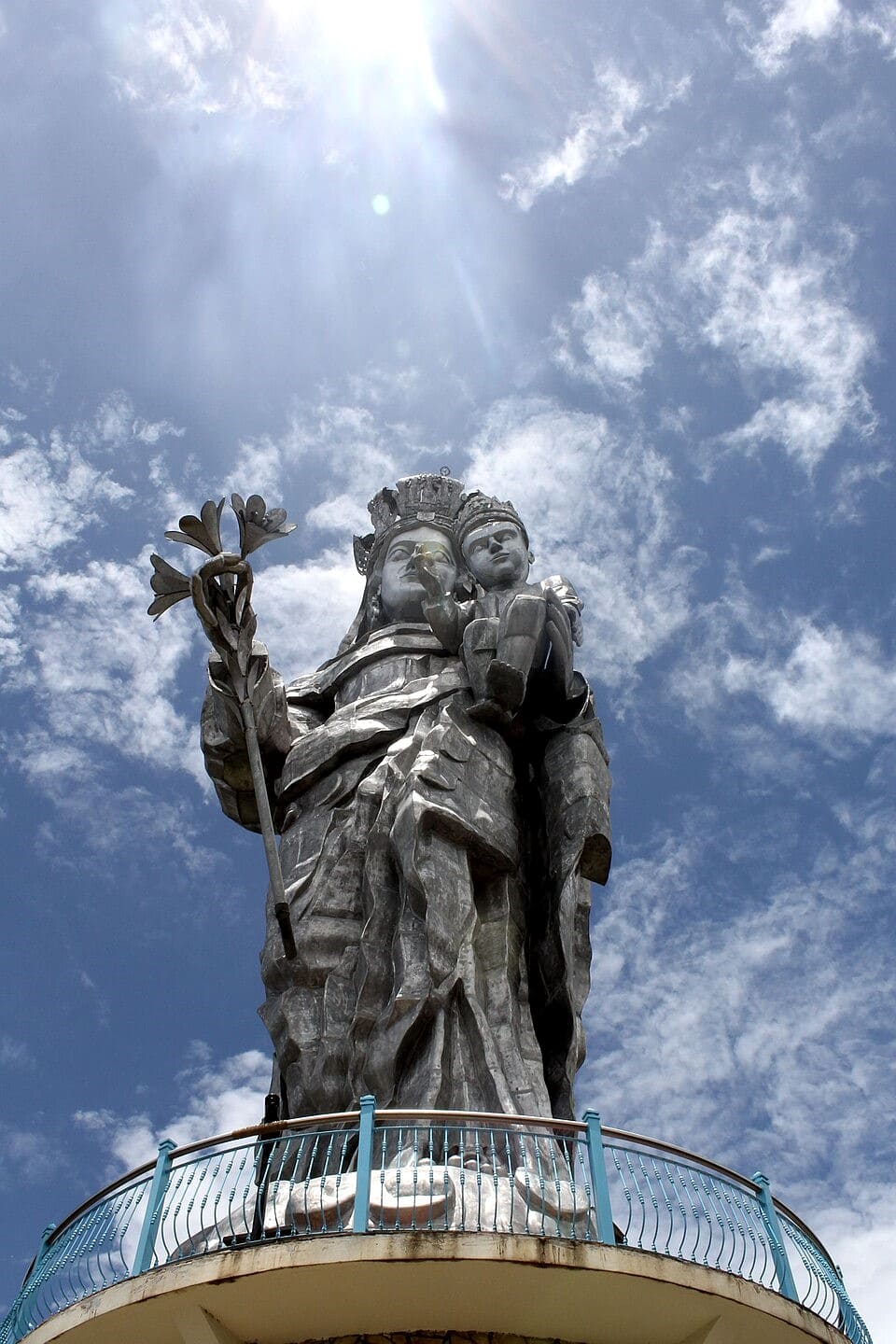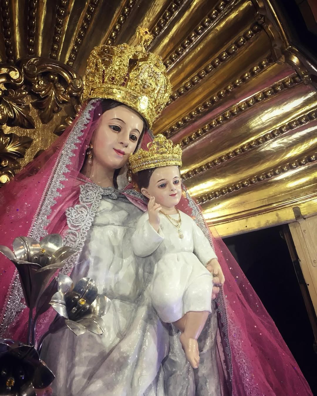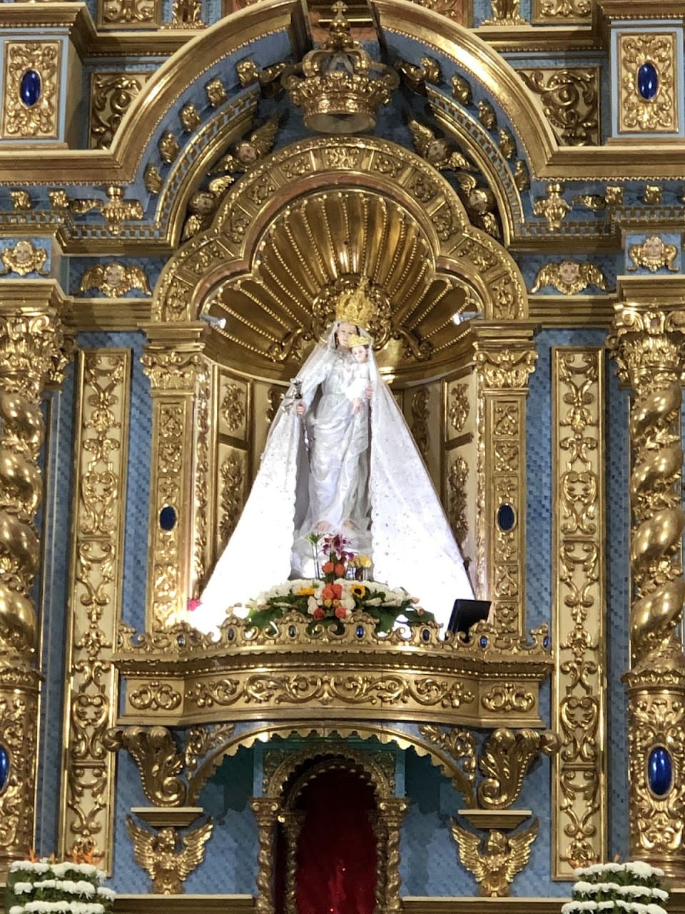 Esta representación resalta tanto la maternidad divina de María como su presencia protectora sobre los fieles.