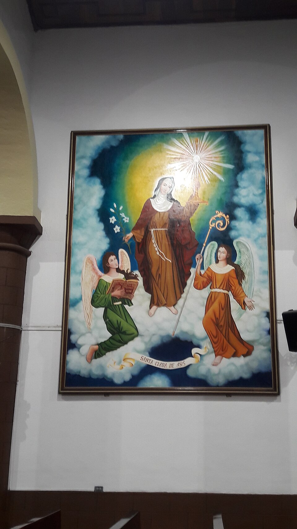 Se apoya sobre una nube y la luna, símbolos de su pureza y cercanía con el cielo.