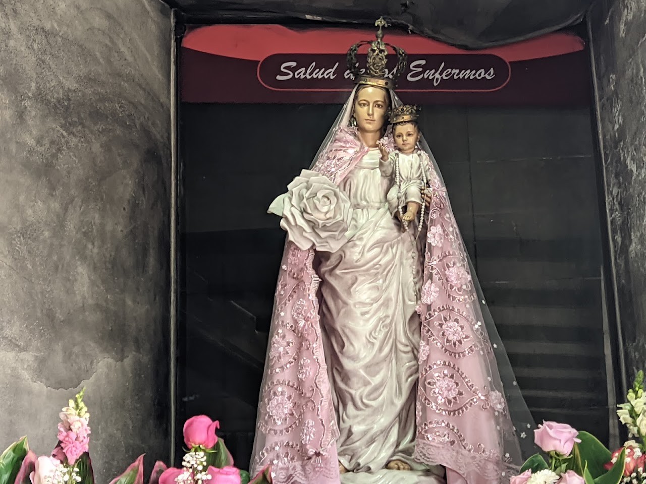 En el brazo izquierdo carga al Niño Jesús.