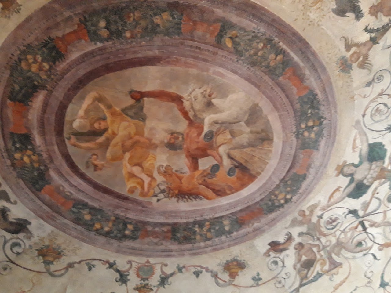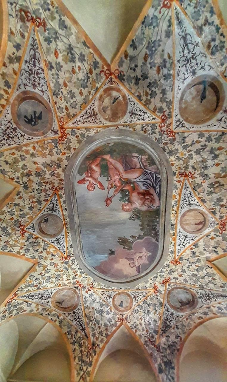 El frente principal presenta un pórtico sobre columnas, lo que le da un carácter casi monumental aunque adaptado al contexto de residencia de campo. Los interiores conservan decoraciones pictóricas: frescos con motivos mitológicos, jardines fantásticos, vid, uvas, etc.